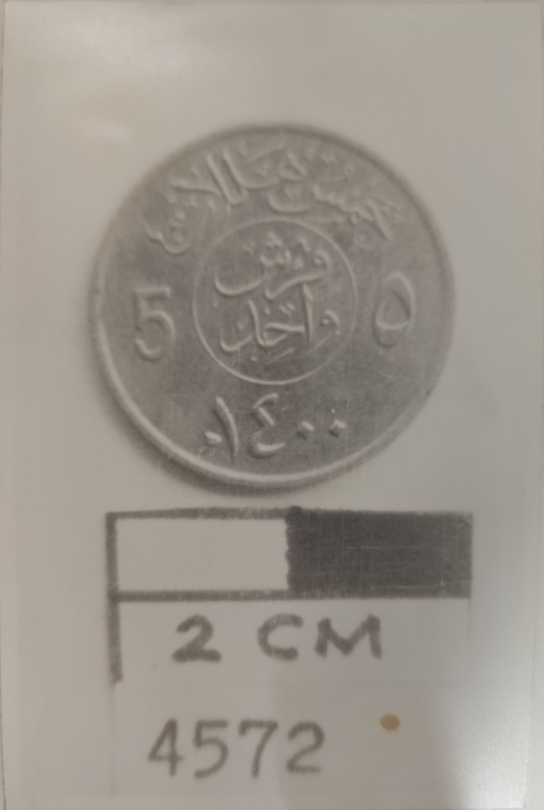 Terbuat dari bahan logam monel, berbentuk bulat. Pada sisi muka bagian tepi terdapat tulisan Arab "KHAMSU HALLALLAH", pada bagian tengah dalam lingkaran terdapat tulisan Arab "PERSEN WACHID" dan angka 5 (lima), serta angka lima Arab, sedang bagian bawah terdapat angka tahun Arab 1400. Pada sisi belakang bagian tepi terdapat tulisan Arab "KHOLIDI ABDUL ARIS AL-SU'KUN, MALIKUL MIMMALIKAH, AL AROBIYAH AL SU'UDIYAH. Sedang bagian tengah bergambar dua buah pedang menyilang dan pohon kurma di atasnya. Fungsi mata uang ini sebagai alat tukar atau alat pembayaran yang sah di Negara Arab. Mata uang ini berjumlah satu keping.