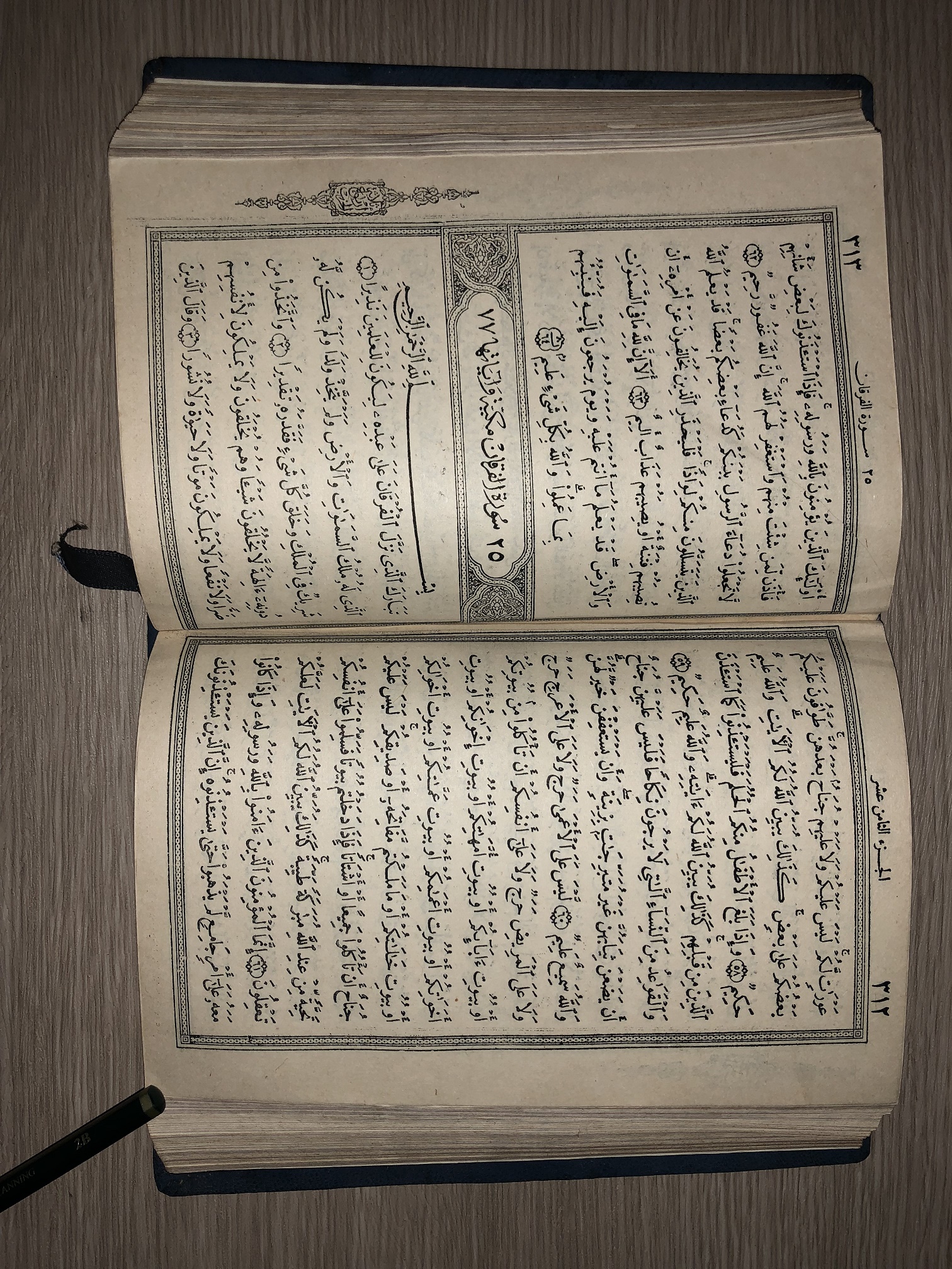 Mushaf ini merupakan mushaf modern, penulisan teks telah menggunakan teknologi modern. Diterbitkan pada tahun 1391 Hijriyah oleh Penerbit Darul Nushaf Syirkah Maktabah di Mesir. Mushaf ini memiliki ornamen Iluminasi Merah berukir, dengan covernya berwarna Biru Tua. Teks tulisan menggunakan bahasa Arab, berjumlah 600 halaman.
