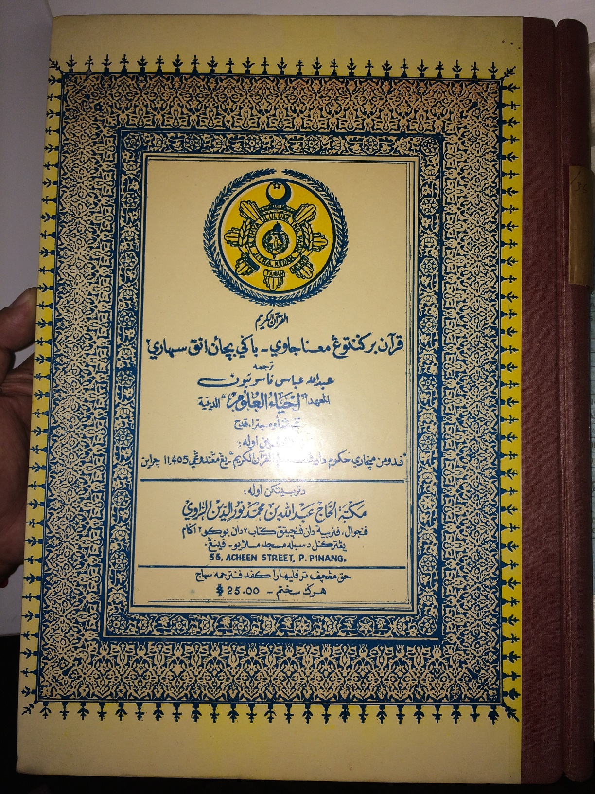 Mushaf ini merupakan mushaf modern, penulisan teksnya telah menggunakan teknologi modern. Diterbitkan oleh Penerbit Maktabah Al-Hajj Abdullah bin Muhammad Nuruddin Ar-Rawiy pada tahun 1968 di Pulau Penang-Malaysia. Sedang Terjemah teks ini diterjemahkan oleh Abdullah Abbas Nasution. Mushaf ini tidak memiliki ornamen, namun covernya berwarna Kuning Abu-abu. Teks tulisan menggunakan bahasa Arab dan terjemah bahasa Melayu, berjumlah 522 halaman.