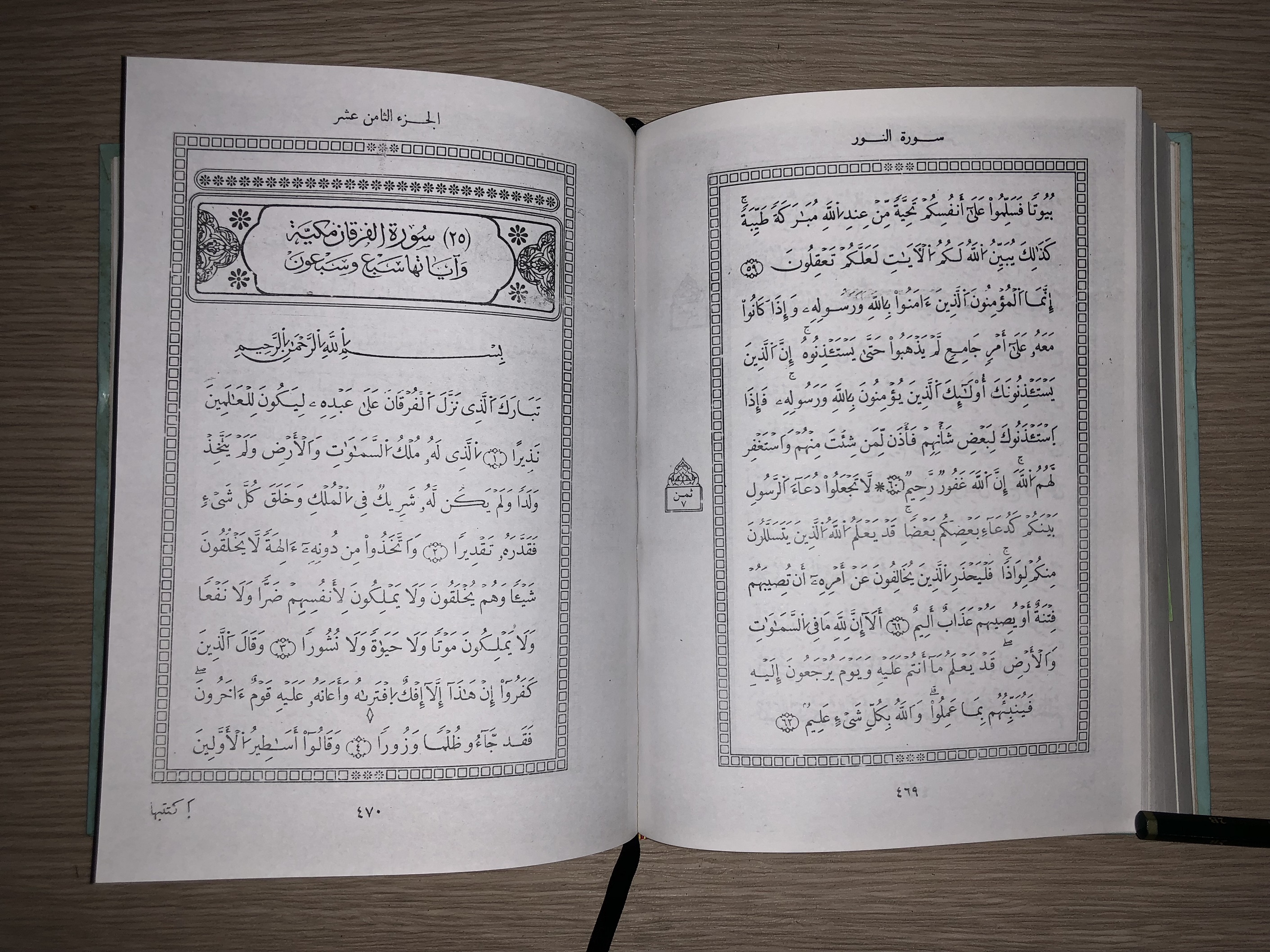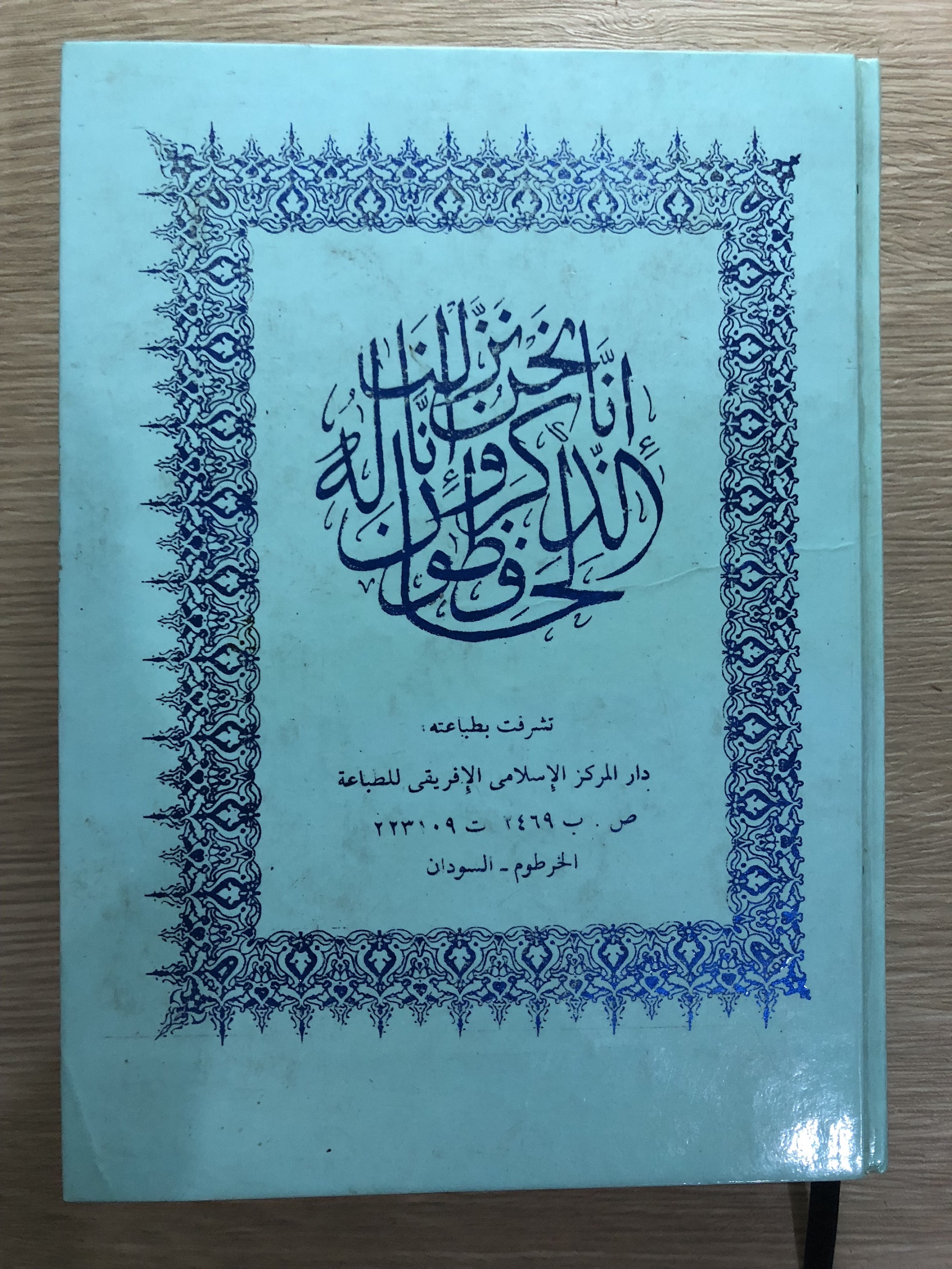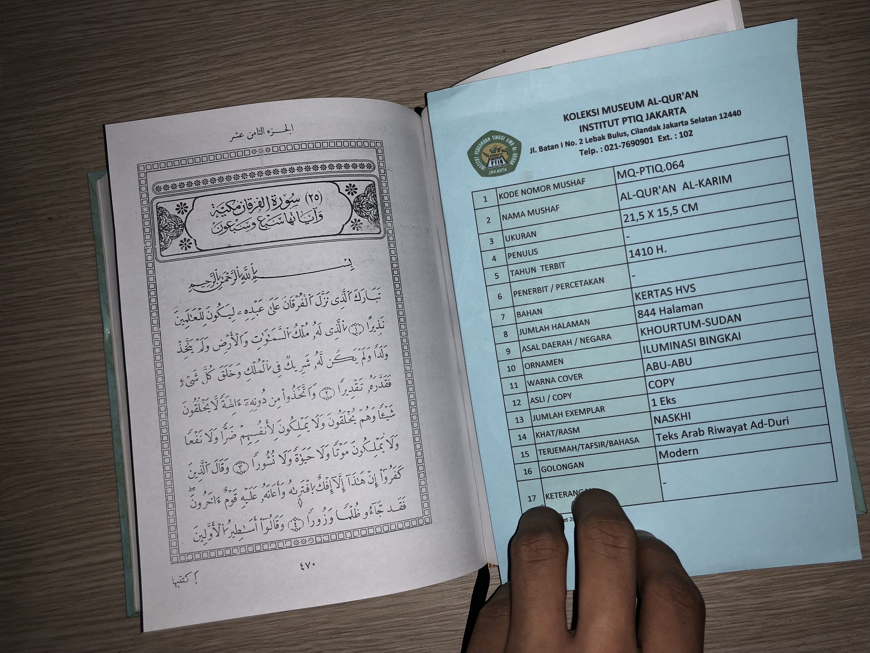 Mushaf ini merupakan mushaf modern, penulisan teksnya telah menggunakan teknologi modern. Mushaf ini diterbitkan pada tahun 1410 Hijriyah, namun tidak diketahui penerbitnya. Mushaf ini memiliki ornamen Iluminasi Bingkai, dan covernya berwarna Abu-abu. Teks tulisan menggunakan bahasa Arab dengan Riwayat Ad-Duri berjumlah 844 halaman. Mushaf ini merupakan replika (Copu Cetakan).