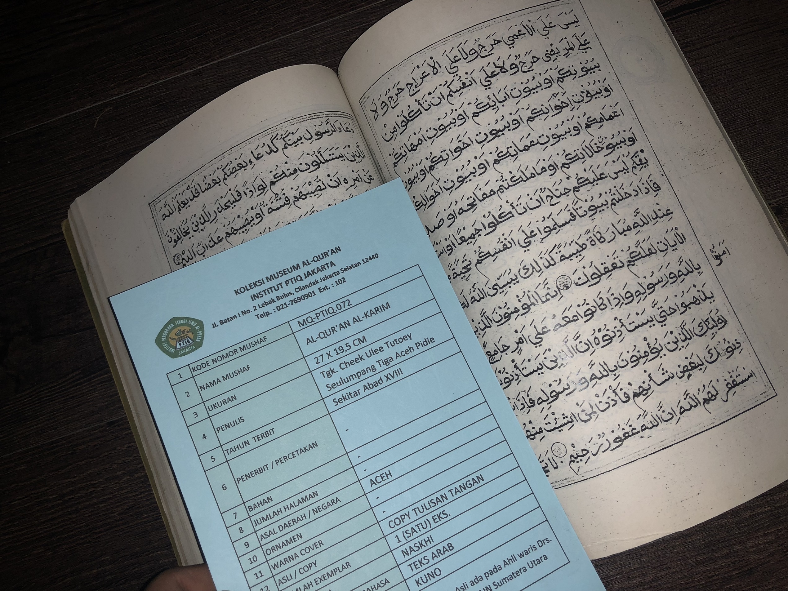 Mushaf ini merupakan mushaf Kuno, karena teks Arabnya merupakan tulisan tangan. Mushaf ini ditulis oleh Tgk. Cheek Ulee Tutoey Seulumpang Tiga Aceh Pidie, sekitar Abad XVIII. Mushaf ini tidak memiliki ornamen, dan tidak ada covernya. Teks tulisan menggunakan bahasa Arab. Mushaf ini merupakan Replika (Copy Tulisan tangan), sedangkan Naskah Aslinya ada pada Ahli Waris Drs. H. Hasbi AR IAIN Sumatera utara.