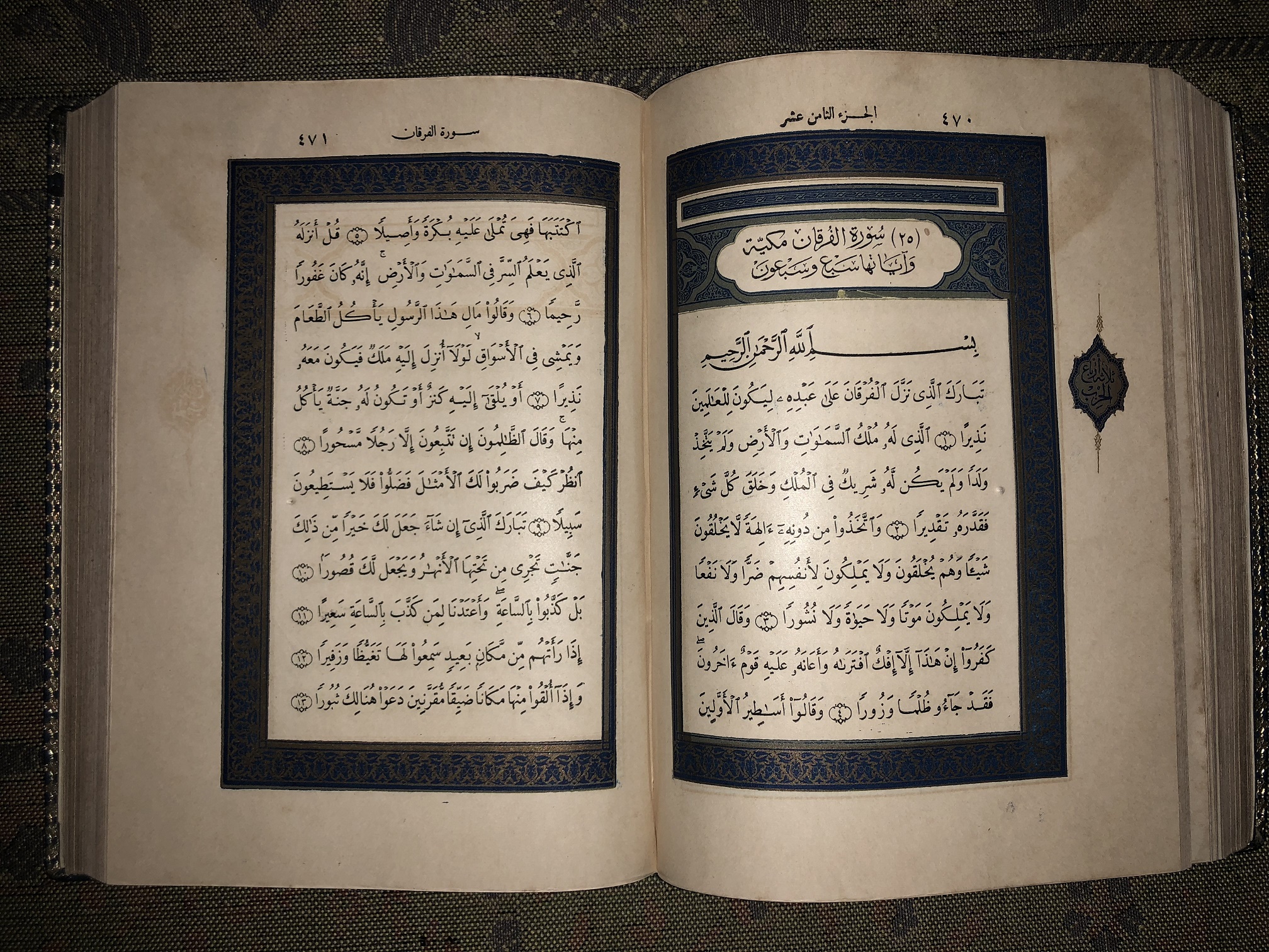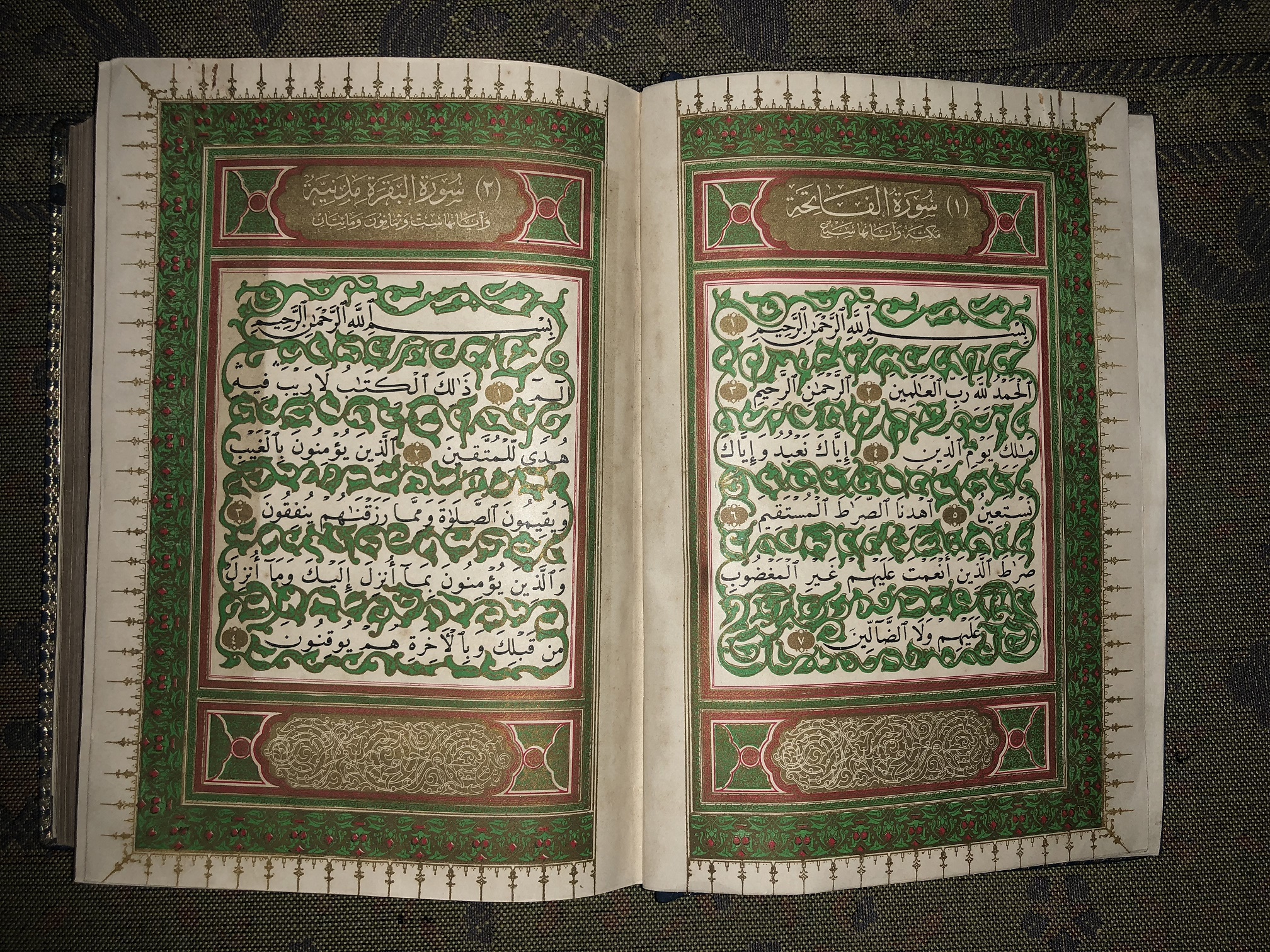 Mushaf ini merupakan mushaf modern, penulisan teksnya telah menggunakan teknologi modern. Mushaf ini diterbitkan oleh Penerbit Al-Maktabah Al-Mishriyah Mesir pada tahun 1924. Mushaf ini memiliki ornamen Iluminasi Berukir warna Hijau, dan covernya berwarna Putih-Berukir. Teks tulisan menggunakan bahasa Arab berjumlah 827 halaman.