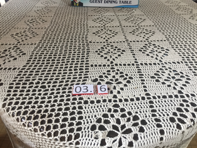 Alas meja dengan ukuran besar dan panjang, terbuat dari benang yang dirajut dengan motif geometri dan flora bunga-bunga. Alas meja ini berwarna putih/kream dan berfungsi untuk alas atau menutup meja makan. Ini adalah salah satu kearifan lokal masyarakat Minangkabau yang berawal dari mengisi waktu luang sambil duduk-duduk merenda hingga saat ini masih banyak hasil karya pekerjaan tangan (handycraft) yang hadir ditengah modernisasi seperti alas meja, bantal kursi, alas kasur, alas tatakan gelas, alas baki, dll. Alas meja ini bukan peninggalan keluarga Bung Hatta akan tetapi merupakan kearifan lokal yang juga dapat menjadi pelengkap dalam penataan ruang pamer di museum, karya perempuan Minang yang sangat unik dan menarik, telah diwariskan turun temurun kepada generasi muda anak keturunannya.