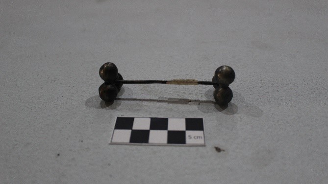 Antefik ini memiliki hiasan kepala manusia dengan raut muka seprti marah di samping itu, juga memiliki hiasan kmari (makhluk khayangan), tubuh barung, yang digambarkan berupa bentuk sayap di bagian belakangnya, kedua tangan diangkat ke atas dengan posisi telapak tangan terbuka ke atas, memakai anting - anting (kundala), kalung (hara).