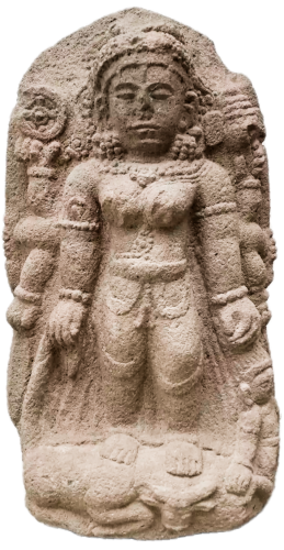 Arca digambarkan posisi berdiri dalam abhangga di atas lapik berupa lenbu yang menjadi satu dengan stela, menggunakan mahkota jenis kuitamakuta, memiliki tangan berjumlah delapan.