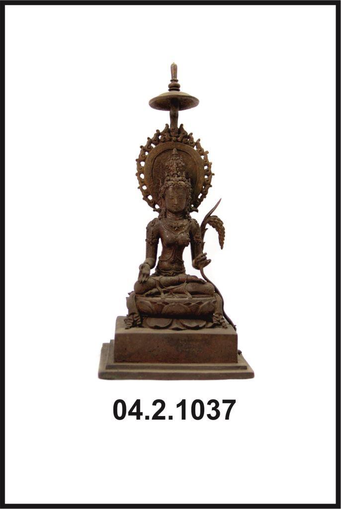 Warna kecokelatan, mahkota tinggi, anting-anting, kelat bahu, gelang, kalung, hiasan dada, sabuk, kain jarik, selendang, ucal. Duduk bersila dengan tangan kiri membawa setangkai padi di belakang bahu dan tangan kanan terletak di lutut kiri dengan telapak tengadah. Fungsi: Sebagai alat upacara agama Hindu Guna: Untuk perlengkapan alat upacara agama Hindu Teknik: cetak