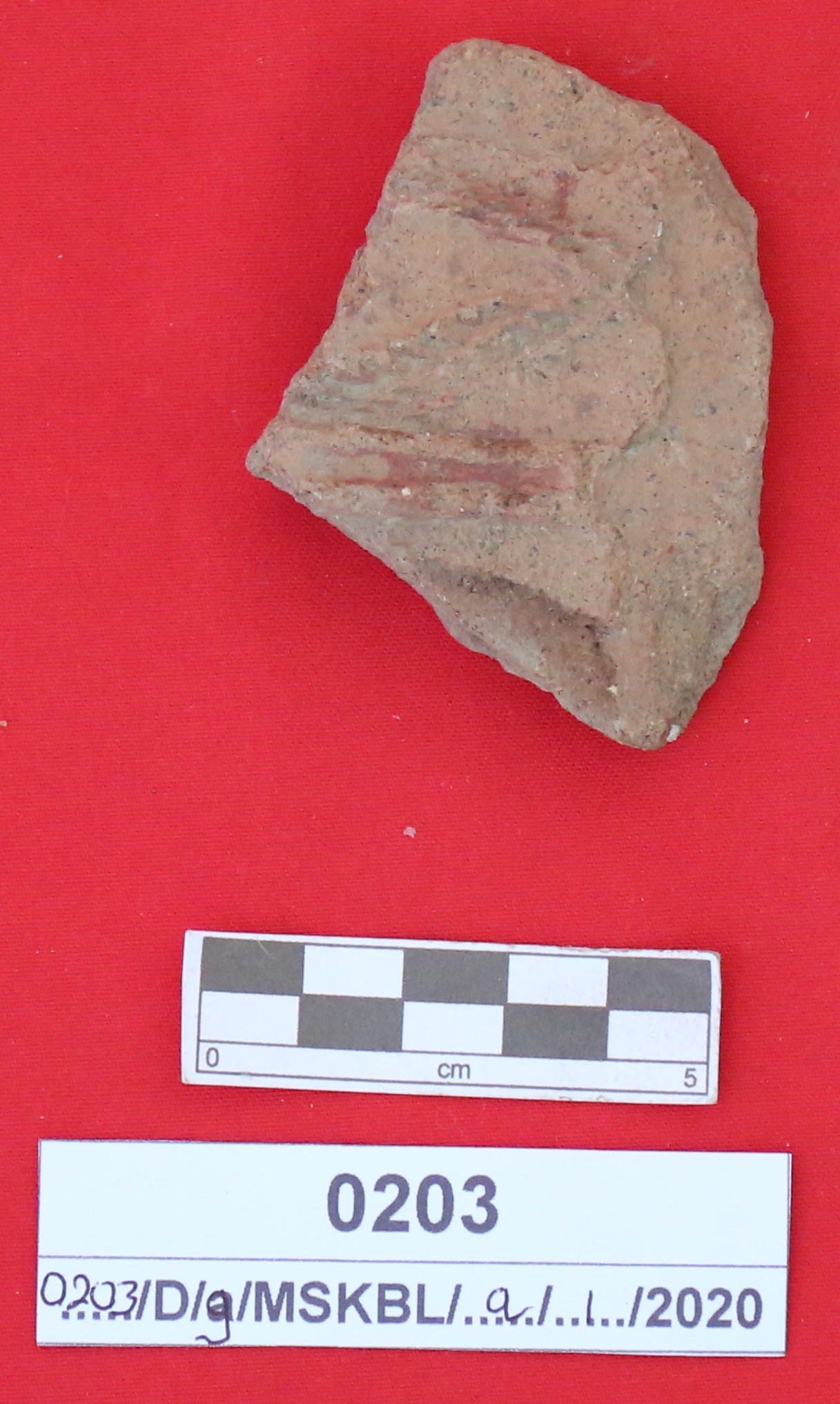 Arca dwarapala berada di atas lapik padma ganda dalam posisi berlutut. Arca memakai jamang didepan dahi berhiaskan kelopak bunga suluran di tengah dan di atas pelipis kanan kiri arca berpadu dengan hiasan bulatan-bulatan. Alis mata digambarkan tebal, bagian tengah dahi diantara kedua alis terdapat satu hiasan kelopak bunga. Mata melotot, hidung mancung. Gigi bagian depan terlihat keluar dan bertaring. Menggunakan perhiasan di telinga berupa anting berbentuk bulatan bergaris memutar. Terdapat dua Hara (kalung) yaitu berhiaskan kelopak bunga di tengah membentuk liontin dipadu dengan hiasan sulur yang secara umum kalung berbentuk simbar meruncing ke bawah dan satu kalung bermotif bulatan. Bagian tangan mengenakan perhiasan berupa Kana (gelang) motif bulatan berjajar melingkar dan Keyura (kelat bahu) dengan motif kelopak bunga sama dengan motif kalung. Perhiasan lainnya berupa Udarabanda (ikat pinggang) dan gelan kaki dengan pola motif hias yang sama dengan kalung. Arca dwarapala dalam posisi berlutut dengan kaki kiri ditekuk ke belakang lutut bertumpu pada lapik. Kaki kanan ditekuk dengan telapak kaki menginjak lapik. Kedua tangan ditekuk memegang gada, tangan kiri memegang pangkal gada sedangkan tangan kanan memegang bagian tengah gada. Gada memiliki dua hiasan berupa pelipit garis melingkar.