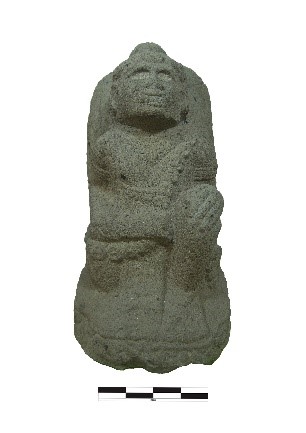 Visualisasi dari dwarapala dalam bentuk arca dengan posisi duduk di atas lapik berbentuk setengah lingkaran, kepala arca digambarkan berambut ikal, pada bagian badan memiliki dua tangan yang mana tangan kanan dalam posisi ditekuk dan memegang gada, sedangkan tangan kiri memegang lutut kaki kiri.