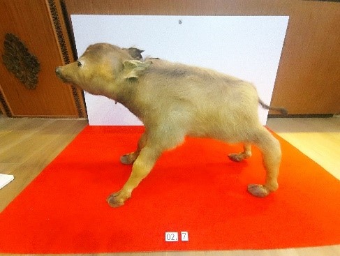 Berwujud seorang laki-laki tua, berdiri di atas lapik bunga padma, bertangan dua, trisula (kana) dan tangan kiri hilang.