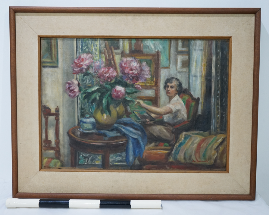 Auto Potrait dans la glace de venise Bret Andre, Jacqueline Seni Lukis 599/SLC 64 x 45 cm Lukisan ini menggambarkan pantulan cermin dari seorang wanita yang sedang melukis sebuah vas berisikan bunga yang beralaskan kain biru di bawahnya. Vas tersebut berada di atas meja kayu berbentuk bunda. Selain itu, terdapat sebuah wadah keramik berwarna biru dan putih yang memiliki alas dan penutup, objek lukisan tersebut menjadi titik fokus dari lukisan ini. Bunga tersebut berwarna merah muda dengan daun warna hijau yang menjuntai ke bawah. Berjumlah 7 bunga, bunga tersebut berada di dalam vas yang berwarna kuning kehijauan, vas bunga tersebut berada di atas meja kayu. Meja berbentuk bundar dengan beralaskan kaca pada bagian atasnya. Meja tersebut berwarna campuran antara cokelat dan cokelat tua, meja tepat berada didepan cermin dan di sampingnya juga terdapat sebuah bantal kursi berwarna dasar putih dengan memiliki pola garis yang berwarna biru, merah, hijau, dan krem. Terdapat cermin besar yang memantulkan setengah dan seisi ruangan, cermin tersebut memiliki bingkai yang bermotif floral dengan paduan warna hijau, buru, dan kuning. Sisi kanan bingkai cermin berwarna lebih gelap. Pantulan dari cermin tersebut memantulkan sekrang wanita yang sedang duduk di sebuah sofa kayu berwarna merah dan hijau. Wanita itu mengenakan pakaian berwarna putih berlengan pendek, ia sedang memandangi objek lukisnya, tangan kanannya sedang melukis sedangkan tangan kirinya memegang sebuah palet cat. Selain seorang wanita, cermin tersebut memantulkan hampir setengah isi ruangan yang berupa interior-interior ruangan seperti lukisan-lukisan yang berada di stand lukis kayu, gorden berwarna putih, dan lukisan lainnya yang berada di dinding. Lukisan ini terbingkai dengan bingkai kayu berwarna coklat tua pada bagian luarnya, sedangkan bagian dalam bingkai terdapat lapisan kanvas berwarna krem.