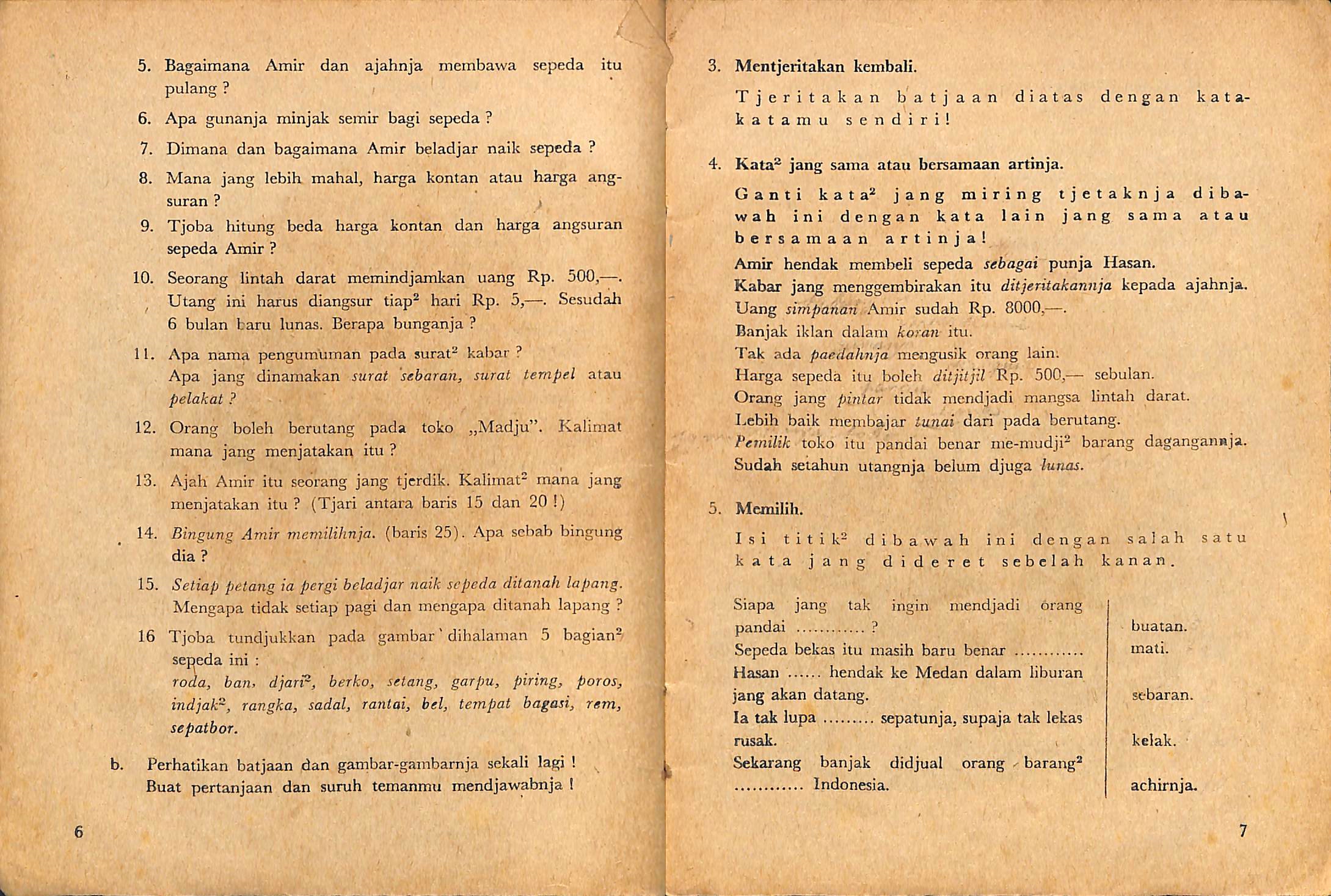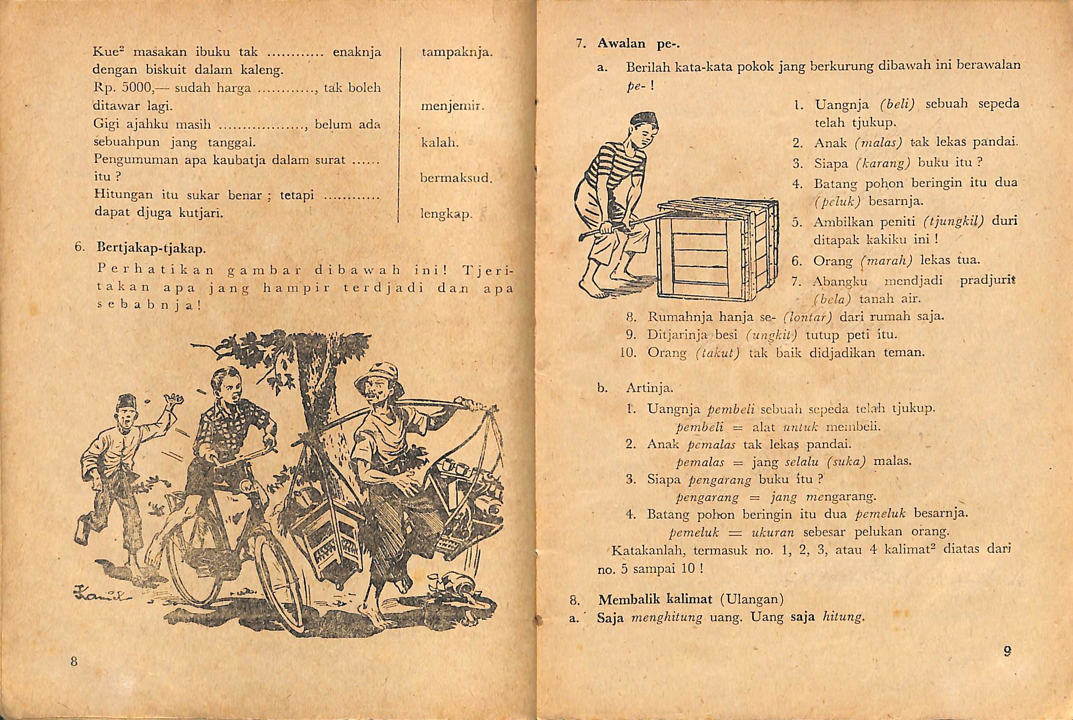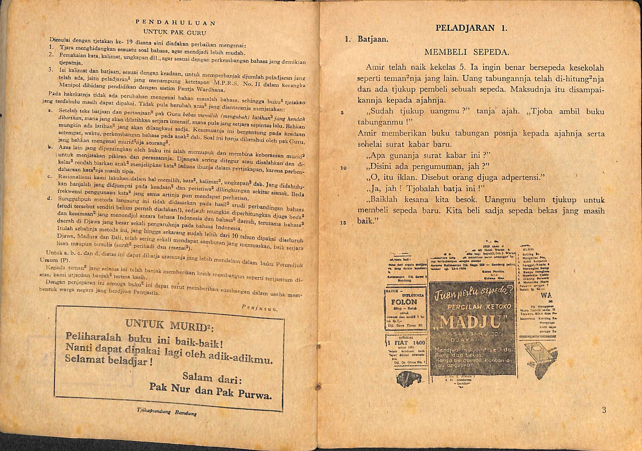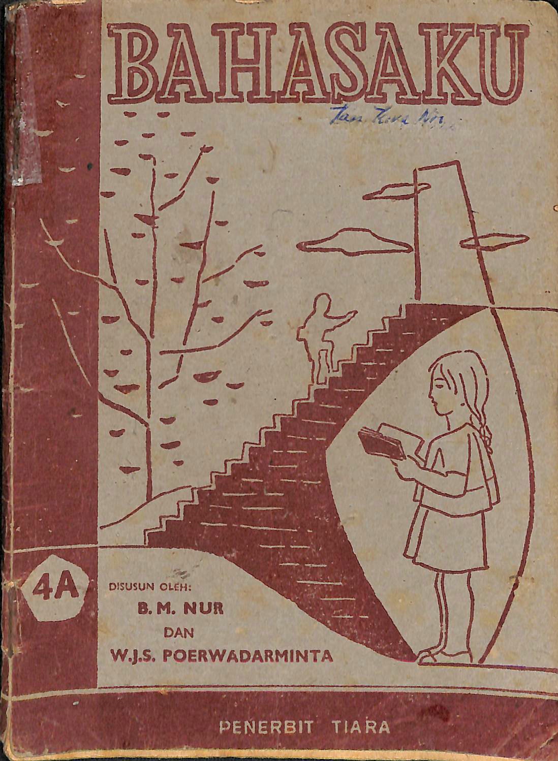 Judul buku Bahasaku 4 A untuk murid kelas V (tengah tahun ke I). Pengarang B.M Nur dan W.J.S Poerwadaminta. Tjetakan ke 5. Tahun terbit 1954. Penerbit W. Versluys N.V. Amsterdam Djakarta.