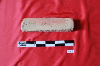 Terbuat dari bahan tanah liat, yang dibakar, berbentuk empat persegi panjang, berwarna merah bata. Berfungsi sebagai batu penyusun dinding Benteng Somba Opu. Keadaan benda cacat/rusak.