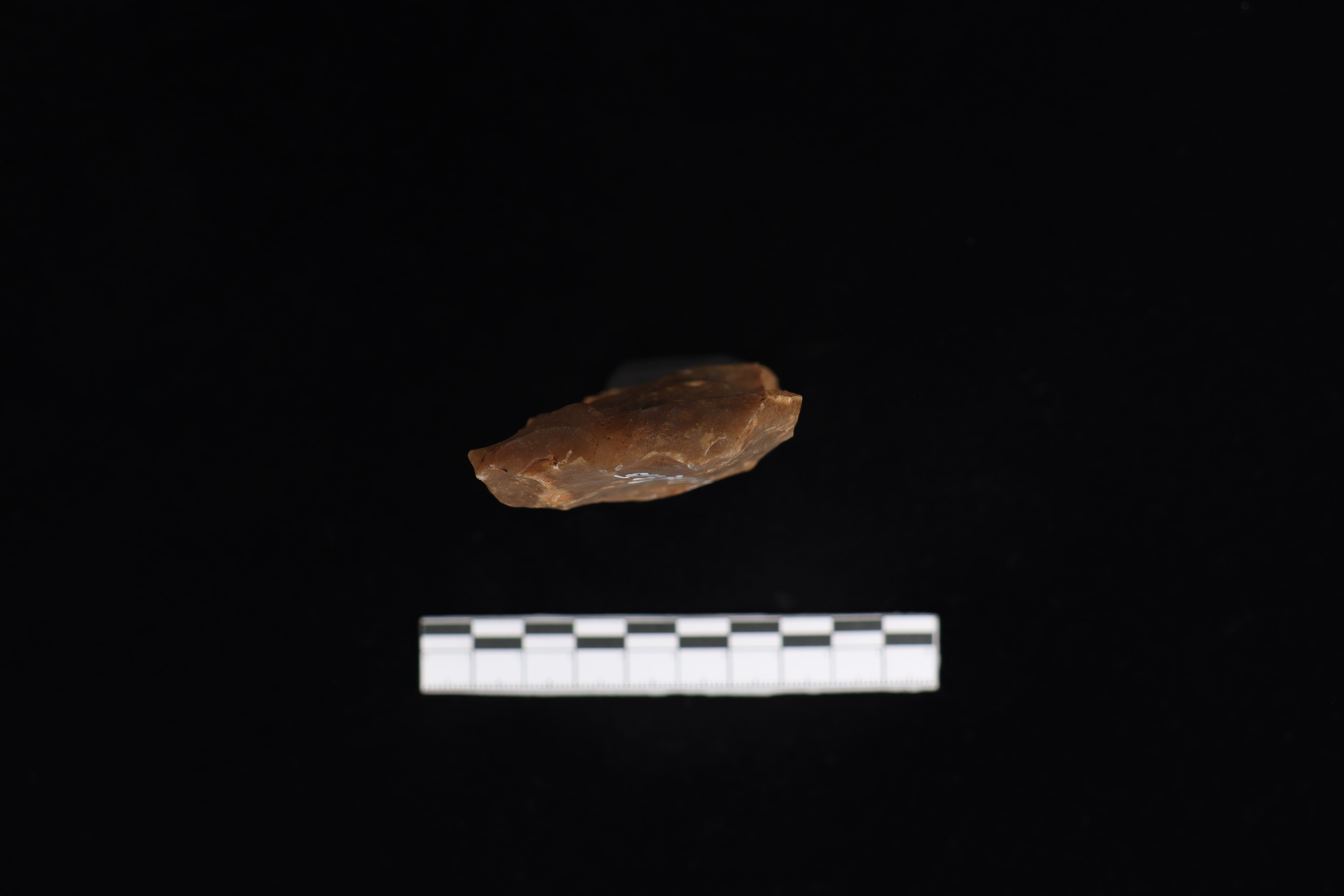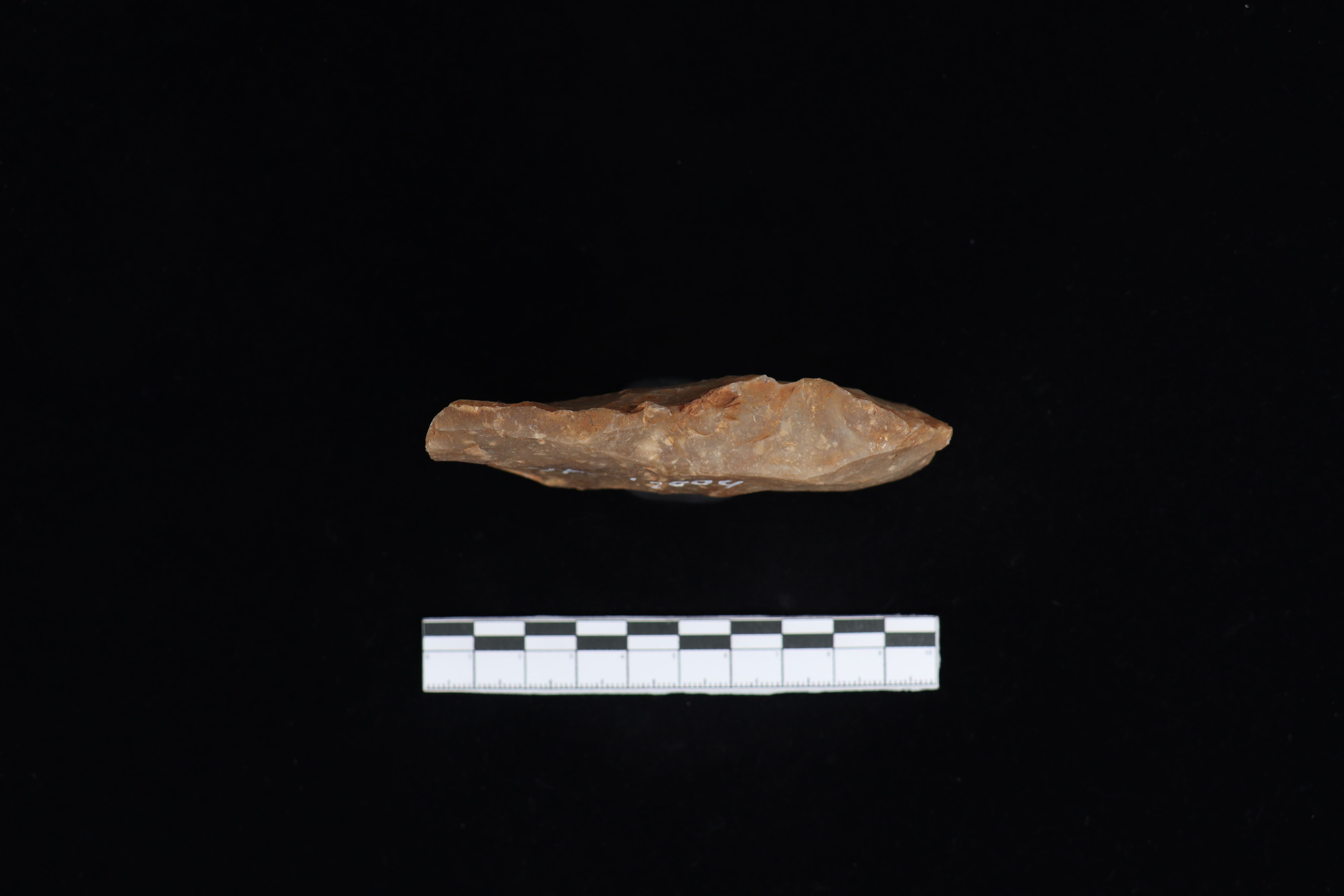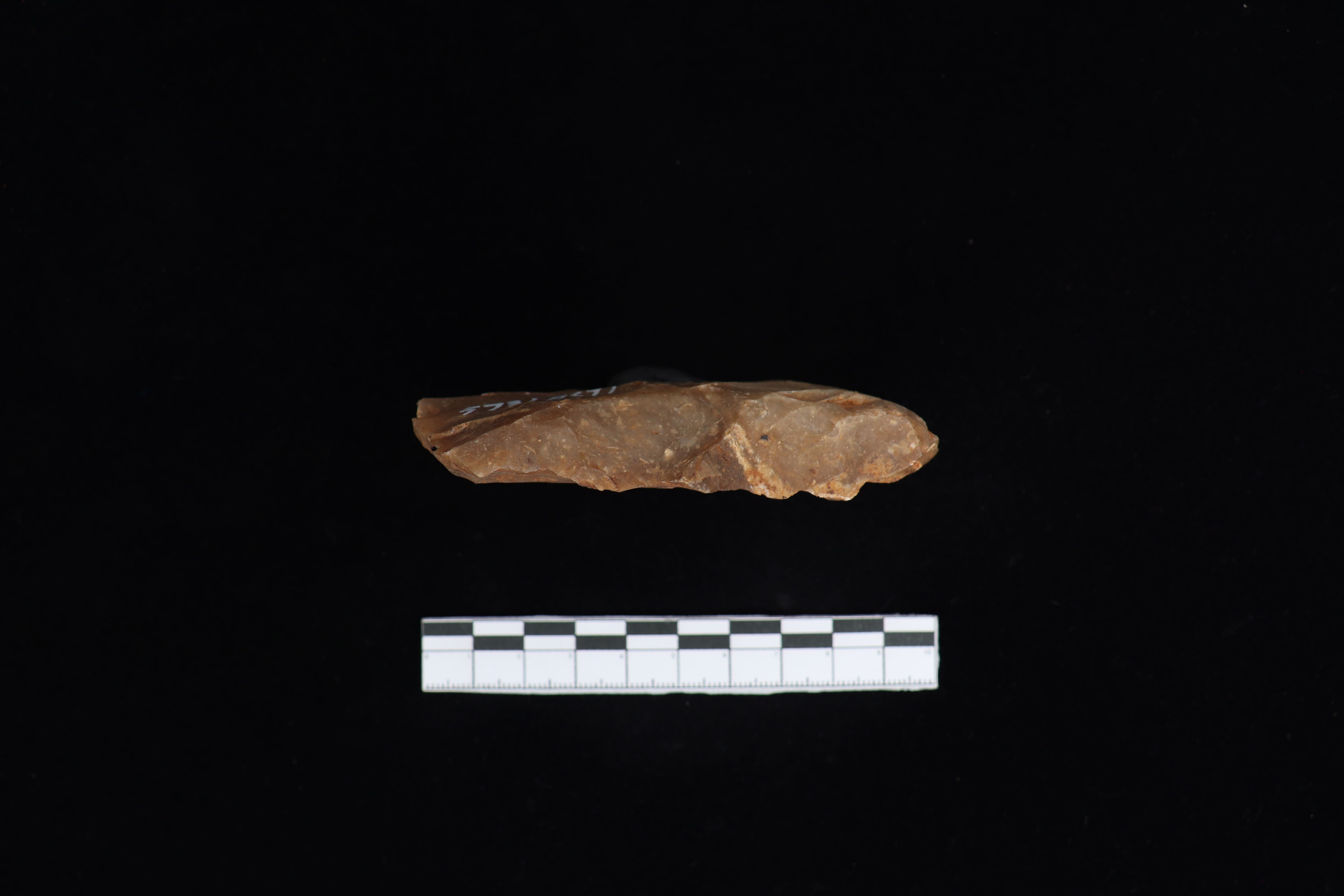 Beliung persegi ini dalam kondisi utuh dan fisik yang baik serta memiliki warna dominan abu-abu. Terdapat sisa residu berupa tanah yang menempel pada koleksi. Pada bidang punggung cenderung datar. Pada pangkal gagang tidak rata namun lancip. Pada bidang bawah terdapat tulisan berwarna putih berukuran cukup besar pada tubuh koleksi dan berbentuk datar. Sisi kiri dan kanan lurus namun sedikit bergelombang. Beliung ini memiliki teknologi penajaman secara monofasial dan belum mendapat perlakuan diupam, namun terlihat jejak pakai di mata tajamaan.
