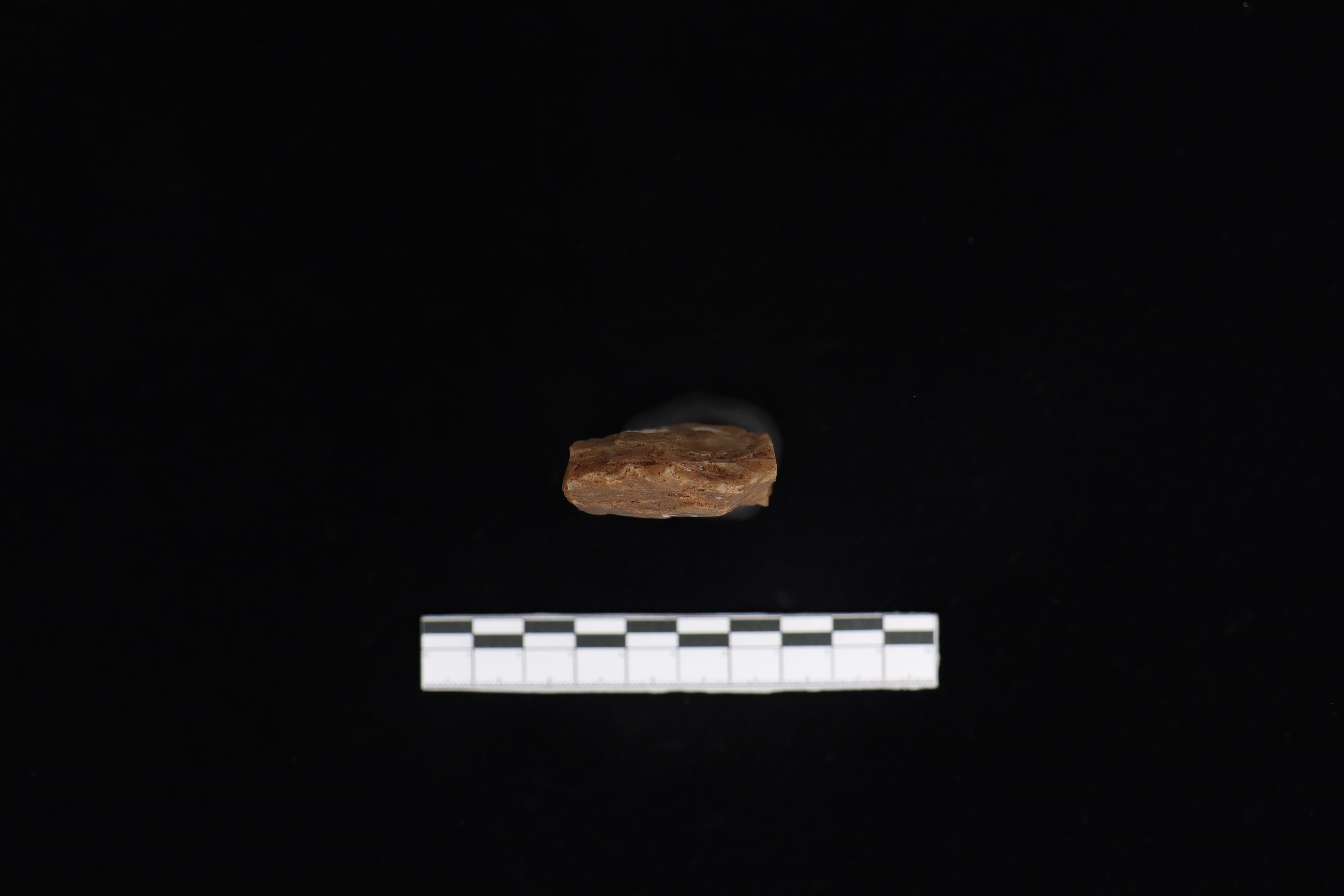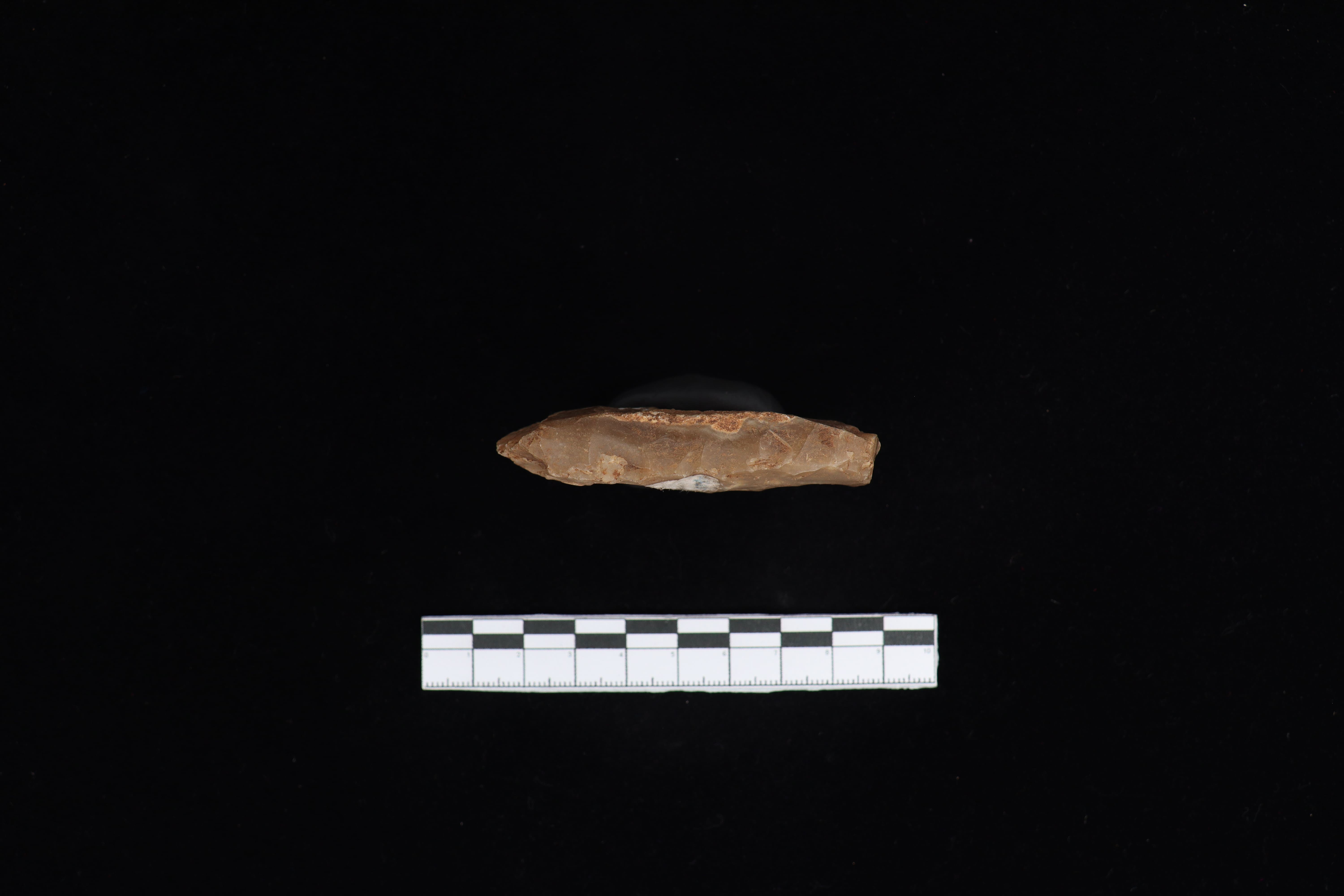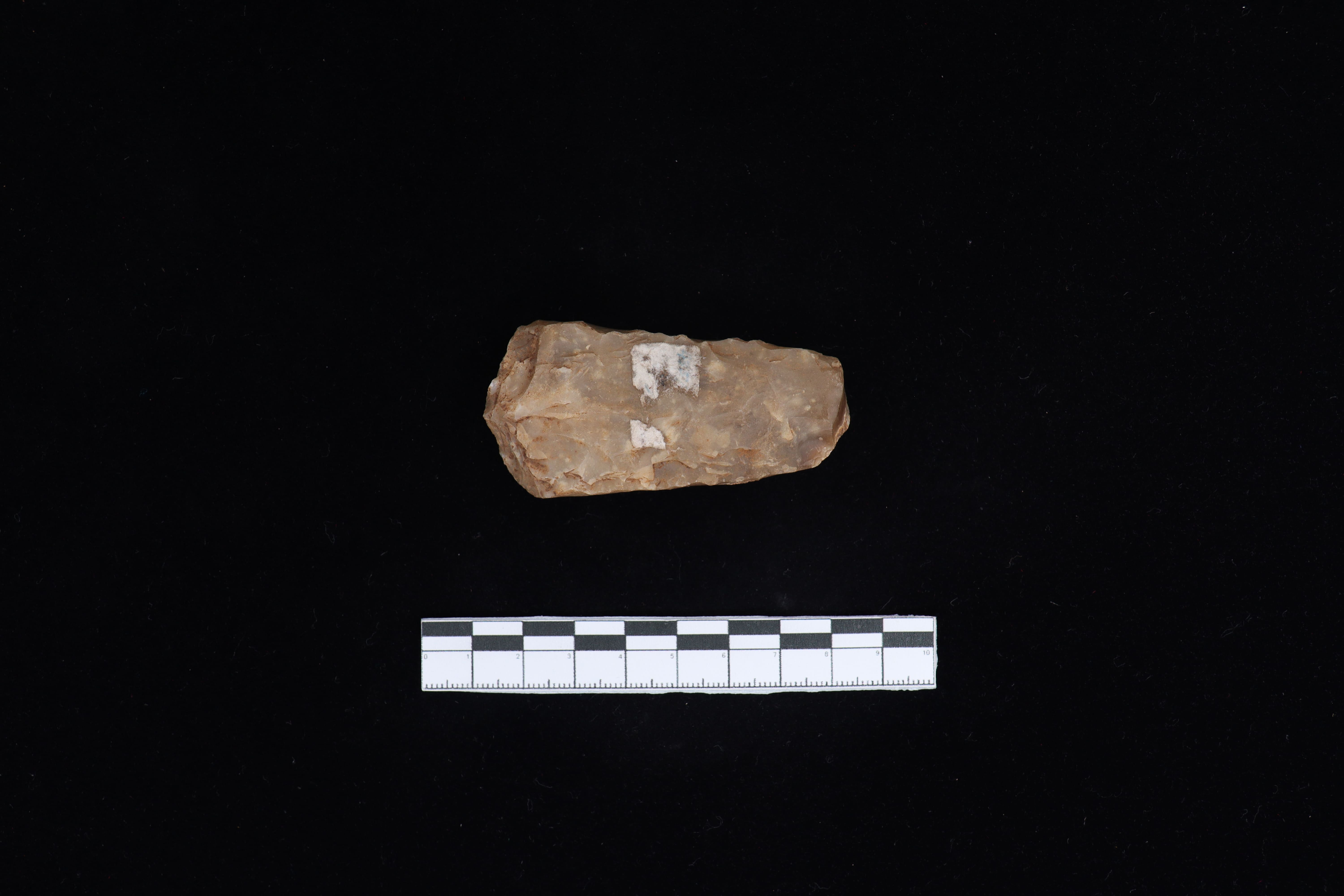 Beliung dengan kondisi utuh dan fisik yang baik ini memiliki warna dominan abu-abu, namun terdapat residu berupa tanah yang masih menempel pada koleksi. Pada bidang punggung terdapat tulisan berwarna putih, berbentuk datar serta terdapat kerak di sisi kanan sekitar 7%. Pada pangkal gagang berbentuk datar dan di sisi l=kiri terdapat kerak sekitar 5%. Pada sisi kiri ada kerak sekitar 2% dan berbentuk lurus, sedangkan sisi kanan lurus ke bawah. Beliung ini memiliki teknologi penajaman secara bifasial namun belum mendapat perlakuan diupam serta terdapat jejak pakai dari masa lalu dilihat dari mata tajaman yang bergerigi.