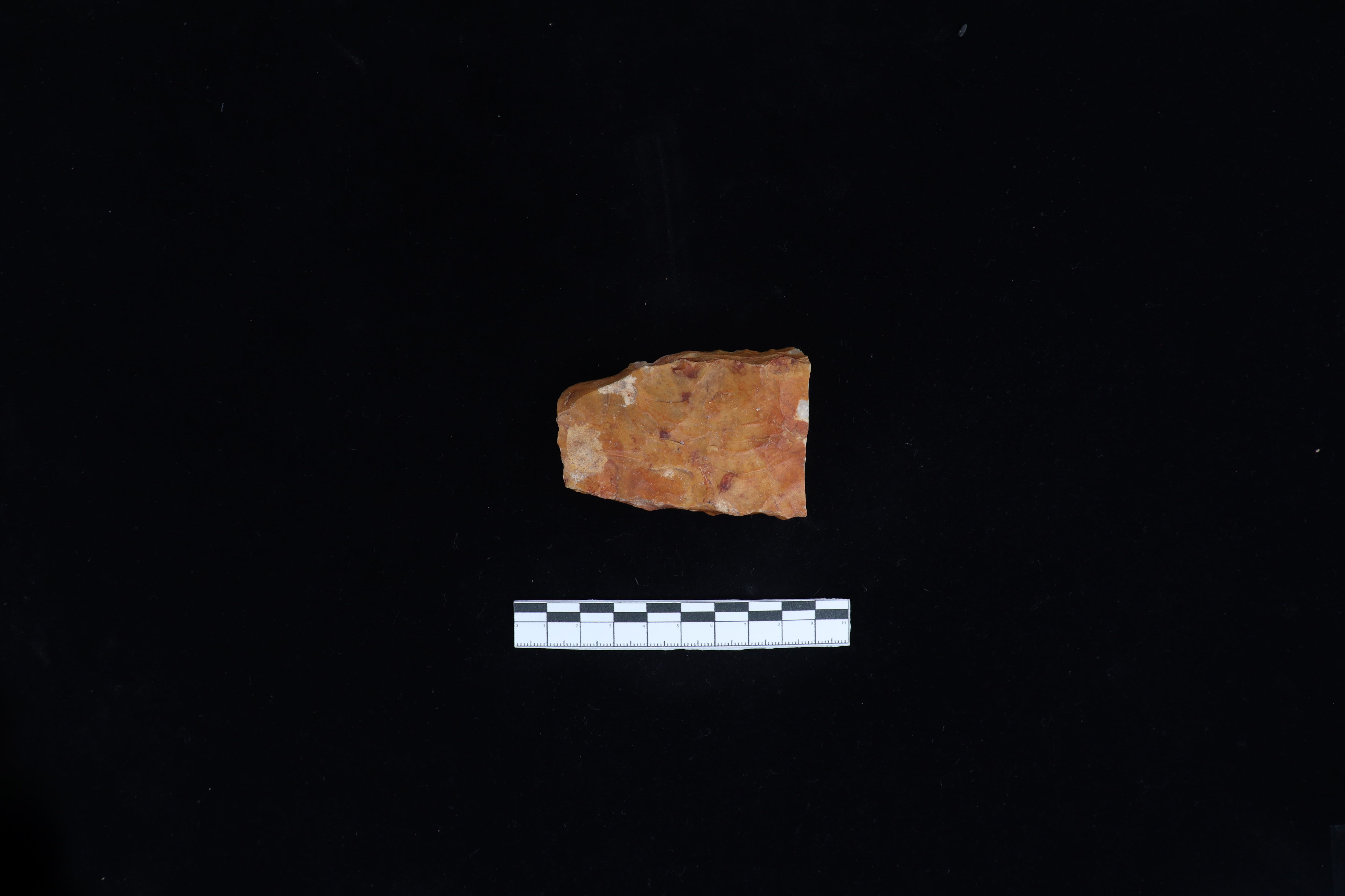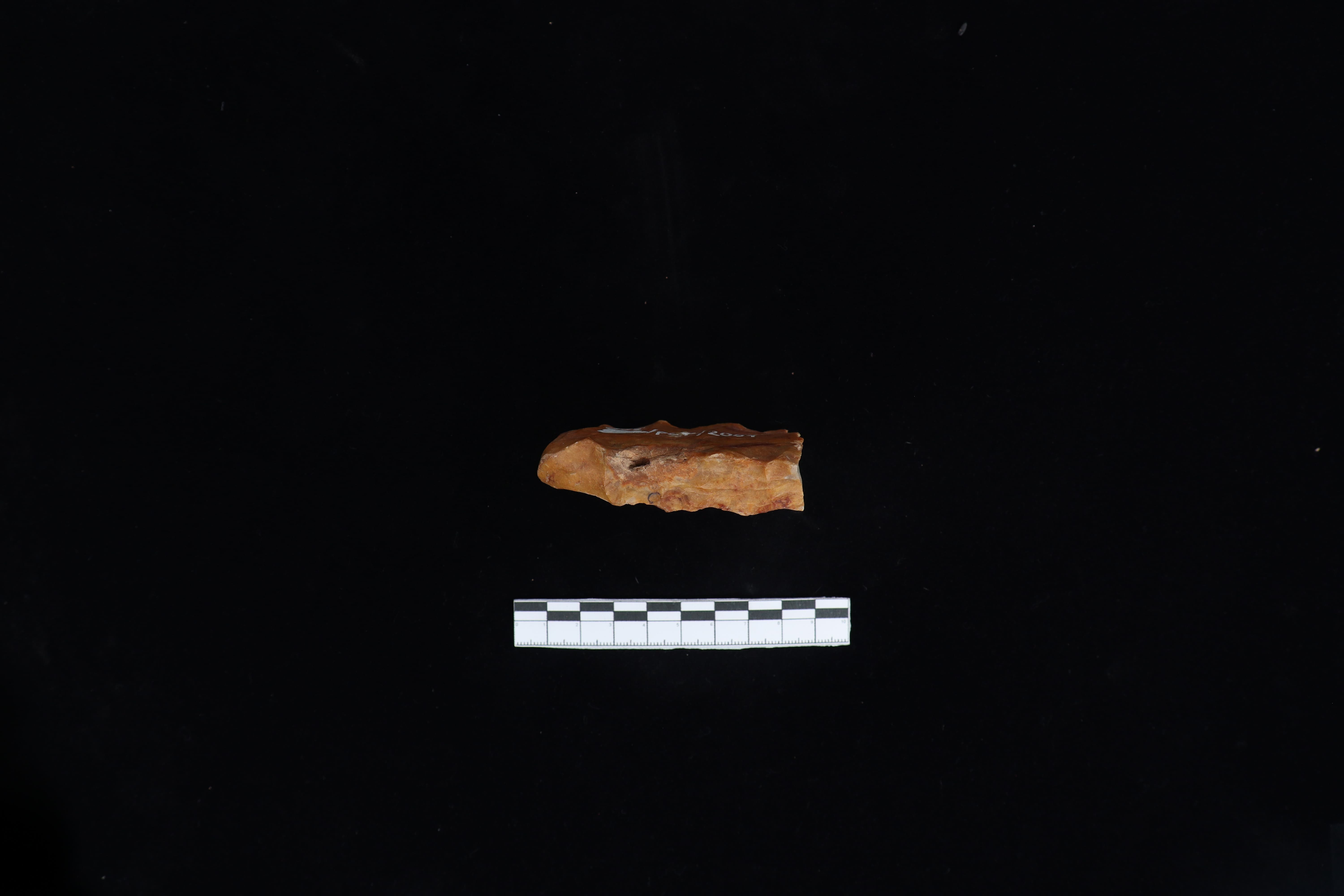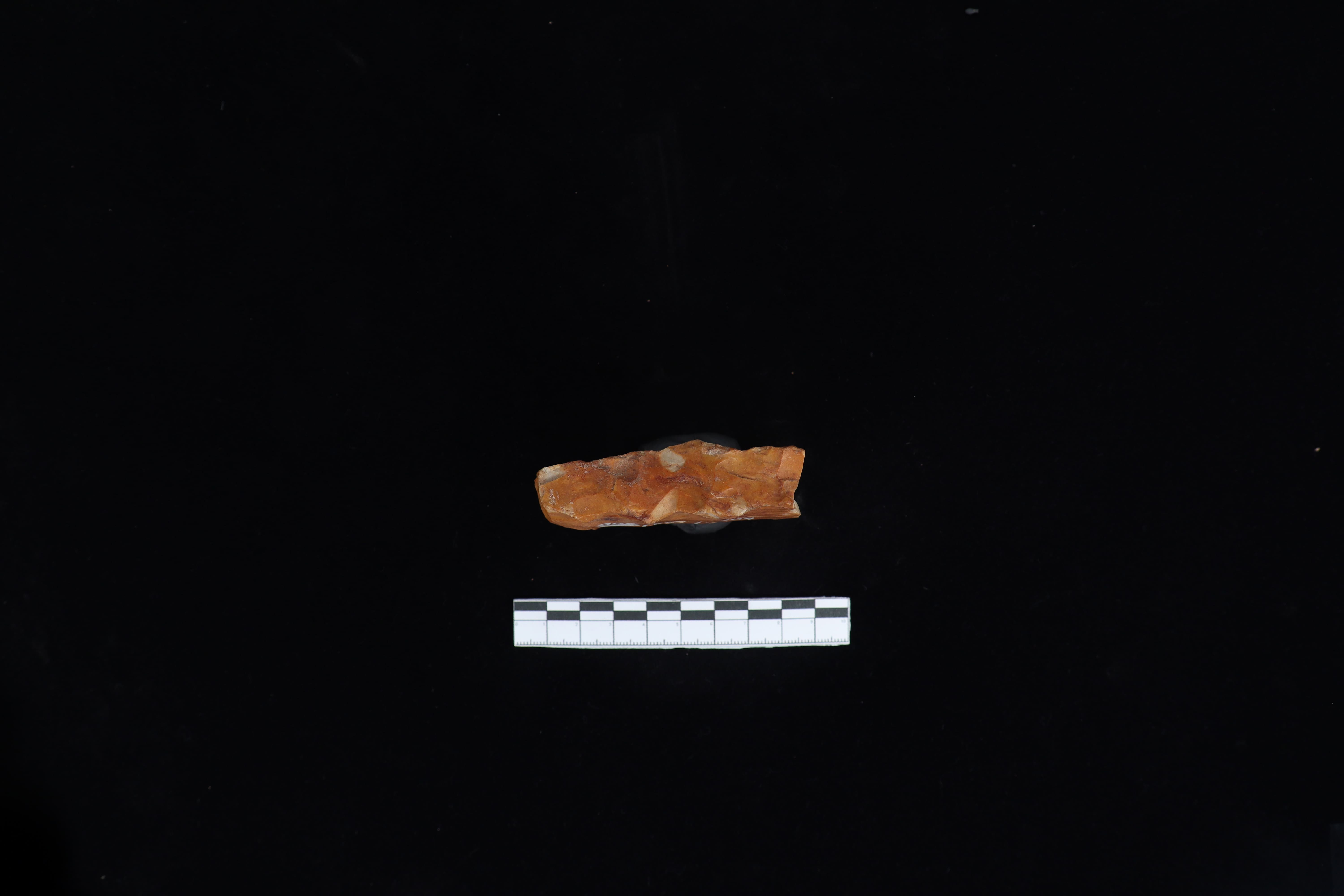 Koleksi ini merupakan beliung persegi dengan kondisi koleksi bagian depan terdapat nomor temuan warna putih, bagian belakang terdapat beberapa bulatan coklat tua, teknik pemangkasan koleksi ini monofasial (pemangkasan pada salah satu permukaan batu) dan dalam pengerjaannya sedikit dihaluskan, di salah satu lateral terdapat lekukan mendalam. Lalu bagian proximal (atas) cenderung rata serta berwarna abu dan distal (bawah) cenderung rata dan tidak ditemukan jejak pakai.