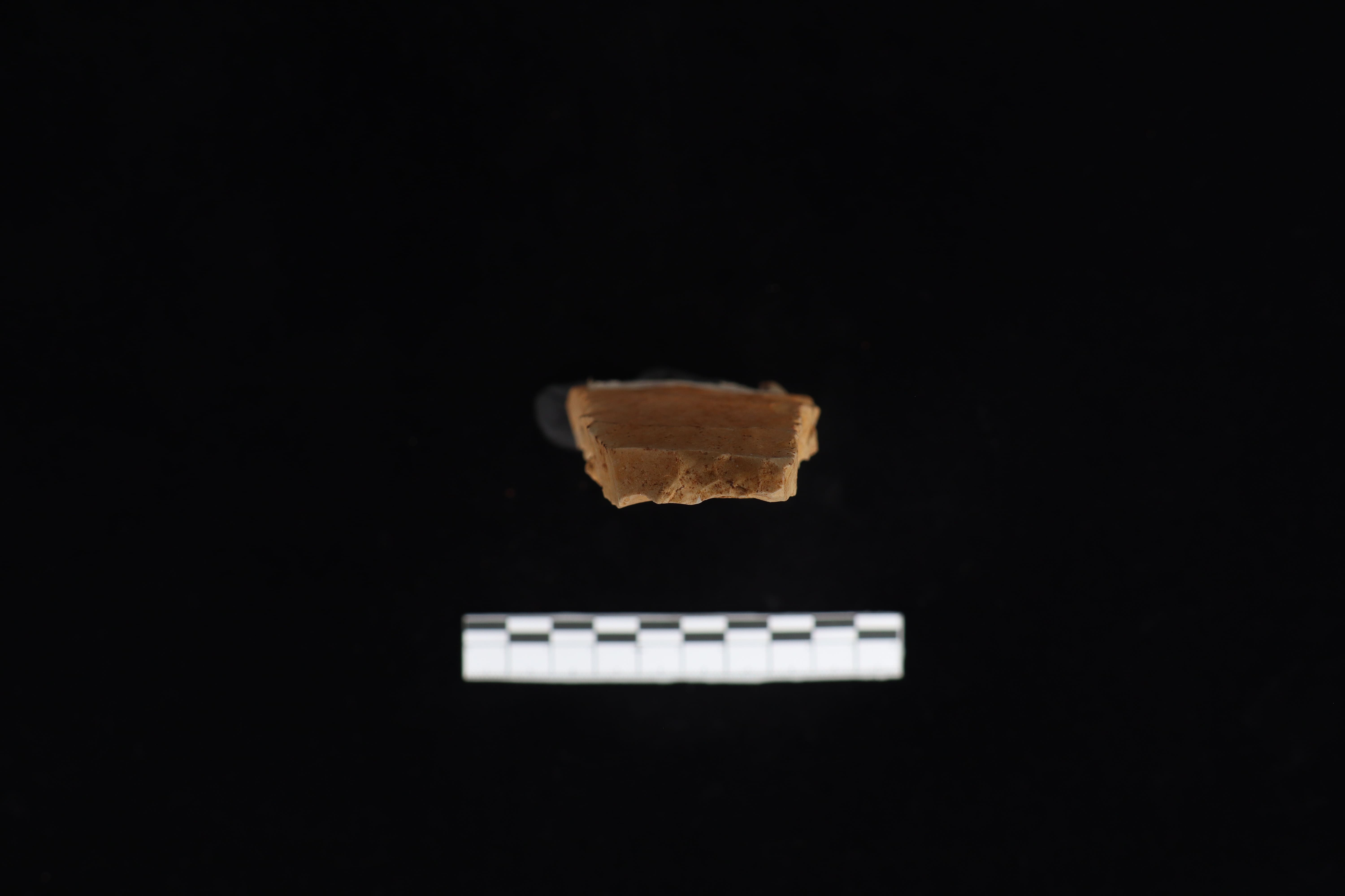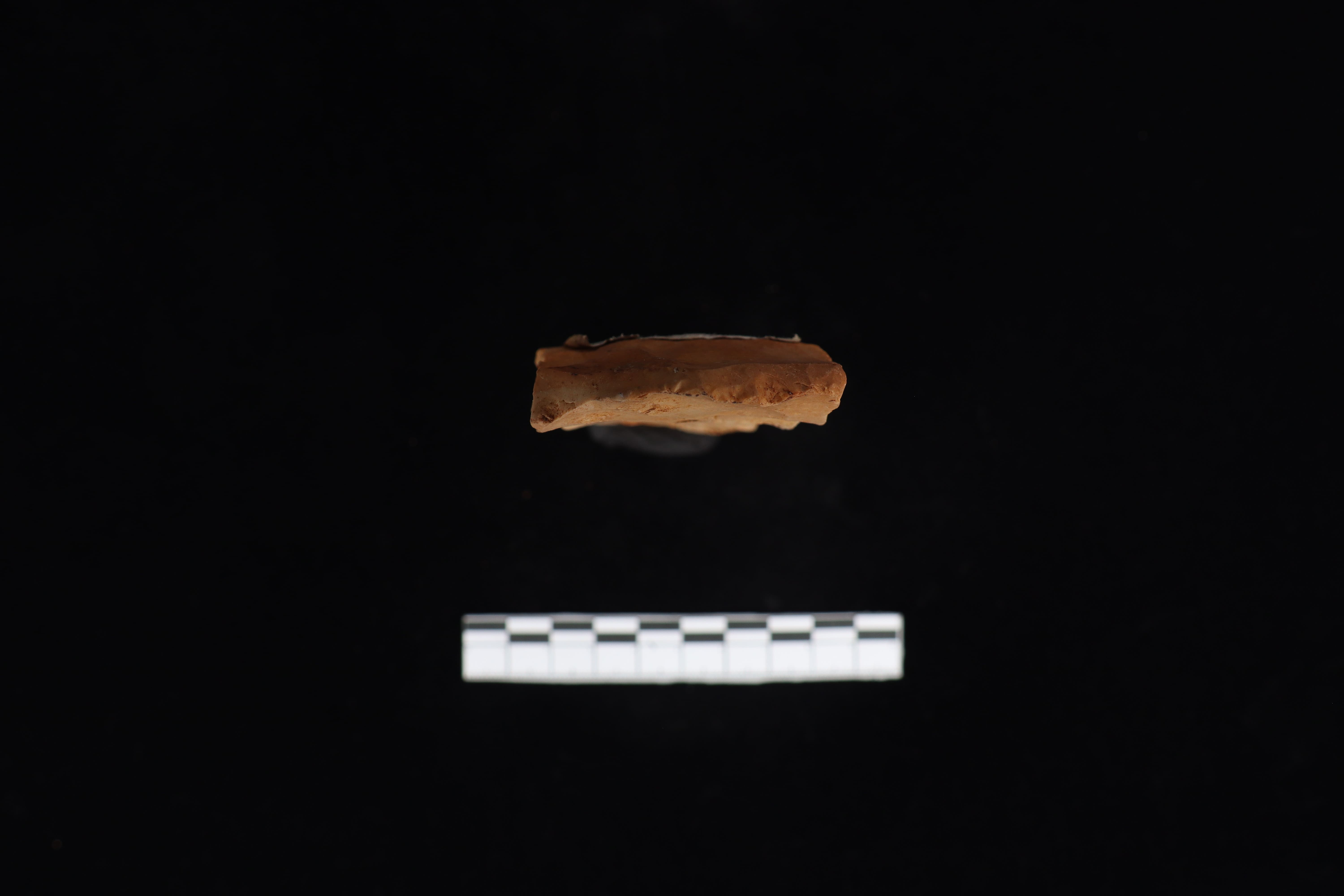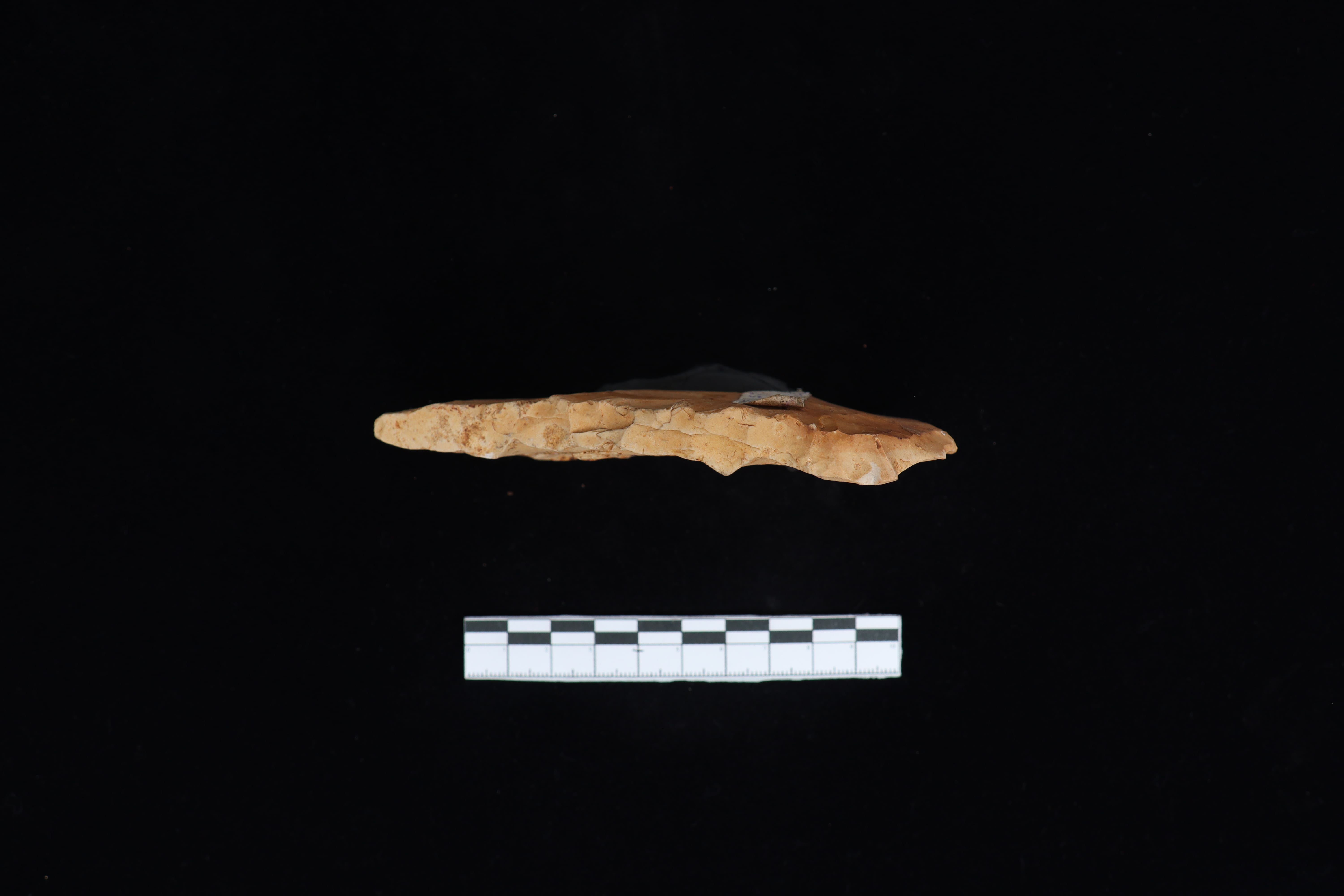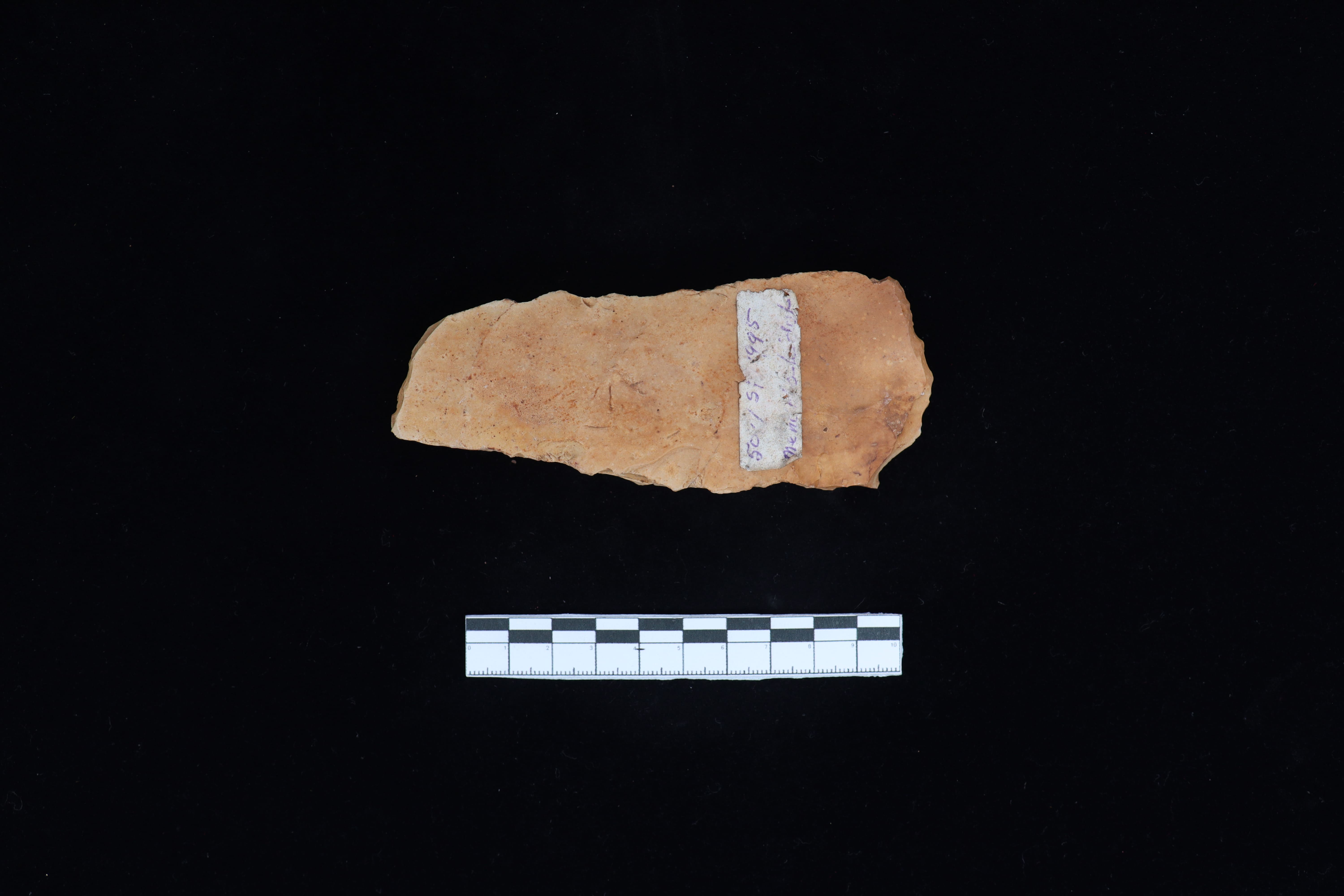 Beliung dengan kondisi utuh dan fisik yang baik ini memiliki warna dominan coklat muda, namun masih terdapat sisa residu yang menempel pada tubuh koleksi berupa tanah. Pada bidang punggung berbentuk datar dan terdapat label yang menempel dekat bagai bilah. Pada bidang pangkal tidak berbentuk datar namun sedikit merosot ke arah kanan. Pada sisi kiri dan kanan berbentuk lurus sedikit bergerigi. Pada bidang bawah terlihat tulisan berwarna putih dan juga terdapat kerak pada bagian gagang sekitar 5%. Beliung ini memiliki teknologi penajaman secara monofasial namun belum menerima perlakuan di haluskan atau diupam. Terlihat jejak pakai pada mata tajamaan berupa gerigi.