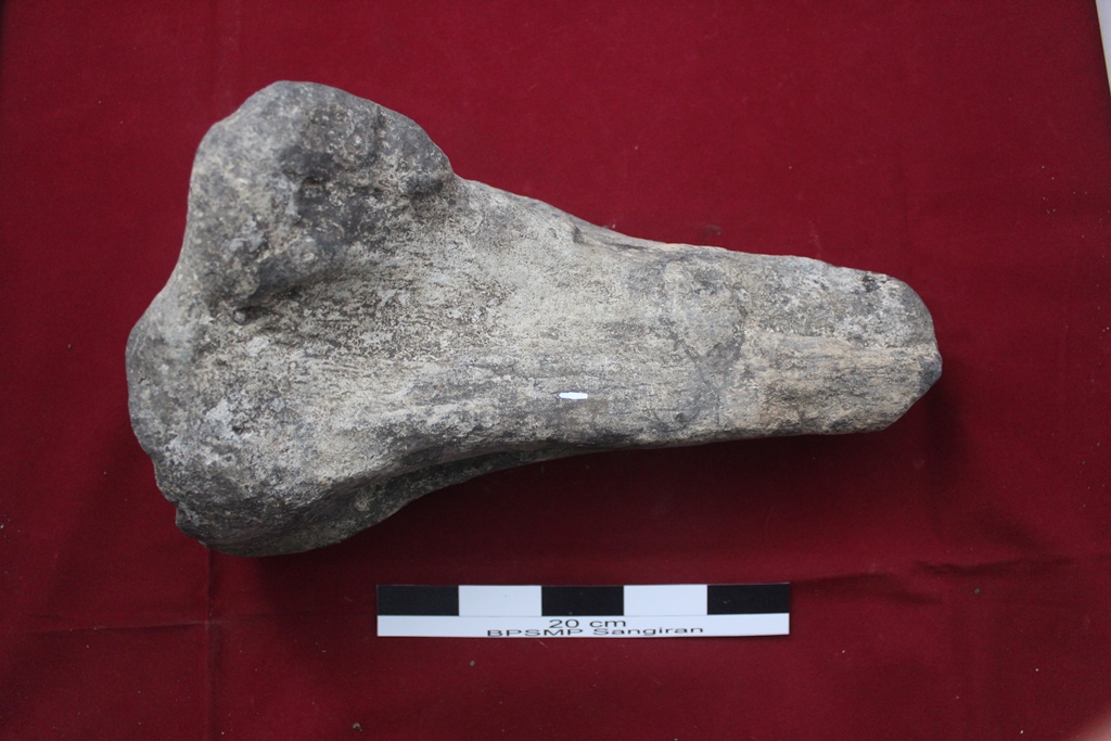 Beliung dengan kondisi utuh dan fisik yang baik ini memiliki warna dominan coklat muda sedikit kemerahan. Pada tubuh koleksi masih terdapat sisa residu berupa tanah yang menempel. Pada bidang punggung berbentuk datar namun permukaannya tidak begitu rata serta terdapat kerak di bagian tengah sekitar 3% dan ada pula sebuah tulisan berwarna putih yang menempel pada tubuh koleksi. Pangkal gagang berbentuk datar namun juga tidak rata pada permukaannya. Sedangkan bidang bawah memiliki permukaan yang menonjol pada bagian tengah serta ada kerak sekitar 10% berwarna sedikit kemerahan. Sisi kiri memiliki permukaan yang terbilang lebih rata dan datar sedang sisi kiri melengkung keluar dan permukaannya yang tidak rata. Terdapat teknologi penajaman secara bifasial dan belum mengalami proses pengupaman. Terlihat jejak pakai pada mata tajamaan berupa retus bergerigi di bagian bidang bawah.
