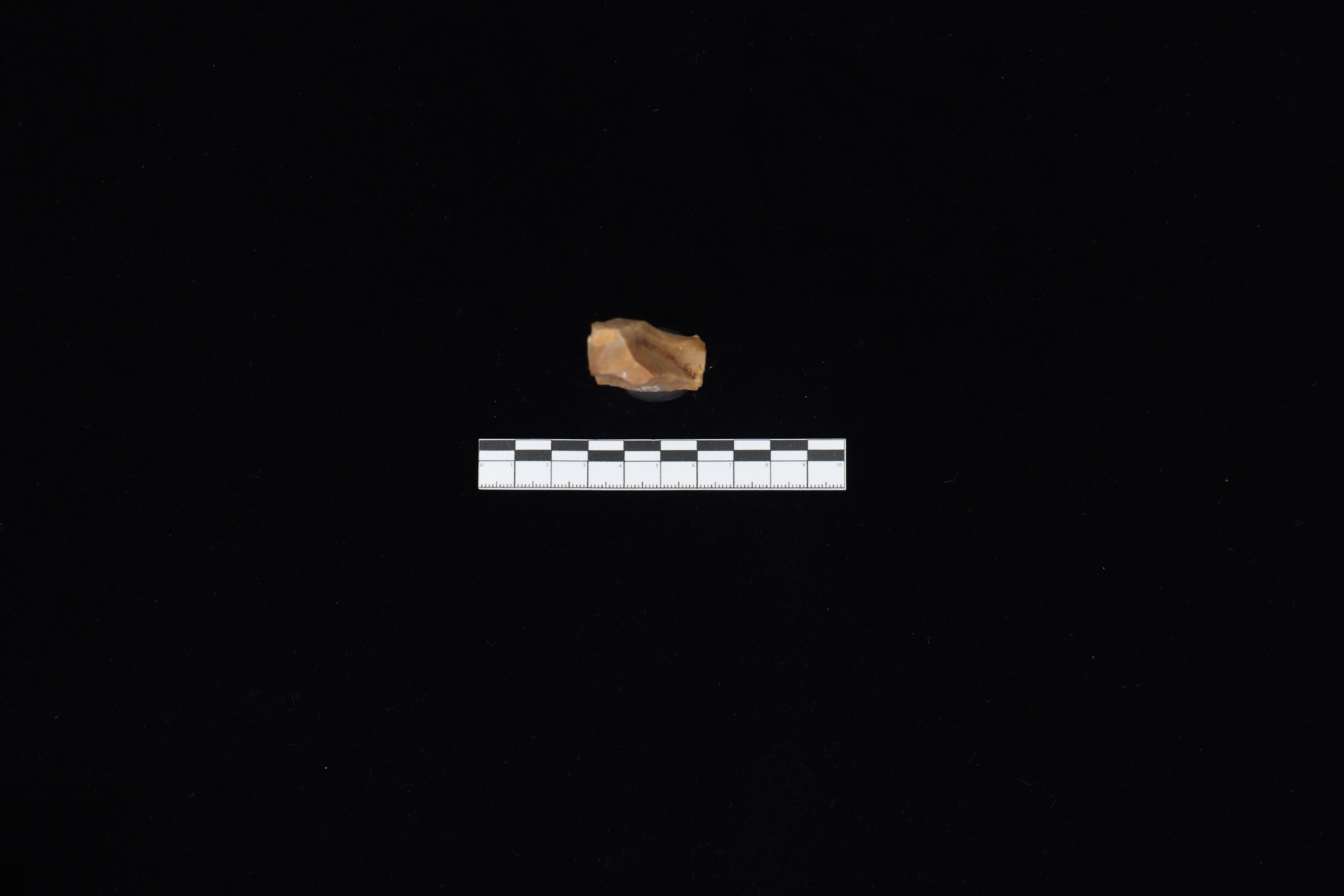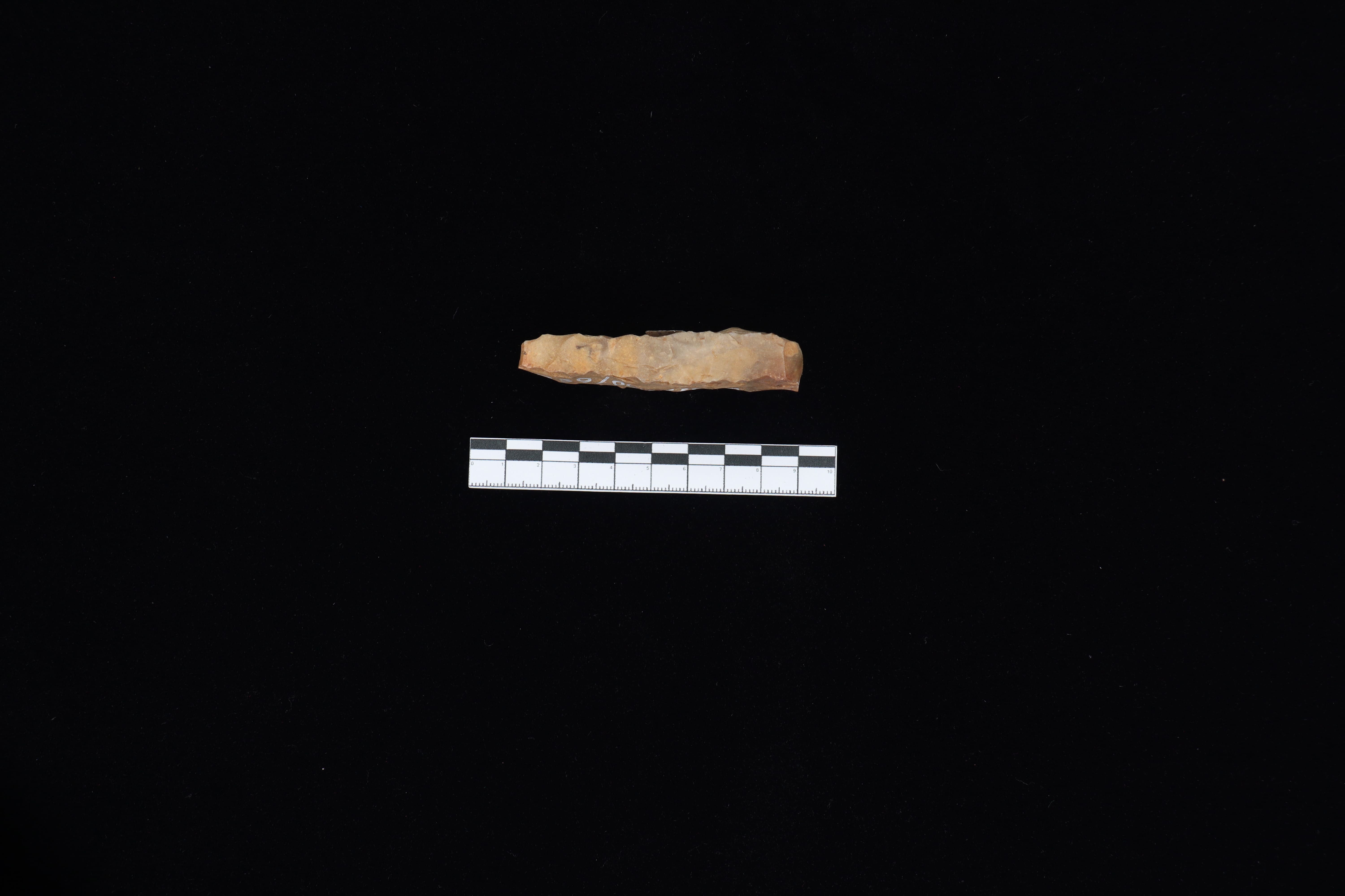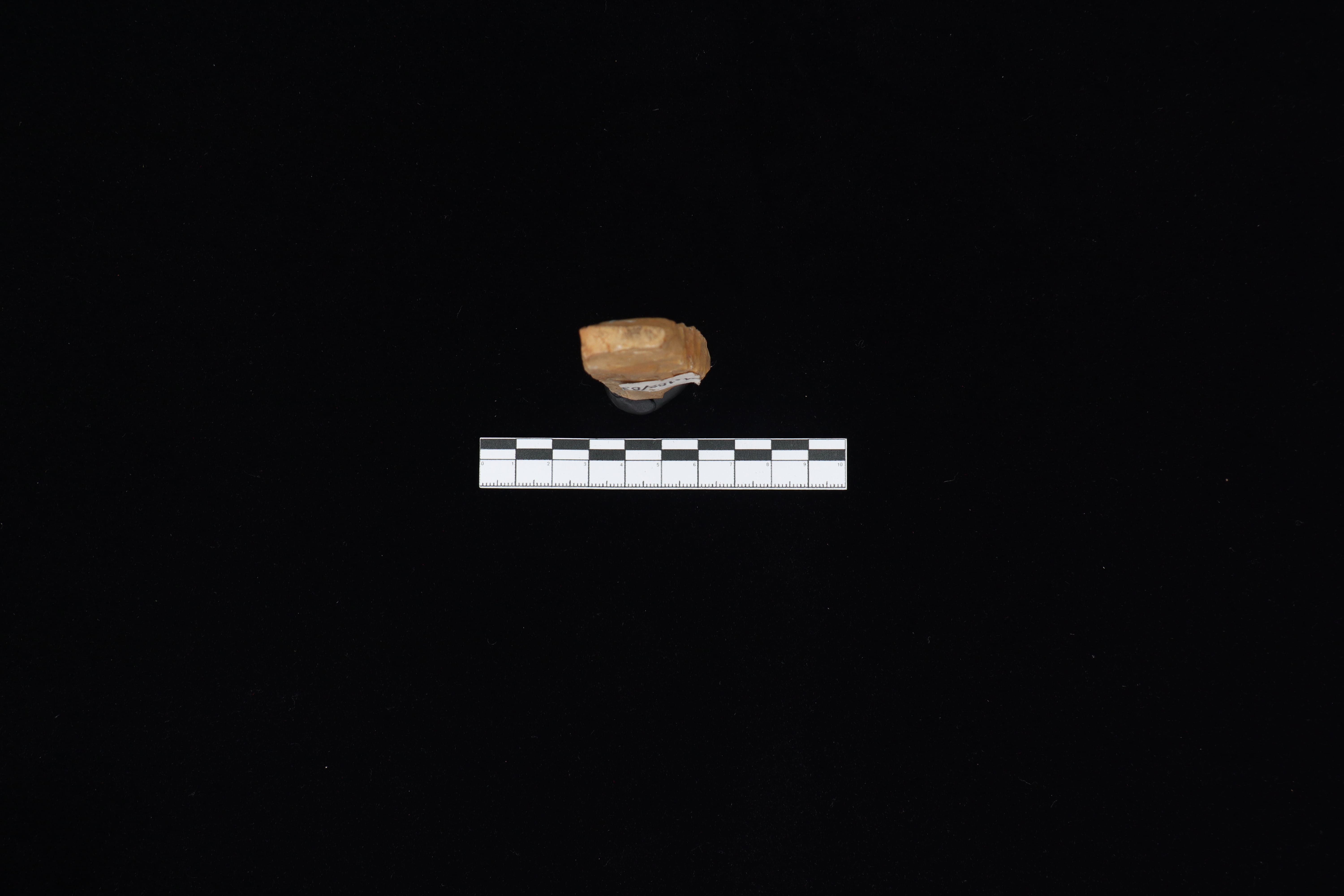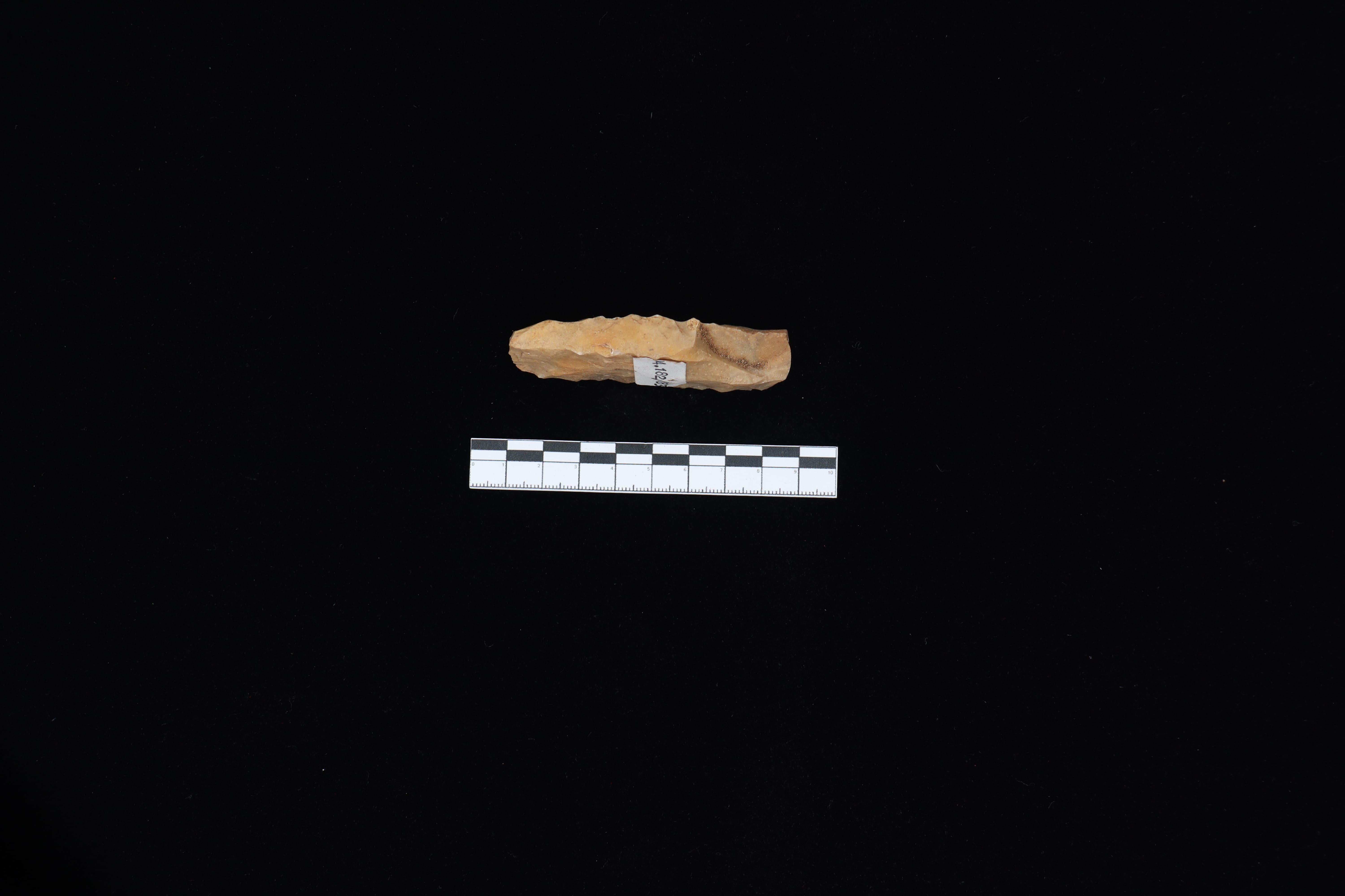 Koleksi ini merupakan Beliung persegi dengan kondisi koleksi bagian depan terdapat nomor inventaris lama, bagian belakang terdapat label kertas temuan yang lama serta koleksi ini menggunakan teknik pemangkasan Monofasial dan dalam pengerjaannya tidak dihaluskan. Lalu bagian Proxinal/atas memiliki warna yang cenderung kemerahan dengan adanya patahan, bagian distal/bawah tidak terdapat retusan yang tidak menandakan koleksi ini pernah dipakai, bagian Lateral kanan lebih banyak lekukan dari pada bagian Lateral kiri yang cenderung sedikit karena ada patahan.