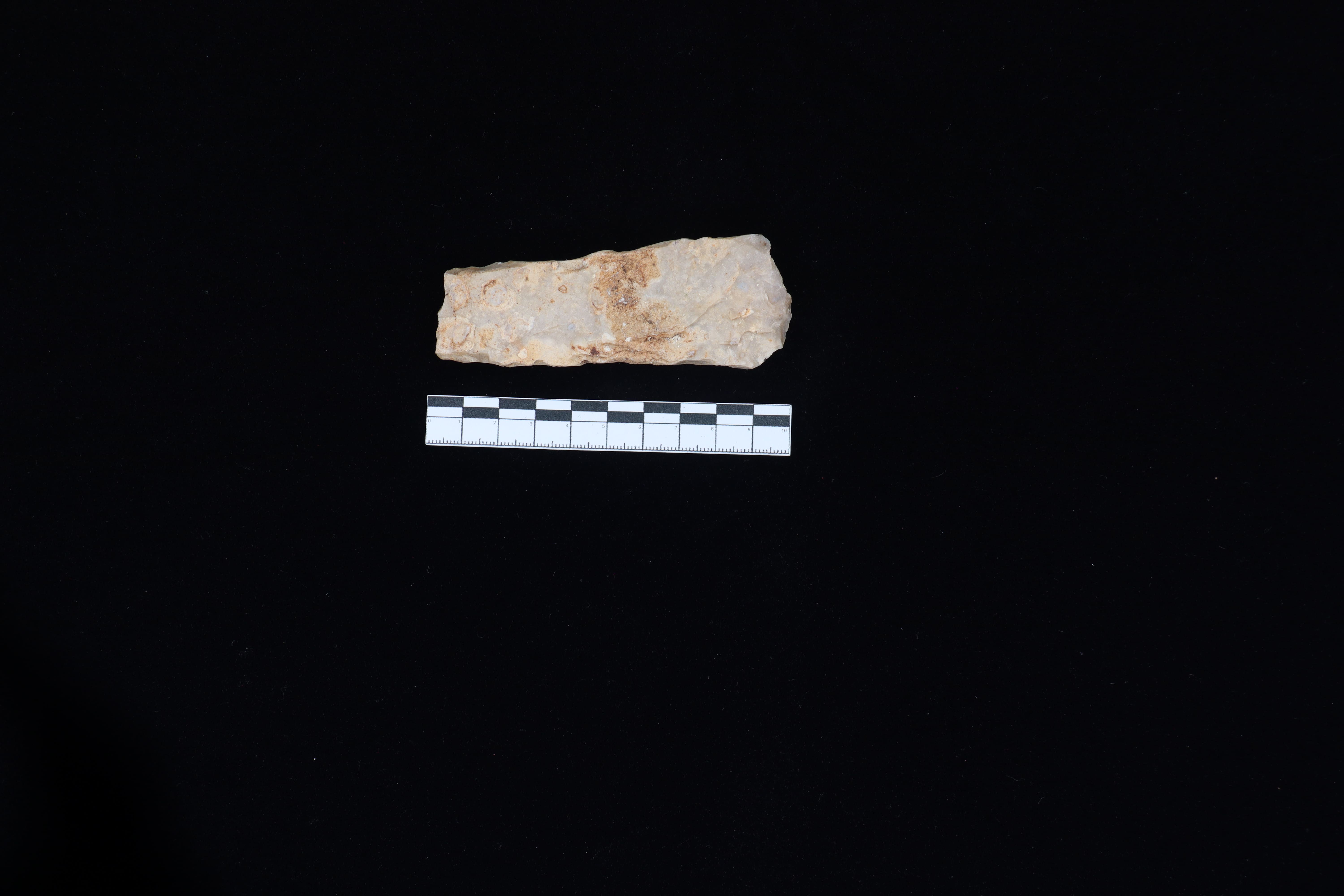 Beliung persegi berwarna coklat abu-abu kehitaman berbentuk persegi panjang. Bagian tajaman berbentuk cembung pada sisi kanan dan cekung pada sisi kiri, bagian pangkal berbentuk datar yang sedikit menurun. Terdapat teknologi penajaman secara bilateral dan dalam pengerjaan yang tidak dihaluskan. Terdapat jejak pakai pada bidang tajaman. Secara umum kondisi beliung persegi ini baik namun terdapat sedikit sisa-sisa tanah yang menempel pada koleksi.