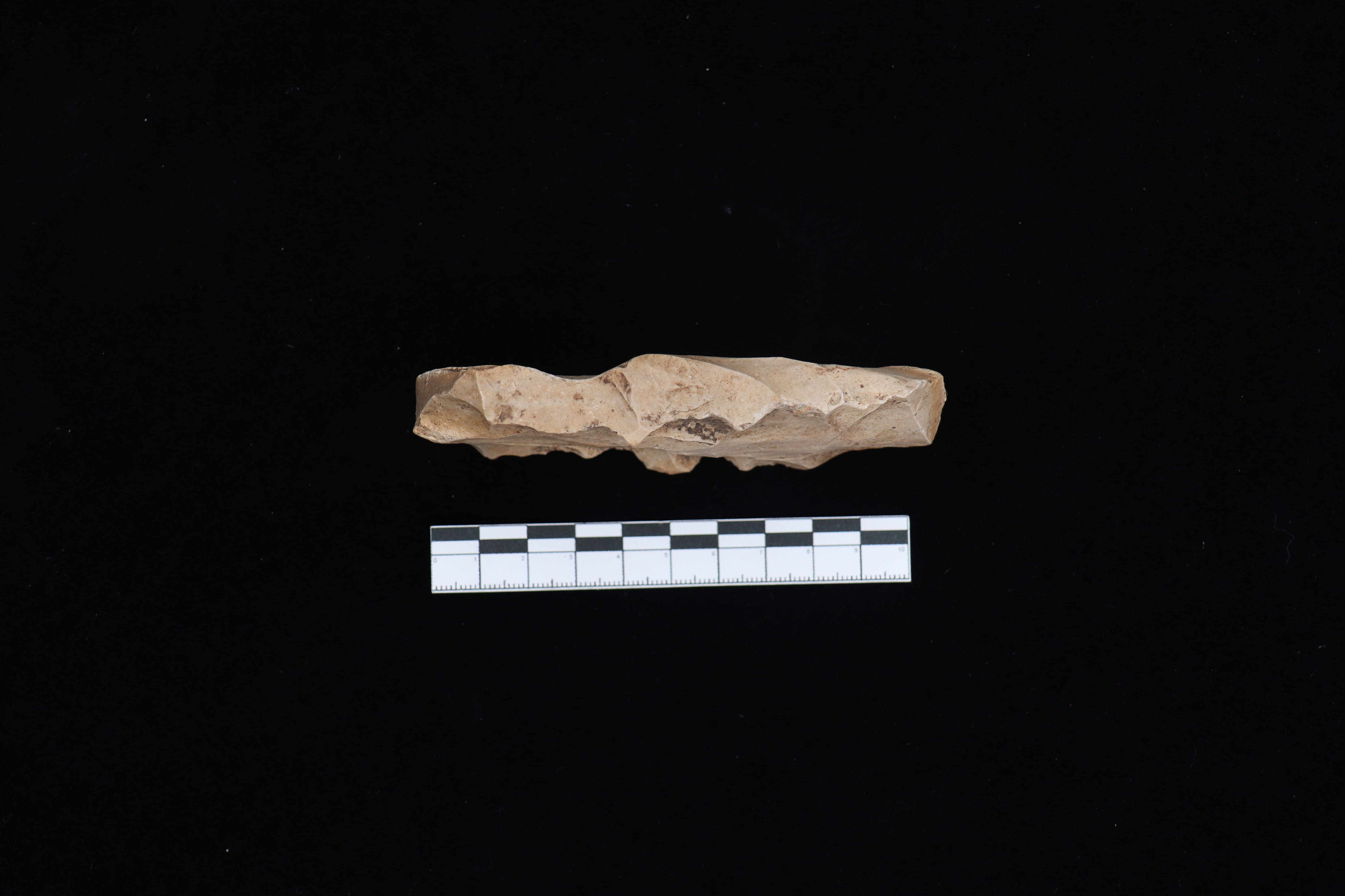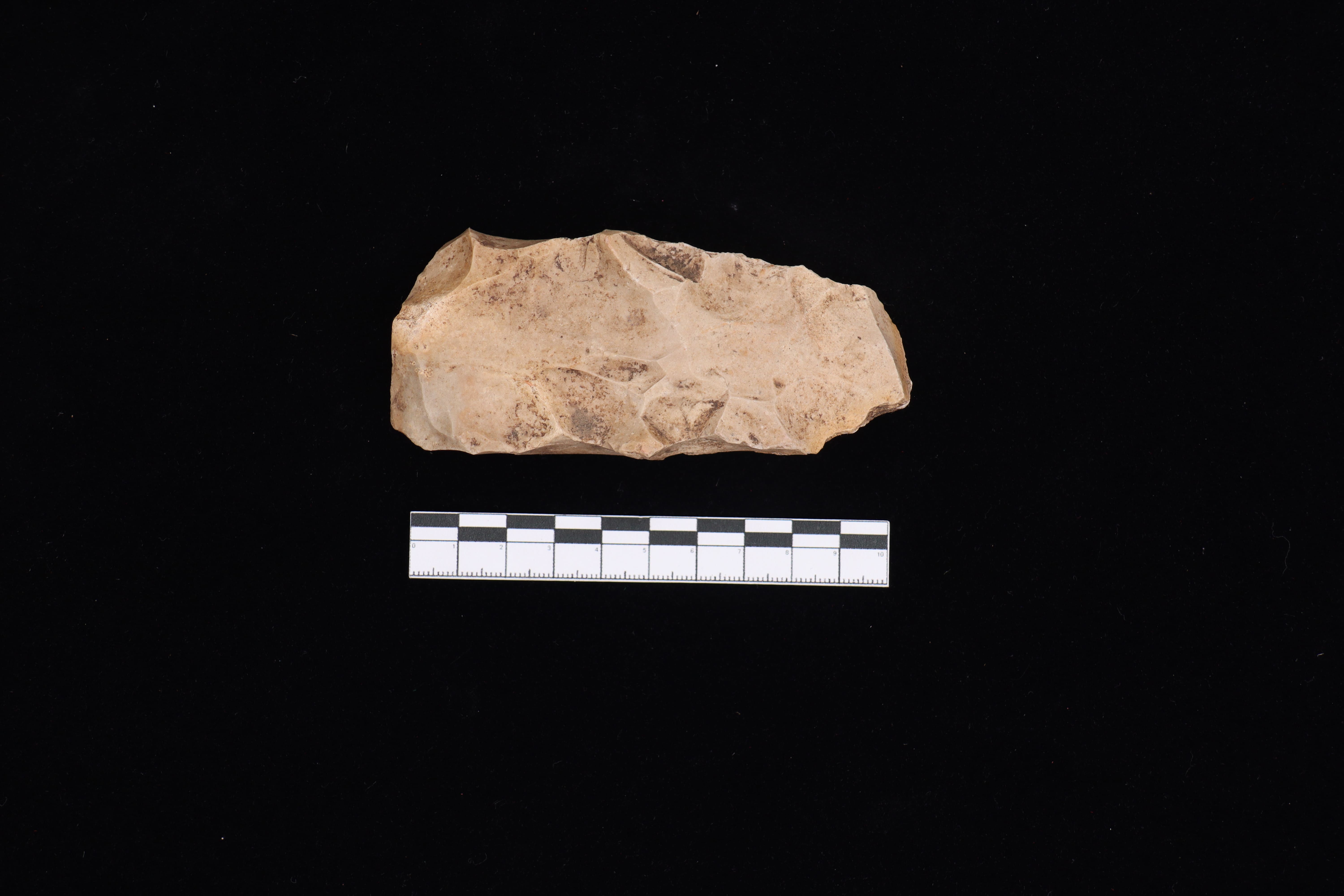 Koleksi ini merupakan Beliung persegi dengan kondisi koleksi bagian depan terdapat beberapa lekukan dengan bercak hitam, bagian belakang terdapat nomor temuan warna putih dan hitam dan terdapat korteks dengan indikasi keberadaan 15% serta koleksi ini menggunakan teknik pemangkasan Monofasial dan dalam pengerjaannya tidak dihaluskan. Lalu bagian Proximal/atas bertekstur rata dan halus, bagian Distal/bawah terdapat korteks dan cenderung tidak runcing.