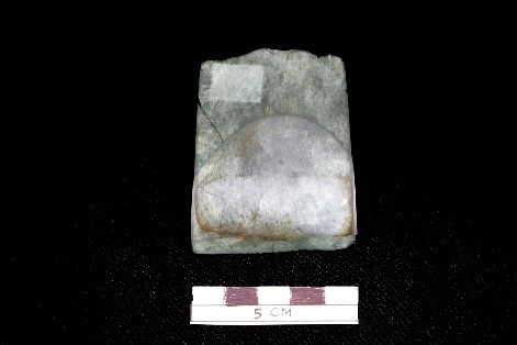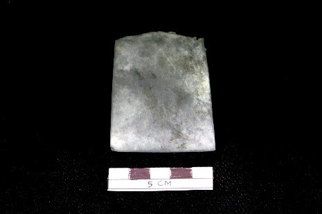 Umumnya, permukaan atas dan bawah objek bertekstur halus dan licin. Apabila diperhatikan secara garis lurus dari atas permukaan objek, permukaan terlihat mengalami kerusakan / patah sehingga objek tersisa setengah bahkan hampir tidak memiliki bagian pangkal gagang secara utuh. Bagian salah satu sudut tajaman terlihat bekas pengikisan benda keras sehingga meninggalkan jejak cekungan. Sisi bidang kiri dan kanan memiliki pola yang sama. Permukaan objek bagian bawah terlihat cekungan yang cukup dominan sehingga menyisakan jejak garis melengkung dengan permukaan ujung landai. Gagang objek terlihat bekas pemangkasan dengan garis permukaan terluar bertekstur kasar. Bagian gagang memperlihatkan adanya bekas pemakaian yang dilakukan secara intensif. Adapun dimensi ketebalan objek yaitu bagian gagang hingga bilah berukuran 17,8 mm, bagian bilah hingga tajaman 17,2 mm, dan bagian pangkal gagang dengan kondisi patah (tidak utuh) berukuran tebal 8,5 mm.