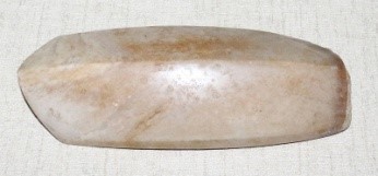 Beliung ini dibuat dari batuan Kalsedon, warna abu-abu agak kecoklatan. Bentuk empat persegi panjang dengan panampang berbentuk segi lima. Seluruh bagiannya(permukaan) diupam sangat halus hingga bagian pangkalnya sbagai tempat ikatan tangkai. Bagian atasnya berpunggung atau melengkung cembung, sedangkan bagian bawahnya cekung. Terlihat sisi tajamnya patah, sehinggah sulit untuk mengidentifikasi bentuk tajamnya atau cara pengasahannya. Beliung seperti ini digunakan dengan mengikatnya melintang pada puncak gagang sebatang kayu yang bersudut. Sering kali beliung seperti ini menjadi barang tukaran, disamping juga digunakan pula untuk keperluan pertanian.