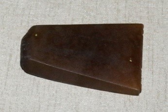 Beliung persegi ini dibuat dari batuan Kalsedon warna coklat agak kekuningan. Bentuk empat persegi panjang. Seluruh permukaanya diupam cukup halus. Sisi bagian tajamnya lebih lebar dari pangkalnya. Tampak sisi tajamnya ada bekas-bekas pernah dipakai (sedikit aus). Kapak tersebut biasanya dipergunakan untuk keperluan sehari-hari.
