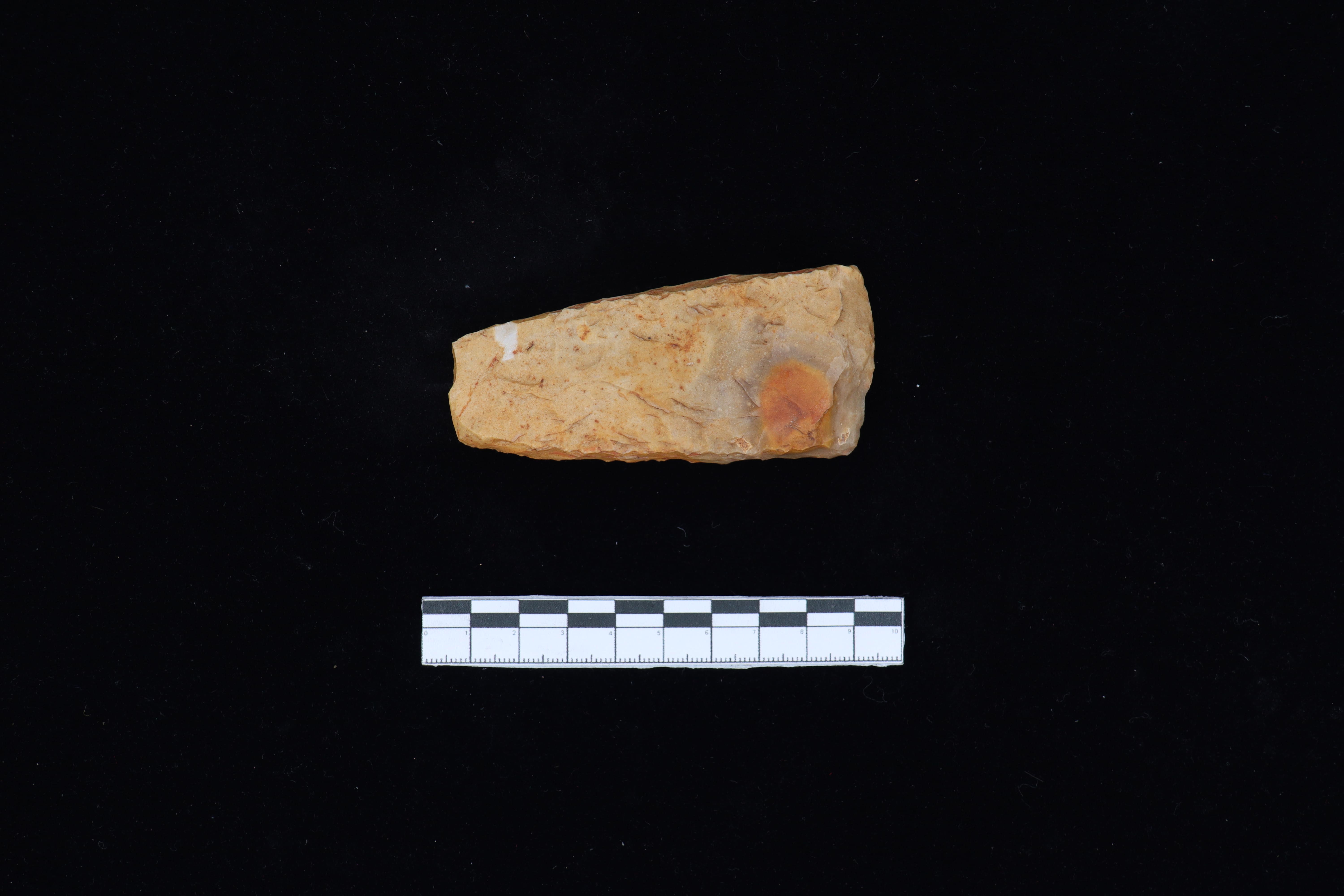 Beliung ini memiliki bentuk dasar persegi. Lebih detail lagi pada sisi distal memiliki dimensi yang lebih lebar dibandingkan sisi proksimal sehingga membentuk bidang trapesium yang memanjang mengikuti bentuk dasar spesimen. Secara teknologi, spesimen ini sudah mengalami proses pemangkasan lanjutan untuk menghasilkan bentuk yang simetris dan ergonomis. Hal ini tampak dari adanya pemangkasan atau retus yang mengarah ke sisi lateral. Selain itu pada spesimen ini juga sudah dibentuk bidang tajaman tetapi belum dilakukan proses pengupaman di seluruh bagian spesimen.