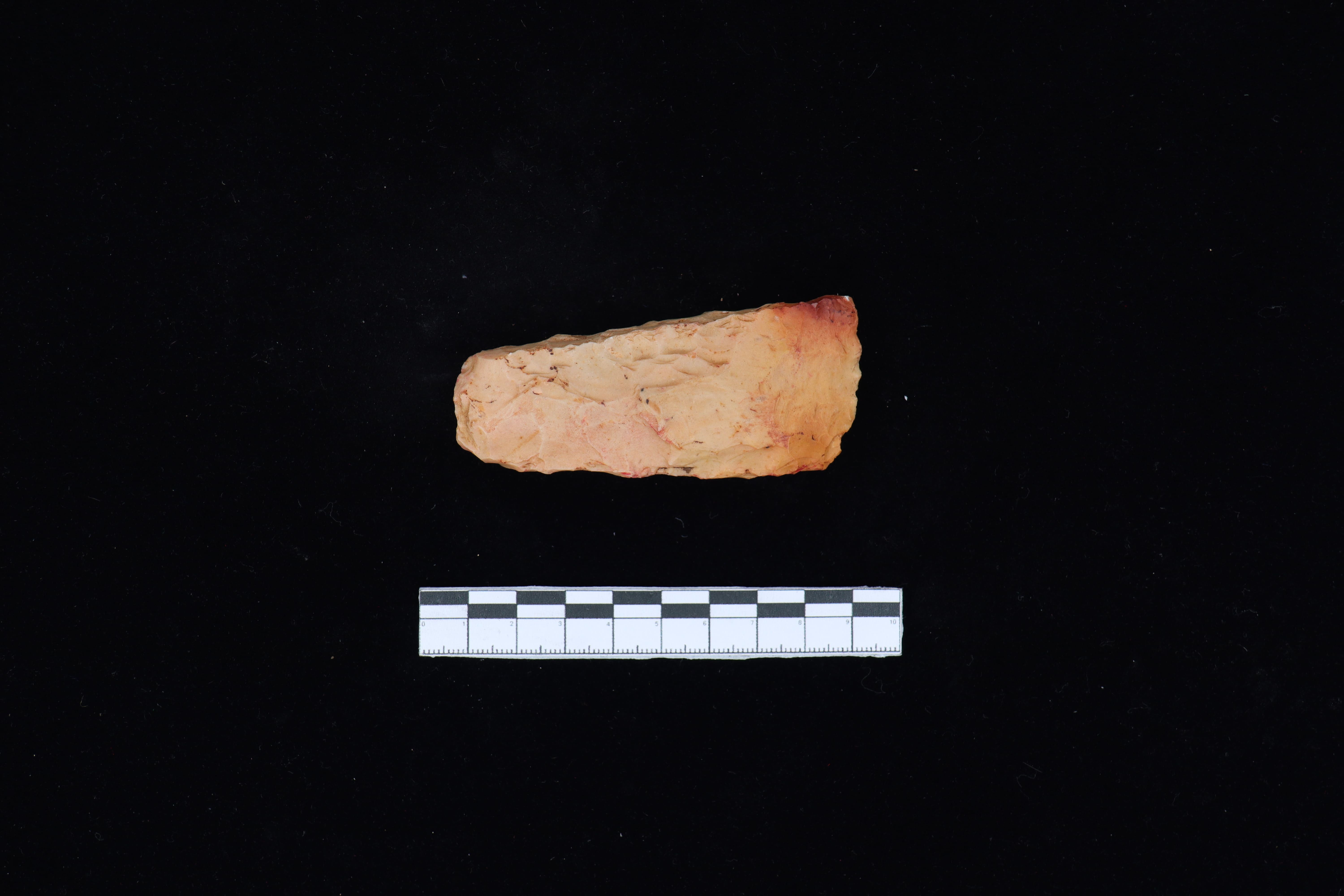 Beliung ini memiliki bentuk dasar persegi. Lebih detail lagi pada sisi distal memiliki dimensi yang lebih lebar dibandingkan sisi proksimal sehingga membentuk bidang trapesium yang memanjang mengikuti bentuk dasar spesimen. Secara teknologi, spesimen ini sudah mengalami proses pemangkasan lanjutan untuk menghasilkan bentuk yang simetris dan ergonomis. Hal ini tampak dari adanya pemangkasan atau retus yang mengarah ke sisi lateral. Selain itu pada spesimen ini juga sudah dibentuk bidang tajaman tetapi belum dilakukan proses pengupaman di seluruh bagian spesimen.