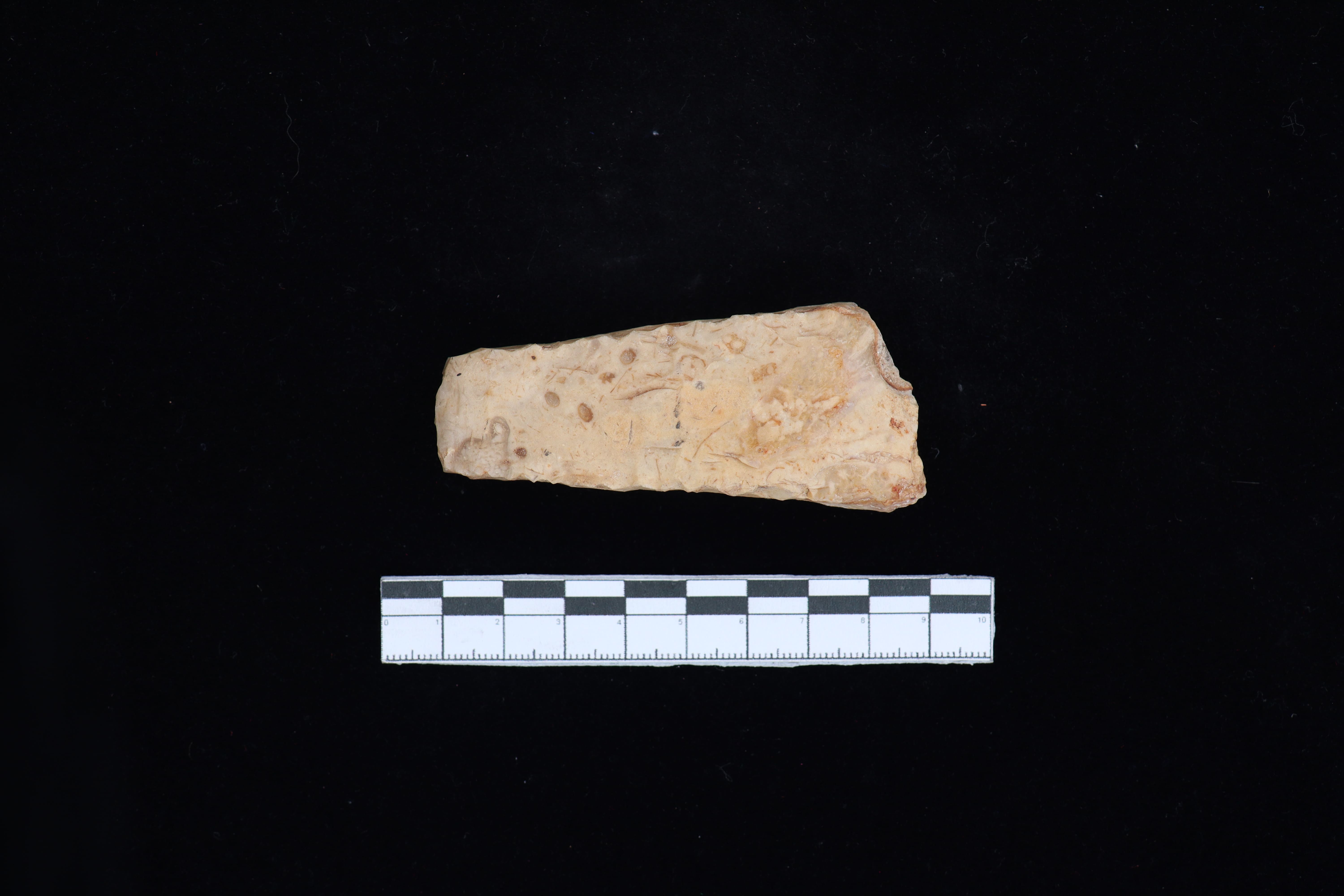 Beliung ini memiliki bentuk dasar persegi. Lebih detail lagi pada sisi distal memiliki dimensi yang lebih lebar dibandingkan sisi proksimal sehingga membentuk bidang trapesium yang memanjang mengikuti bentuk dasar spesimen. Secara teknologi, spesimen ini sudah mengalami proses pemangkasan lanjutan untuk menghasilkan bentuk yang simetris dan ergonomis. Hal ini tampak dari adanya pemangkasan atau retus yang mengarah ke sisi lateral. Selain itu pada spesimen ini juga sudah dibentuk bidang tajaman. Bidang tajaman terbentuk dari dua hingga tiga pemangkasan dari kedua sisinya (dorsal/ventral). Hasil pemangkasan menyebabkan bidang tajaman memanjang atau meluas hingga medial.