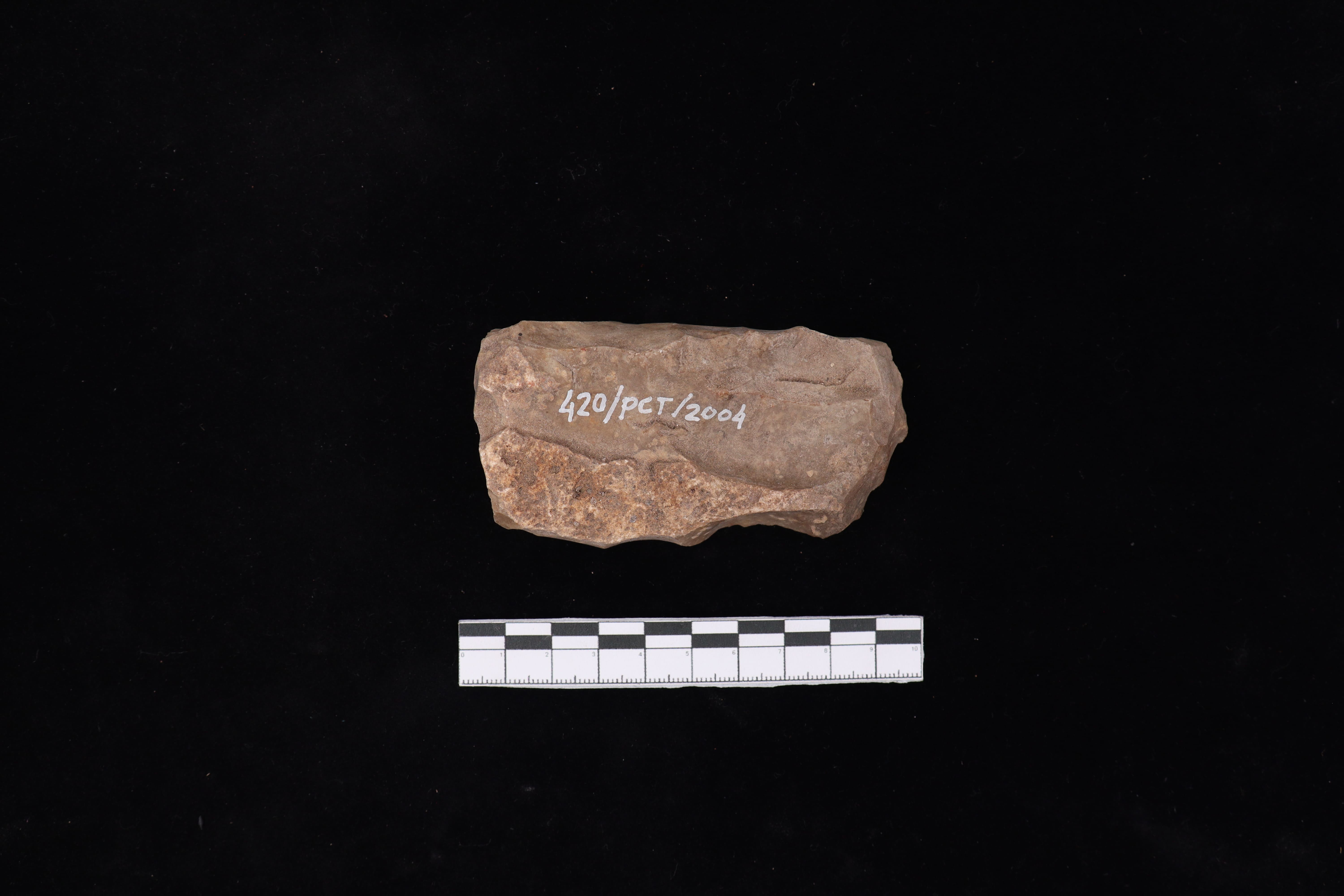 Beliung yang diperoleh dari hasil survey dengan kondisi fisik yang baik, memiliki warna coklat keabuan. Bagian kedua sisi berbentuk tidak beraturan dengan banyak cekungan. Bagian pangkal berbentuk lurus, bagian tajaman berbentuk tumpul, bidang proximal dan distal berbentuk tidak beraturan terdapat cekungan dan lubang di bidang distal. Dalam pengerjaan tidak dihaluskan dan terdapat korteks dengan presentase 18%.