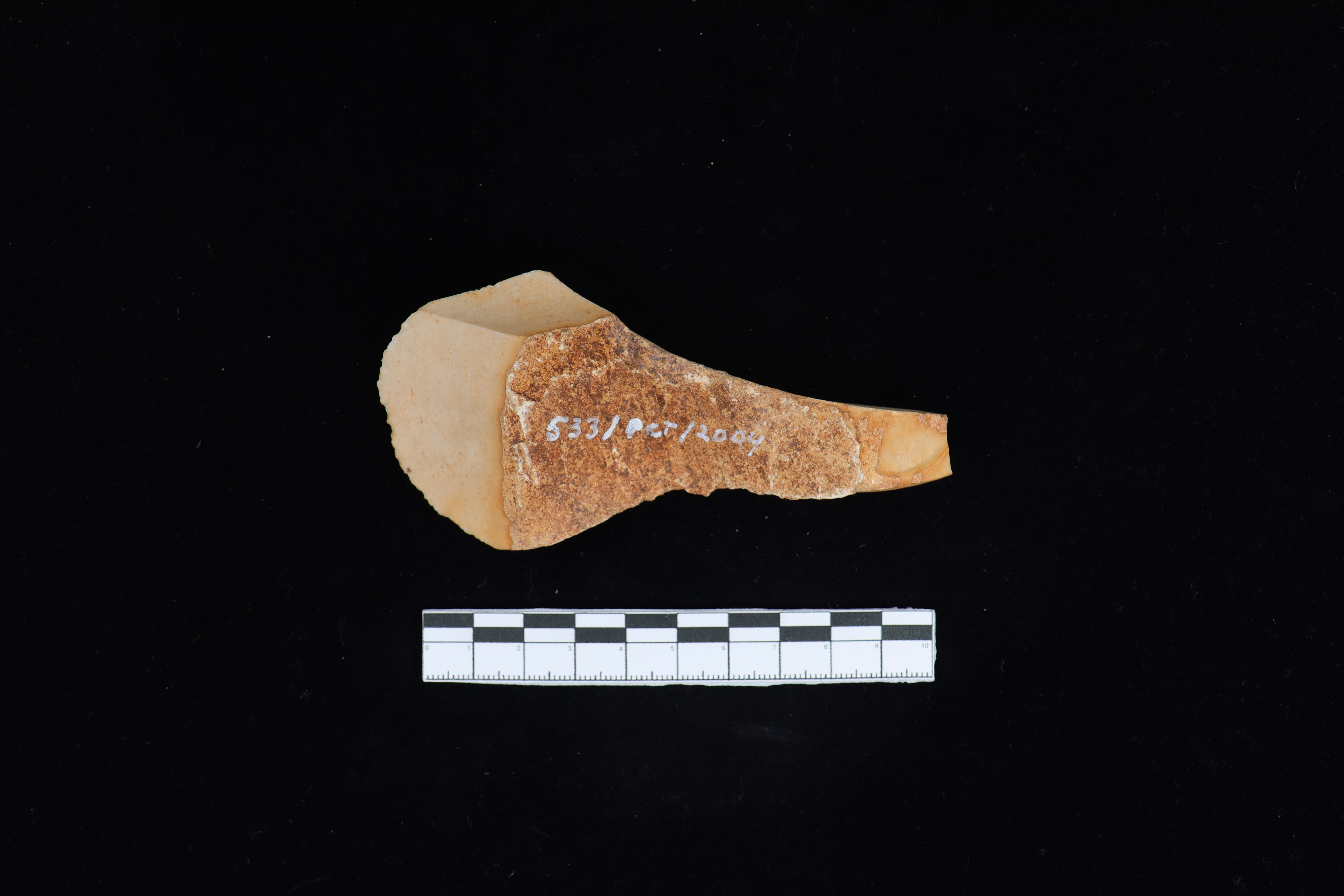 Beliung dalam kondisi utuh dan fisik yang baik. terdapat sisa residu tanah yang masih menempel. koleksi ini berwarna coklat. Pada bidang punggung terdapat mata tajaman berbentuk melengkung setengah lingkaran yang hampir sempurna, pada bagian pangkal gagang berbentuk lurus kecil dan datar pada bagian atas. Pada bidang punggung terlihat jejak teknologi penajaman Monofasial serta terdapat korteks sekitar 40%. Pada bidang sisi kiri melengkung ke arah dalam dan sisi kanan lurus dan melengkung ketika mendekati bagian mata tajaman melebar membentuk seperti rok. Pada bidang bawah seperti batu yang baru terpisah dari batu inti dan terlihat halus seperti telah mengalami proses pengupaman. Terdapat sisa jejak pakai pada mata tajaman.