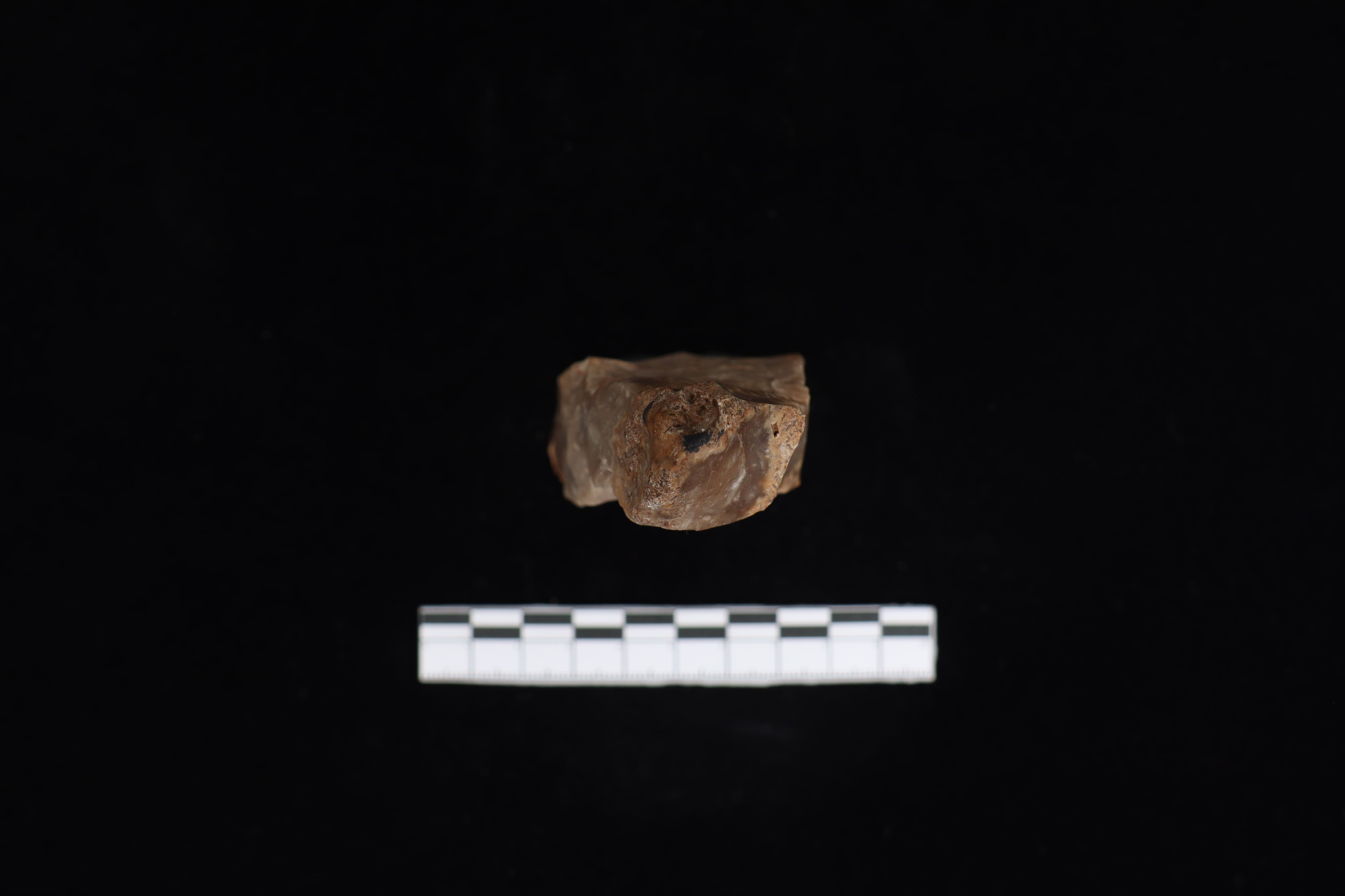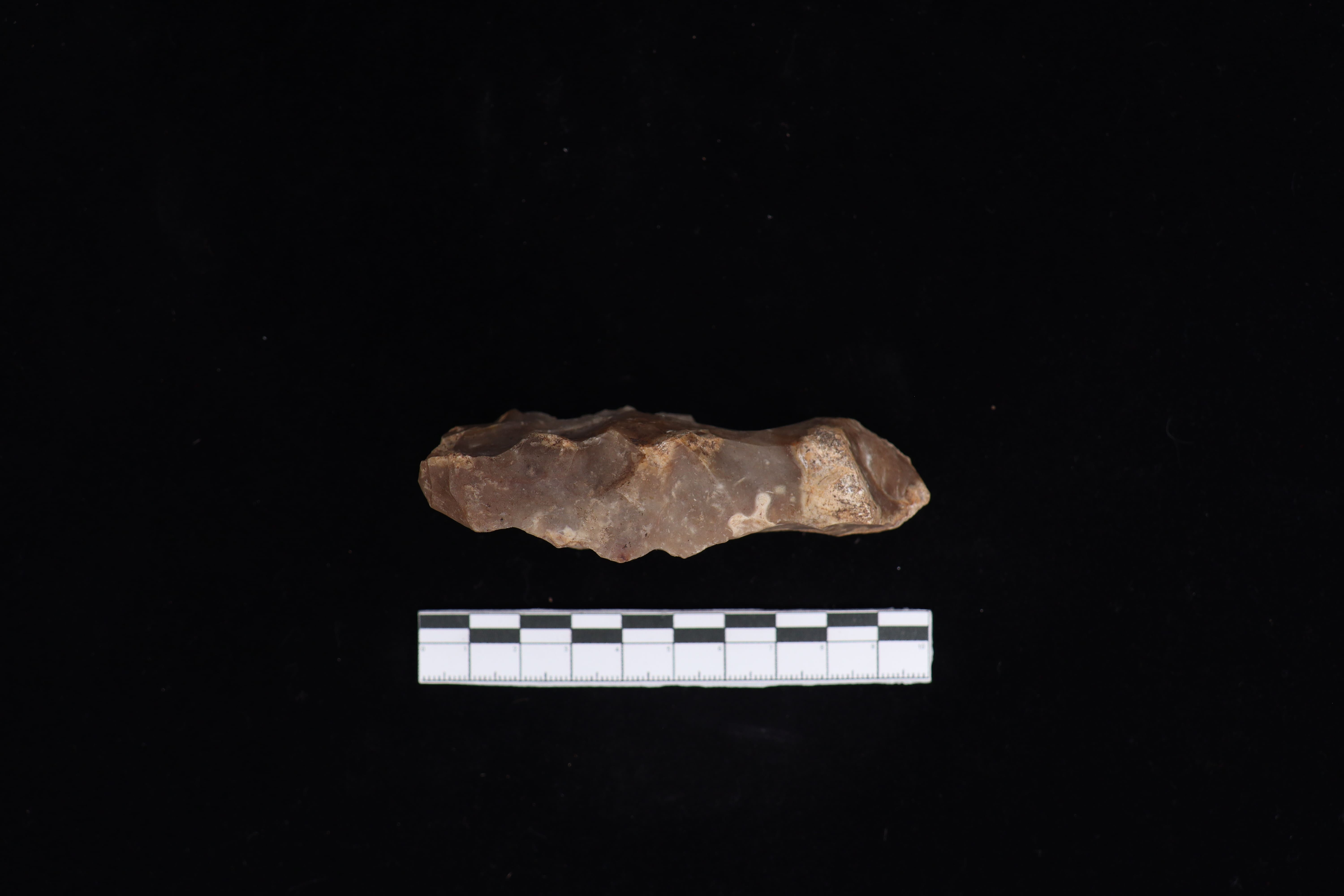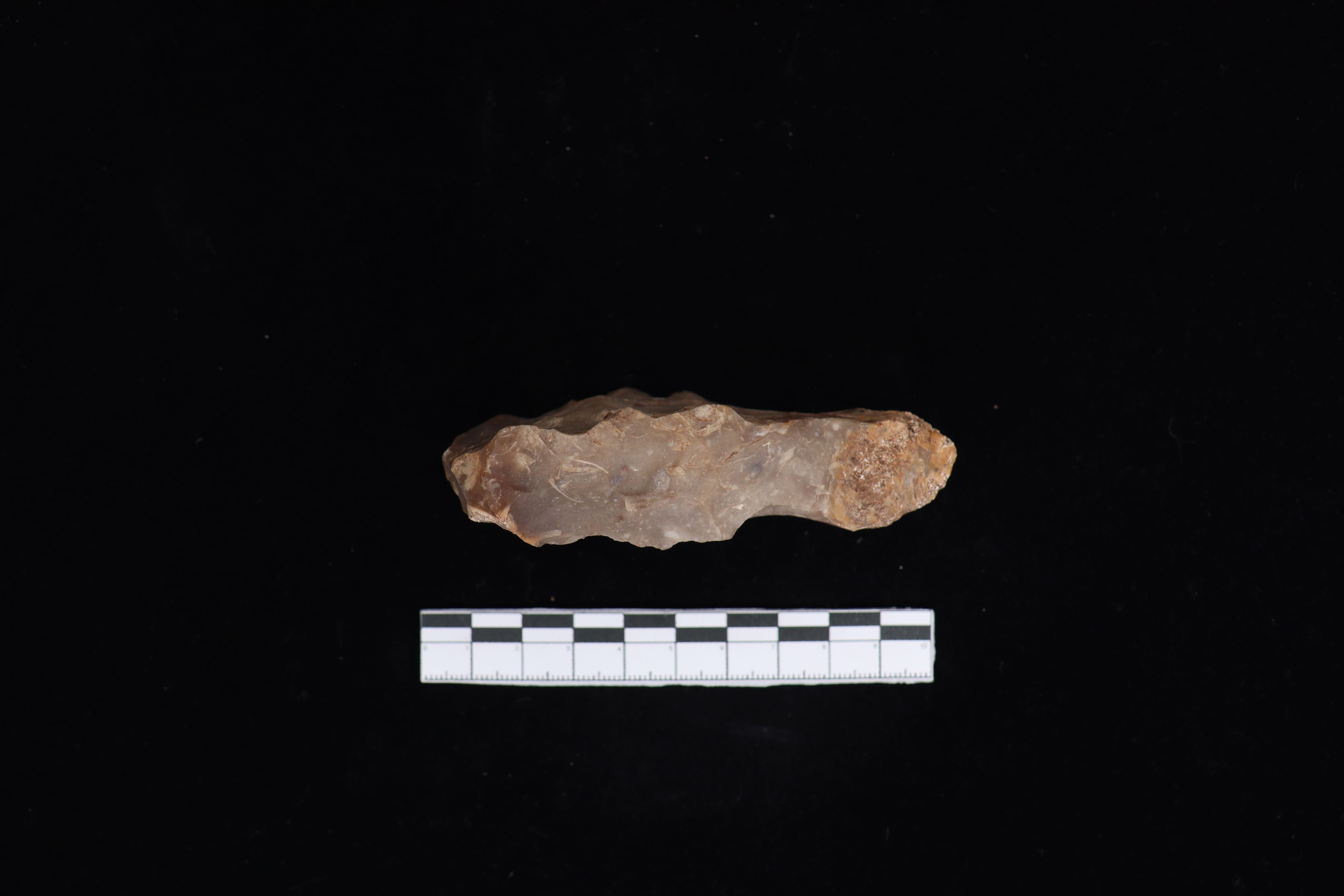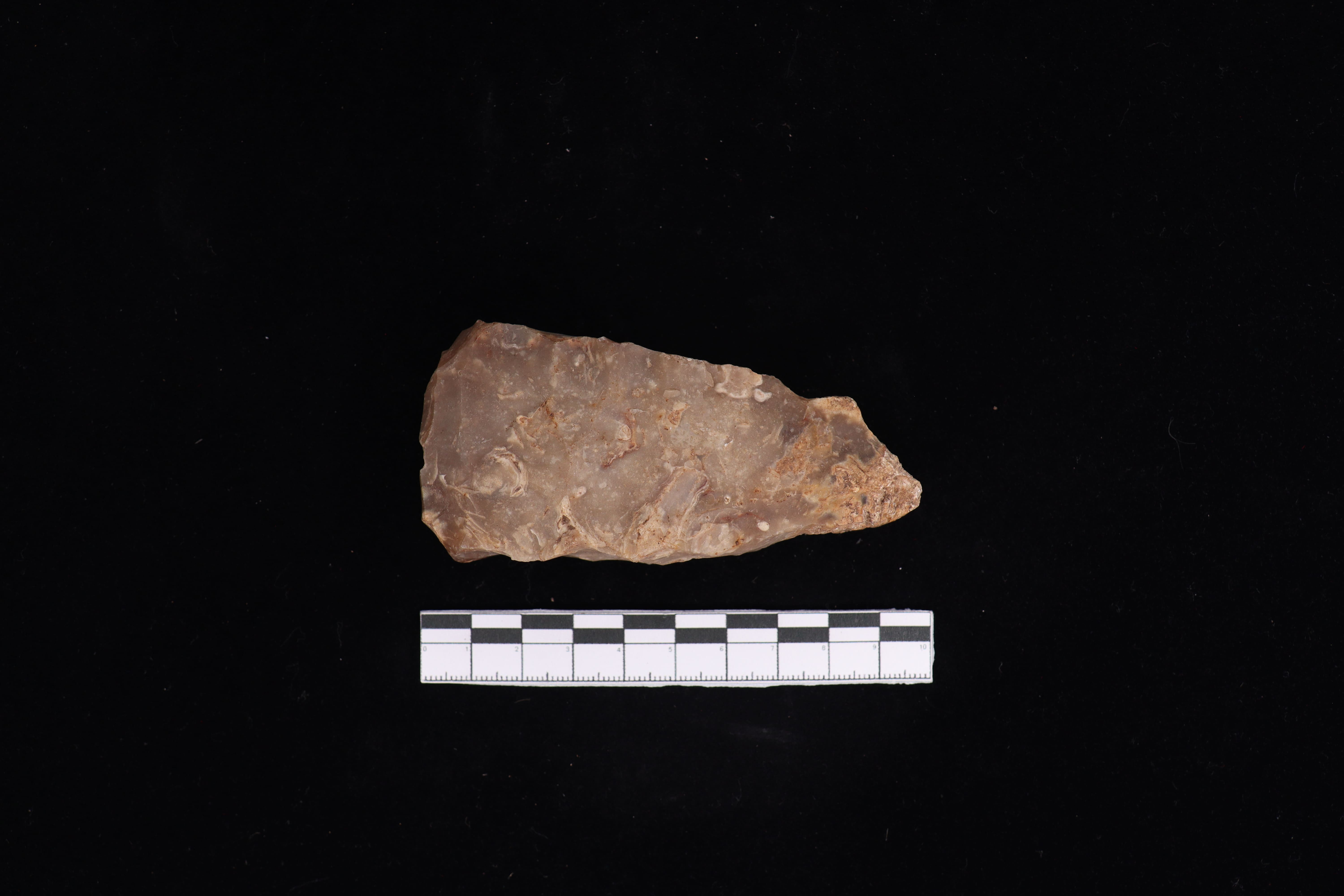 Beliung dengan keadaan utuh dan kondisi fisik yang baik ini memiliki warna dominan abu-abu dengan bagian punggung terdapat tulisan berwarna putih serta pada bagian mata tajaman yang datar. Pada bidang pangkal gagang runcing ke arah kiri serta terdapat kerak sekitar 15% . Pada sisi kiri dan kanan lurus ke bawah. Tidak memiliki teknologi penajaman dan tidak terlihat jejak bekas pakai dari masa lalu.