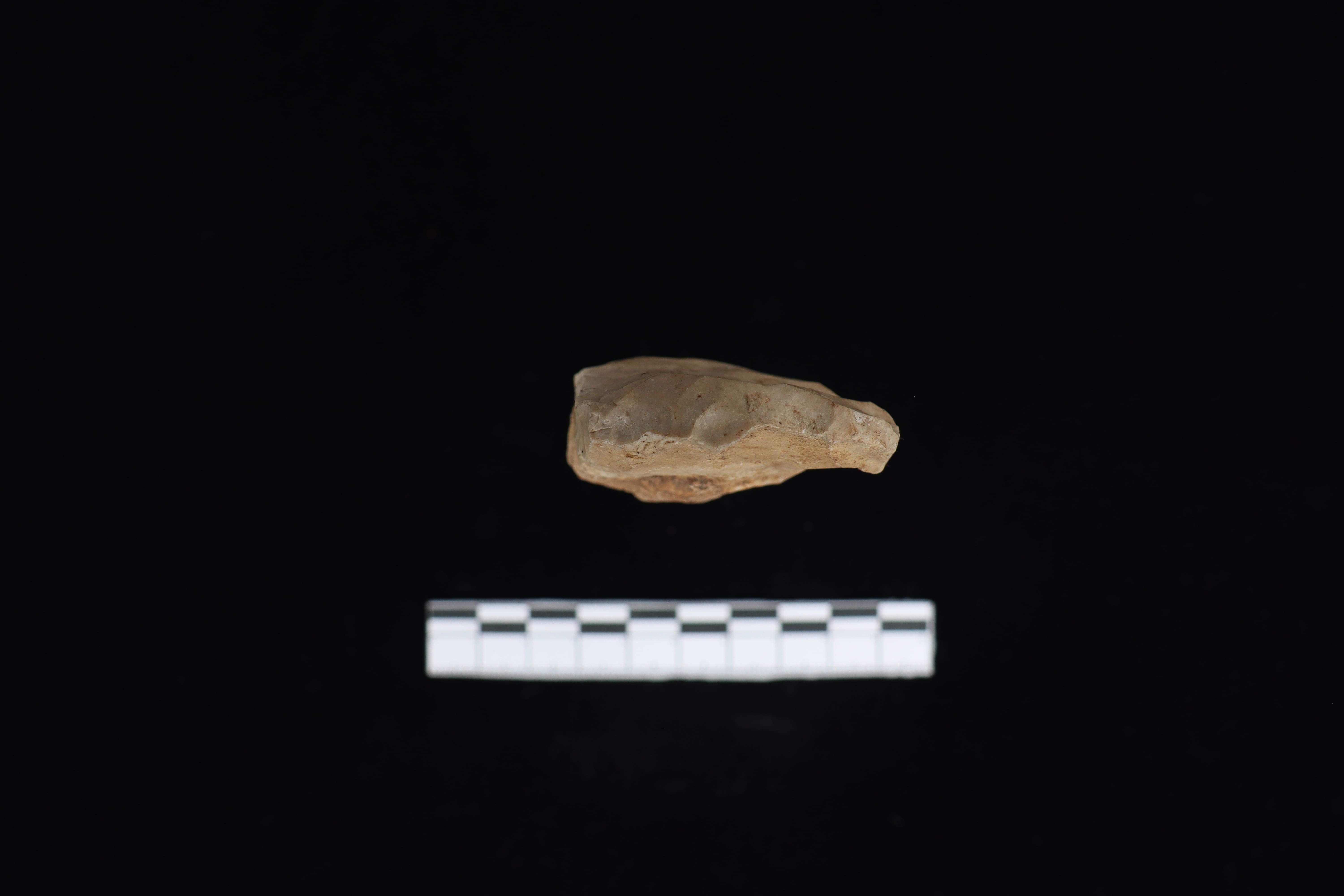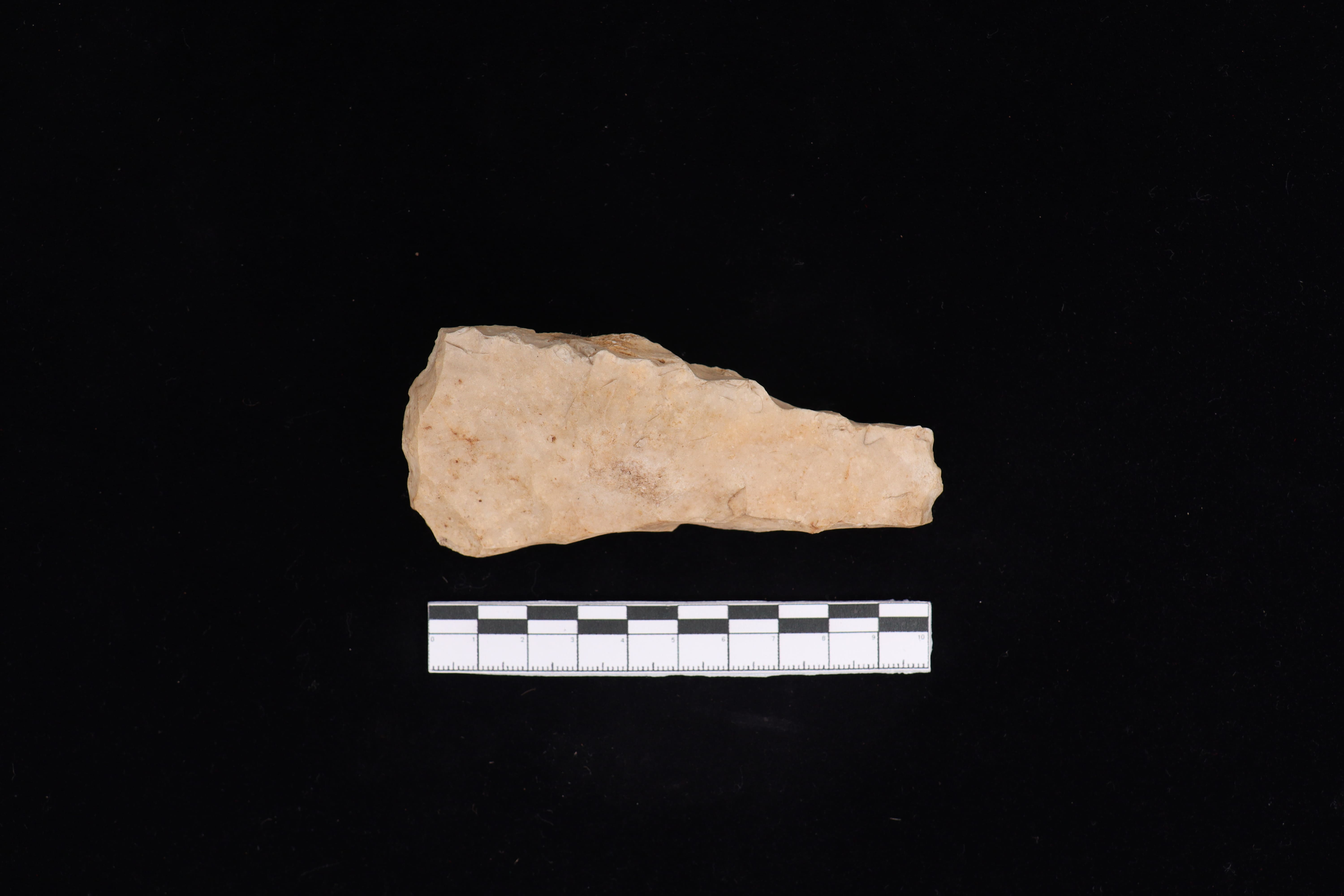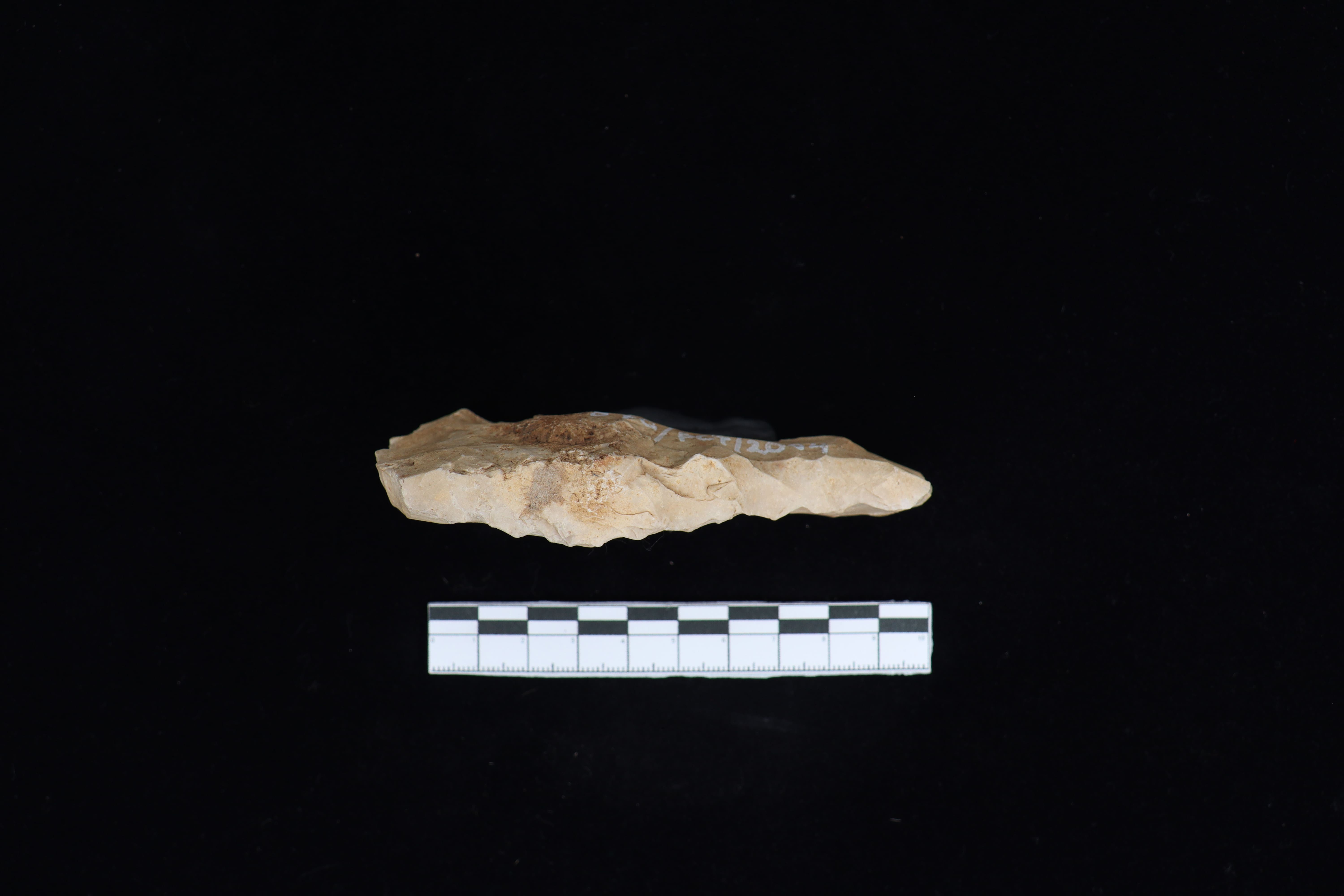 Beliung tipe atap ini dalam kondisi utuh dan fisik yang baik, koleksi dengan warna dominan coklat terang ini masih terdapat sisa residu berupa tanah yang menempel pada koleksi. pada bidang punggung terdapat tulisan berwarna putih serta kerak di bagian tengah sekitar 5%. Pangkal gagang berbentuk datar dan berukuran lebih kecil. Pada bagian sisi kiri dan kanan lurus dan melebar berlawanan ketika mendekati mata tajaman. Pada bidang bawah bagian tengah terdapat pula kerak sekitar 2%. Memiliki teknologi penajaman secara monofasial dan terdapat jejak pemakaian dari masa lalu dari retus yang sedikit bergerigi pada sisi sebelah kiri.