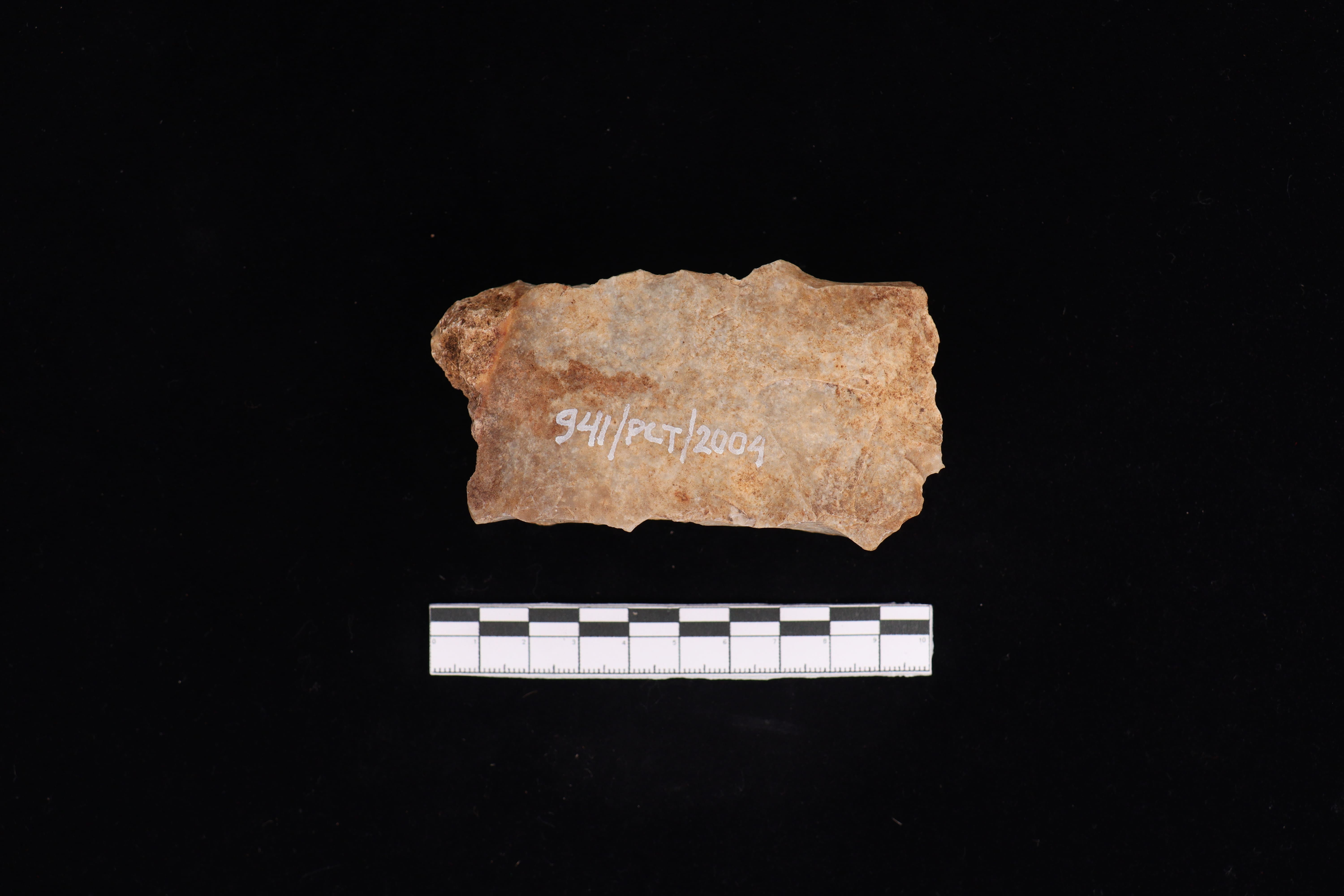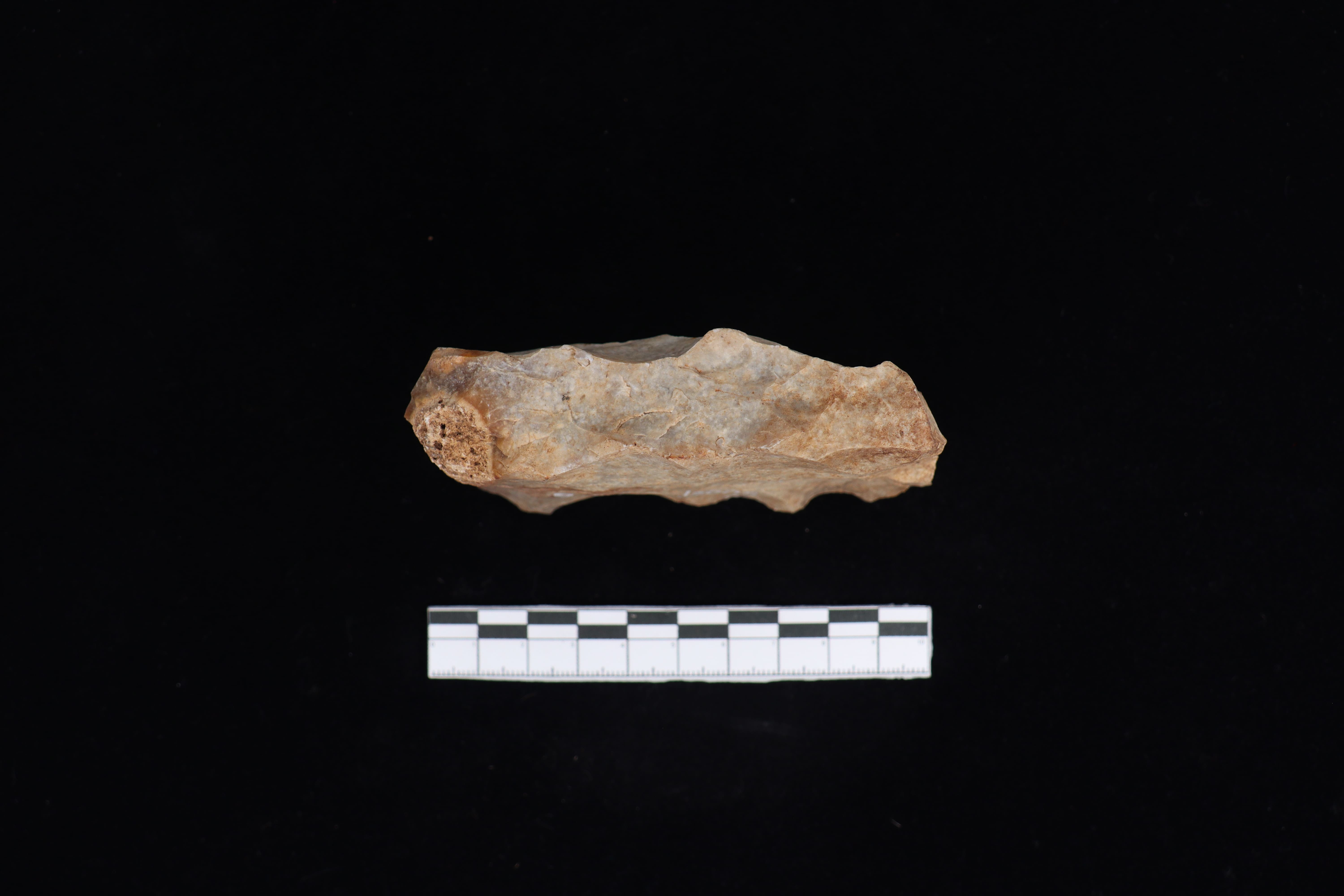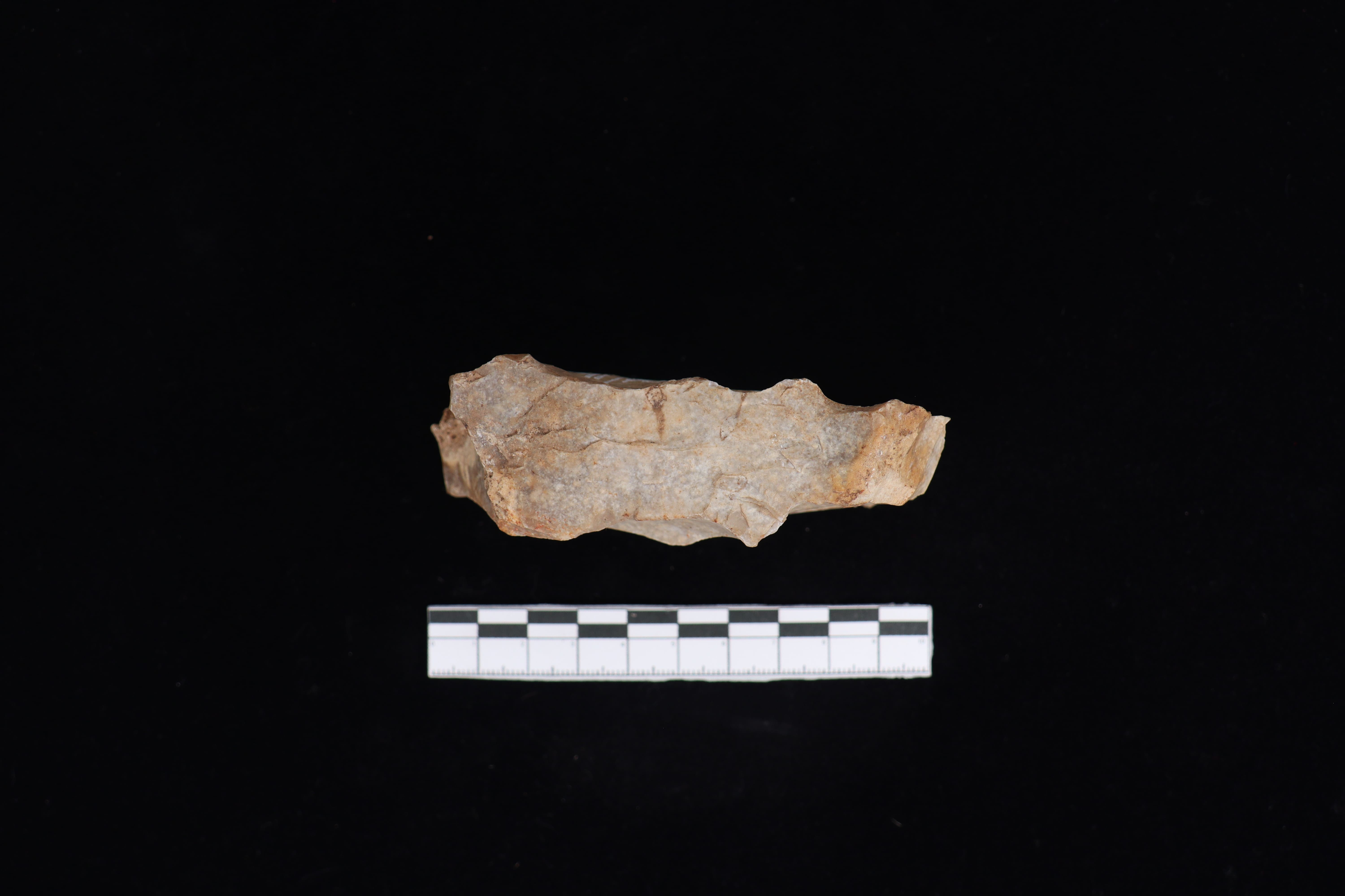 Beliung ini dalam kondisi utuh dan fisik yang baik, koleksi dengan warna dominan abu-abu muda ini memiliki kerak serta lubang-lubang kecil pada bagian pangkal gagang yang bentuknya jika dilihat dari atas sedikit cekung dan menurun ke arah kiri. Pada bidang punggung terdapat pula lubang kecil dan kerak sekitar 1%. Pada sisi kiri dan kanan berbentuk lurus ke bawah. Memiliki teknologi penajaman secara monofasial dan terdapat jejak bekas pakai yang sedikit bergerigi.