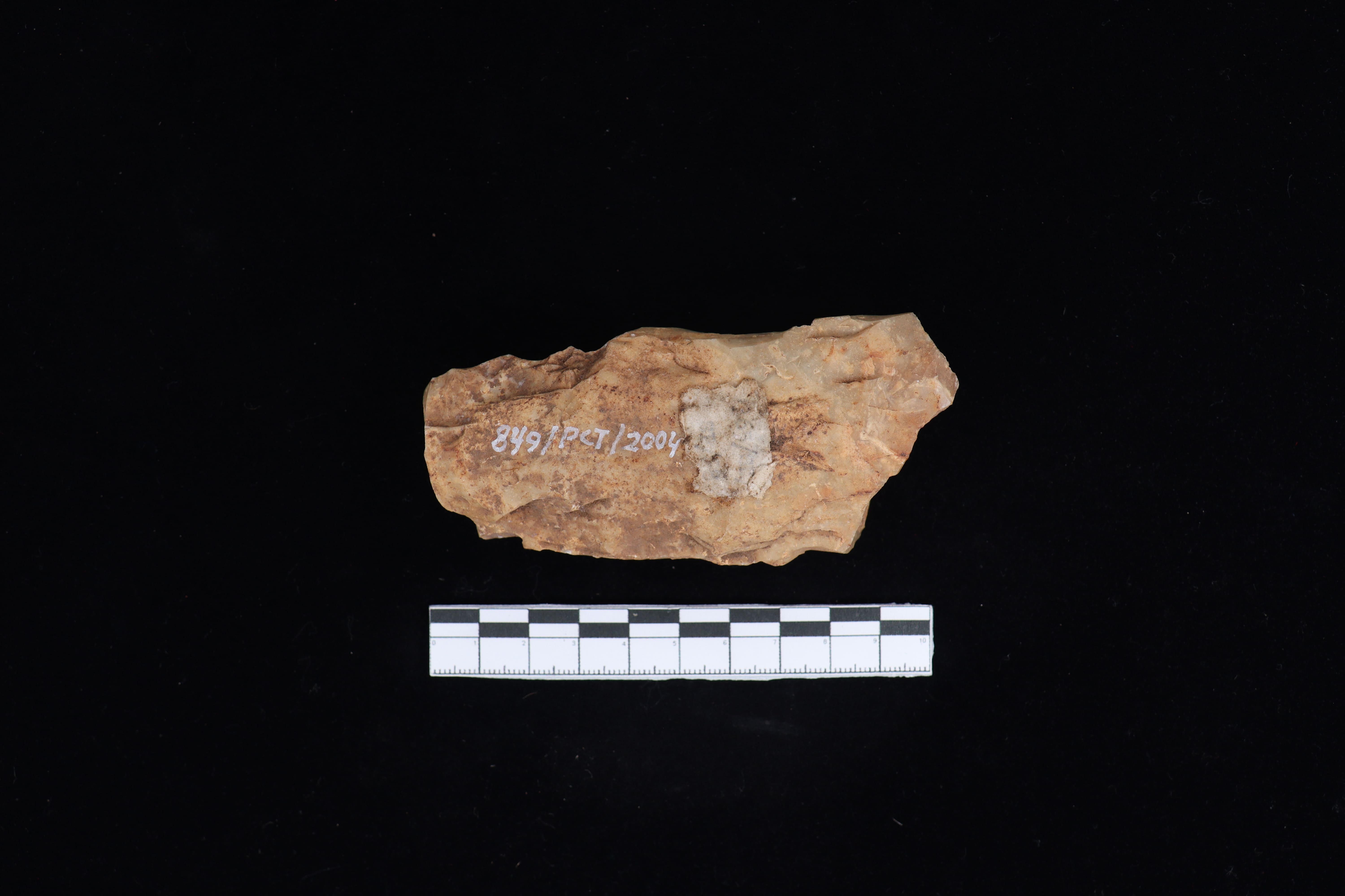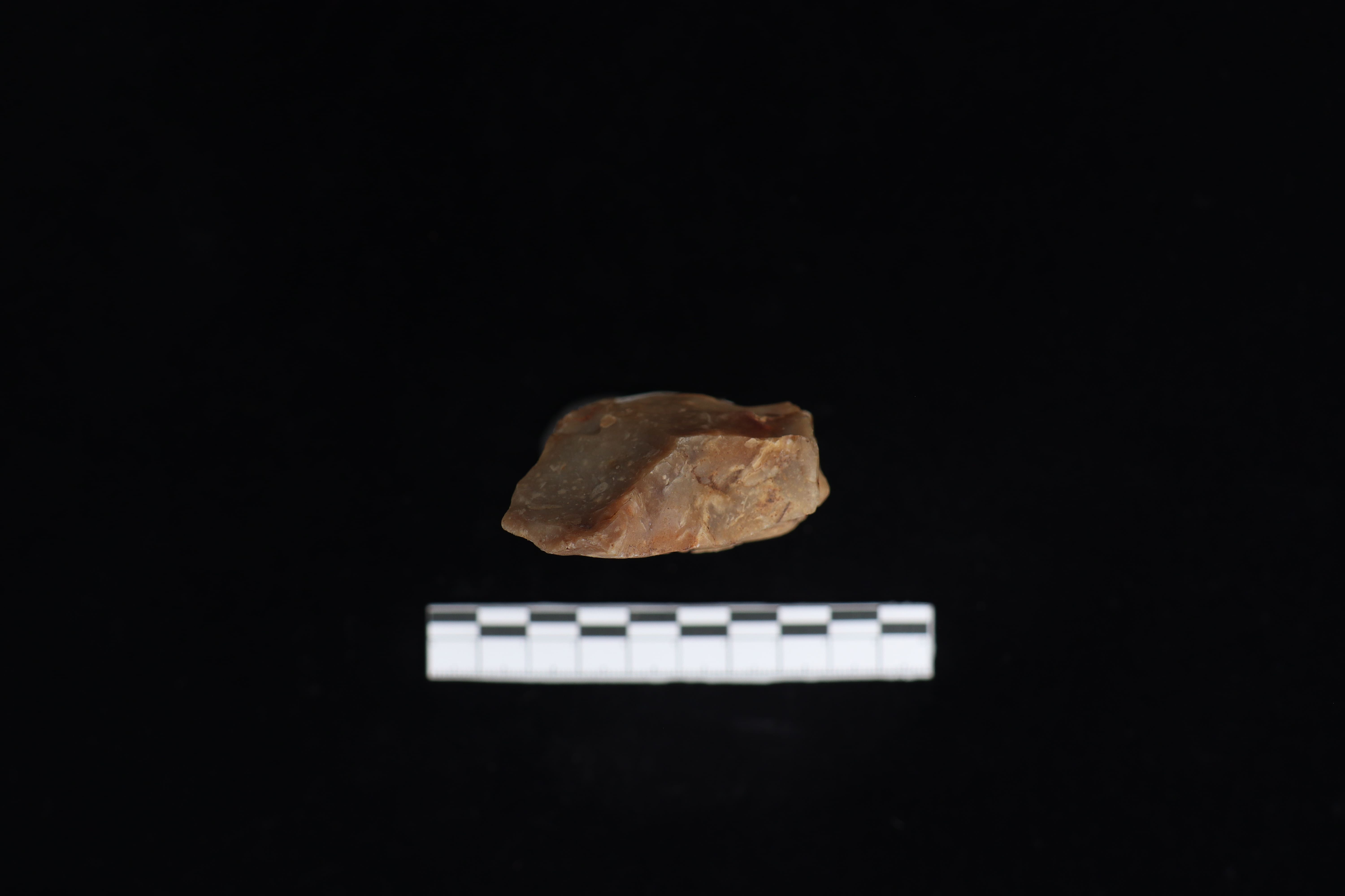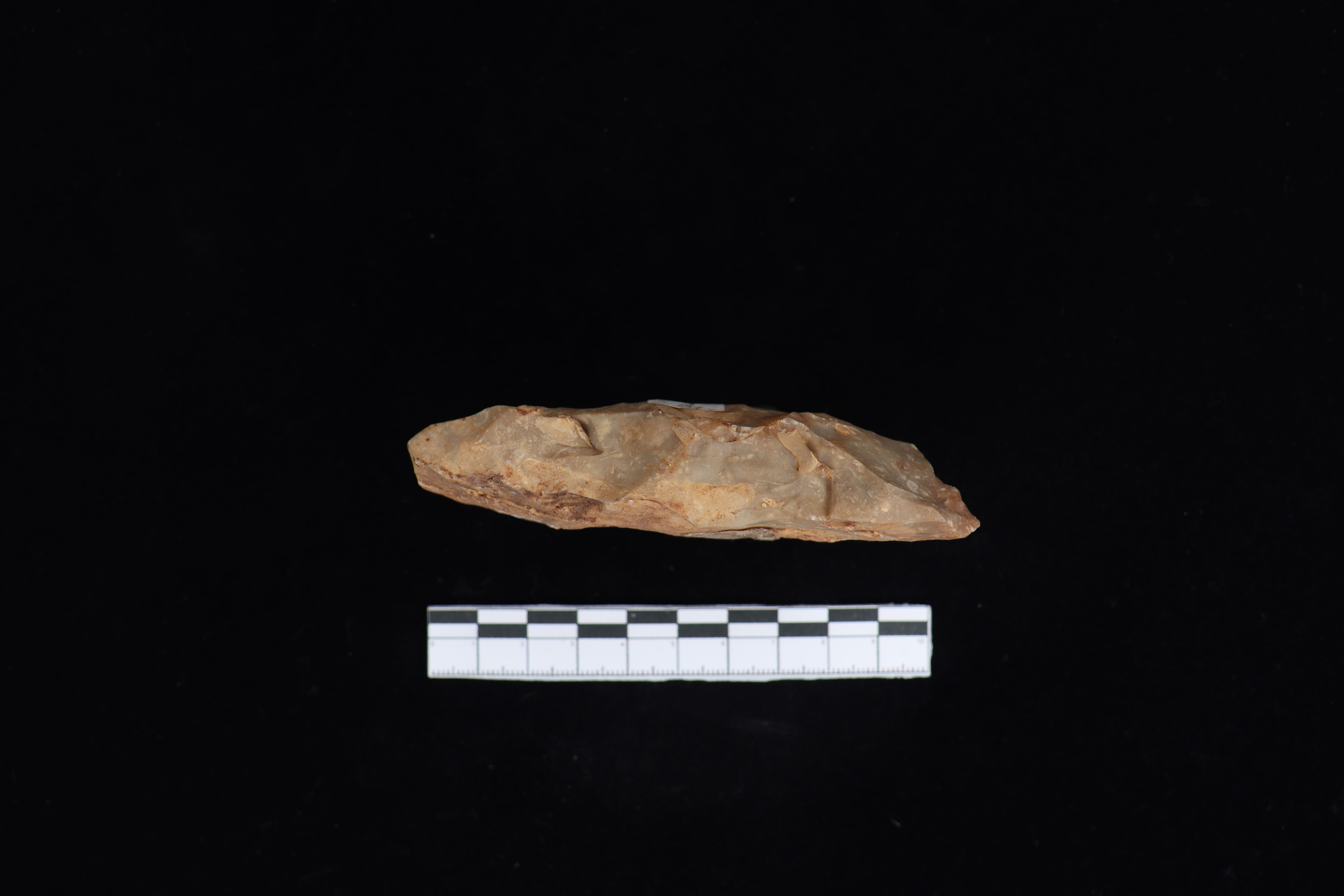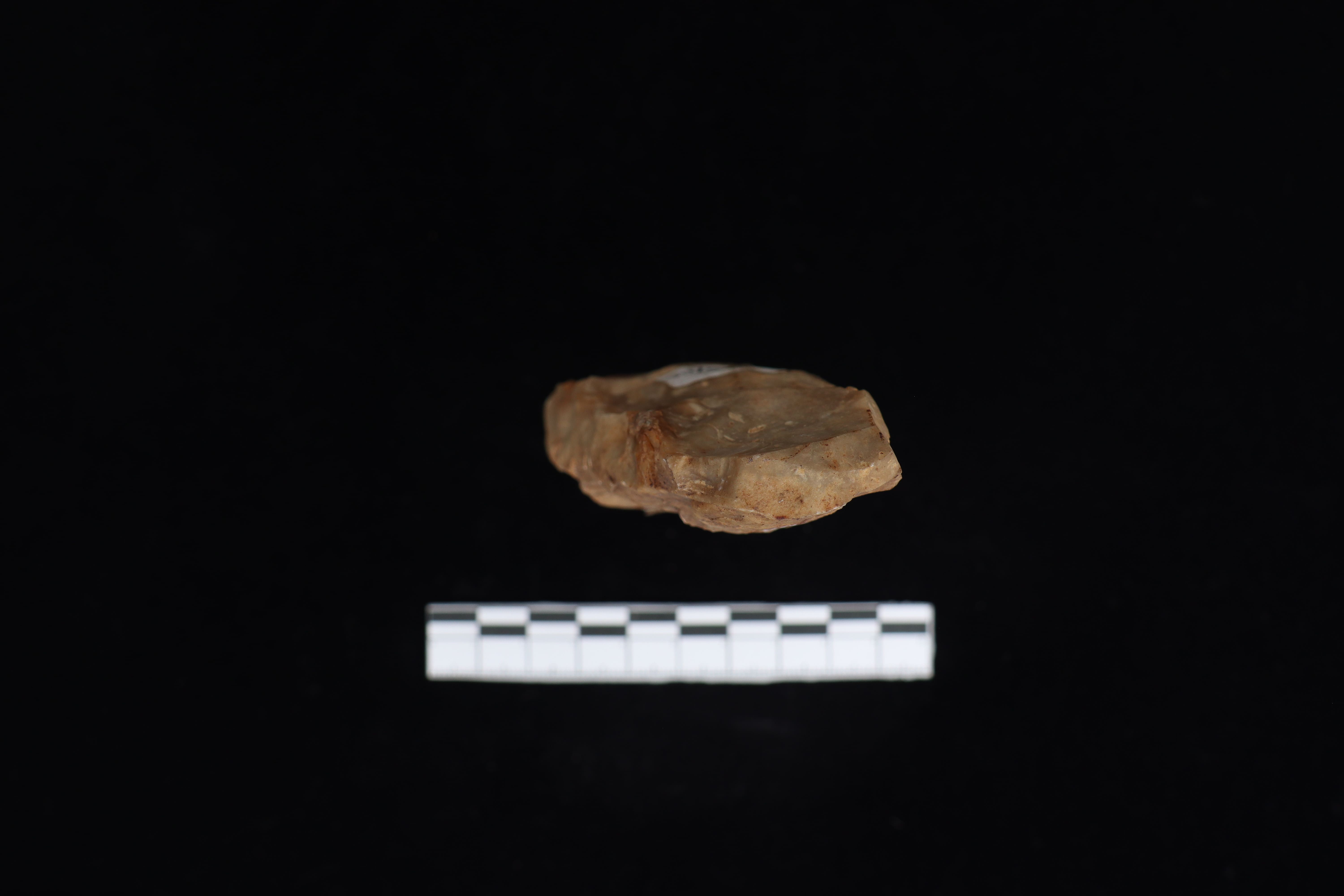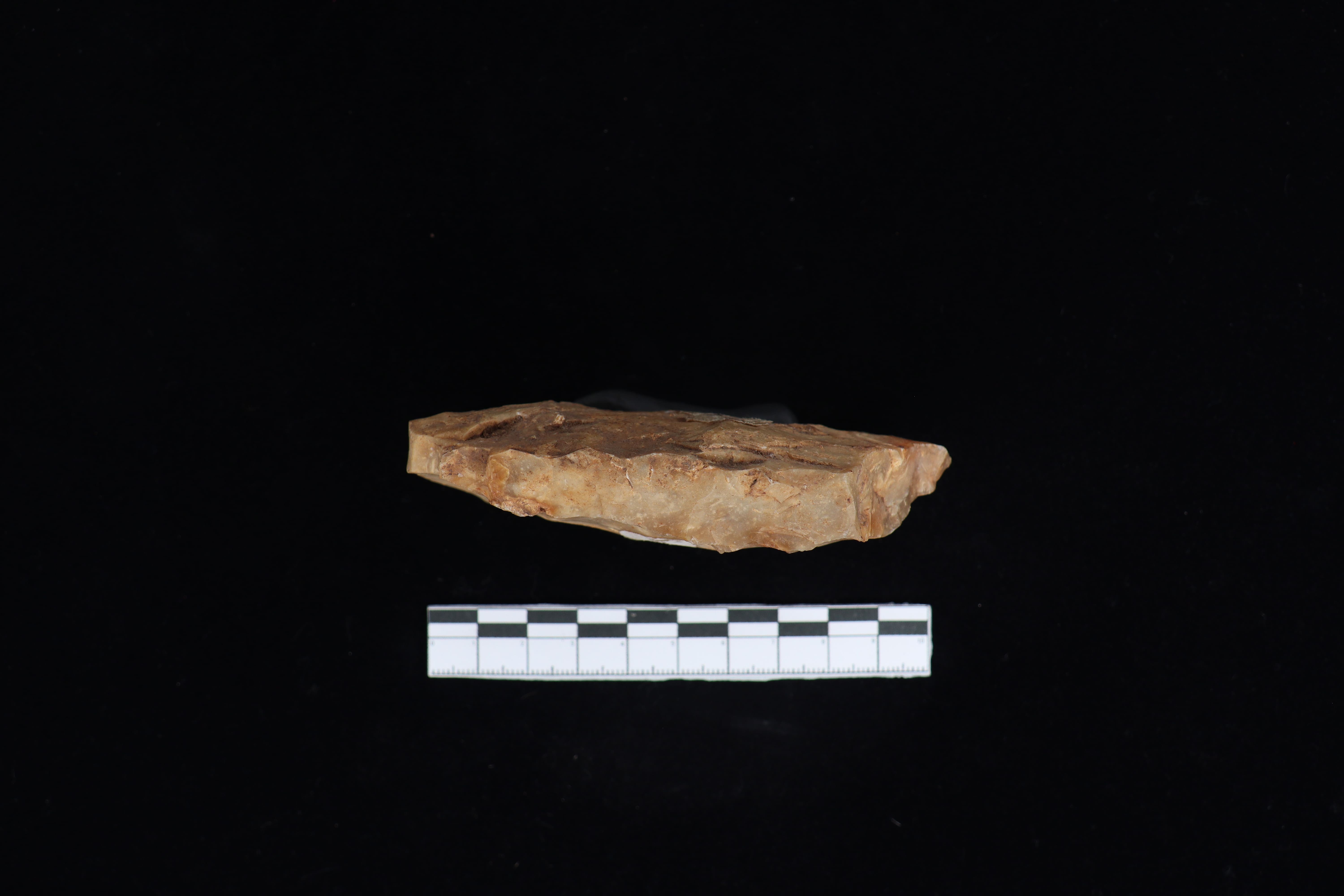 Beliung dengan kondisi baik ini memiliki warna dominan coklat, namun pada koleksi masih terdapat sisa residu berupa tanah yang menempel. Pada bidang punggung terdapat label yang menempel pada bagian tengah dan mata tajaman yang tidak lengkap karena hanya menyisakan sisi sebelah kiri saja. Pada pangkal gagang berbentuk datar. Bidang bawah terdapat tulisan berwarna putih dan label yang menempel. Sisi kiri dan kanan lurus ke bawah. Memiliki teknologi penajaman secara monofasial dan terdapat jejak bekas pakai pada mata tajaman sebelah kiri.