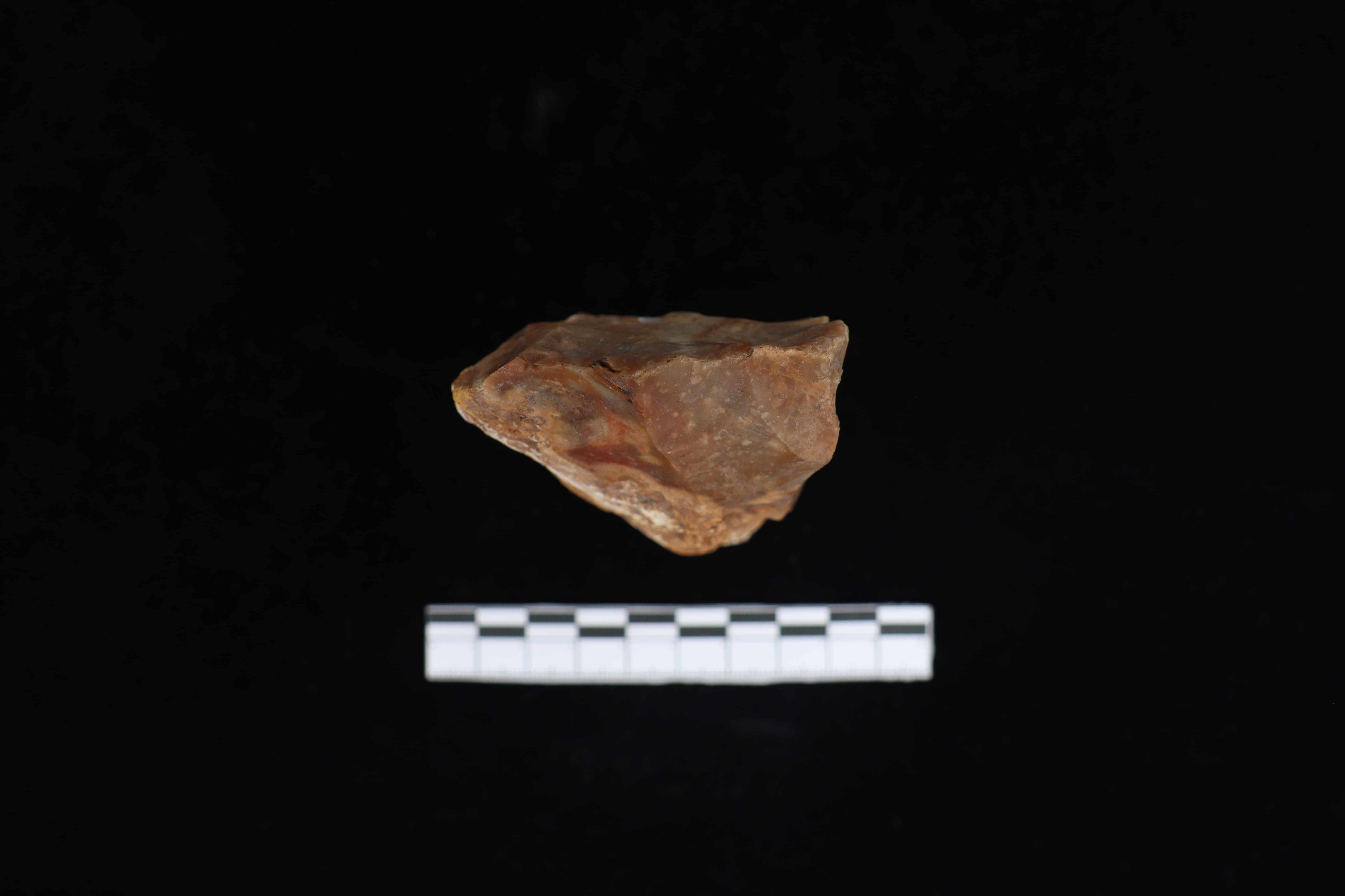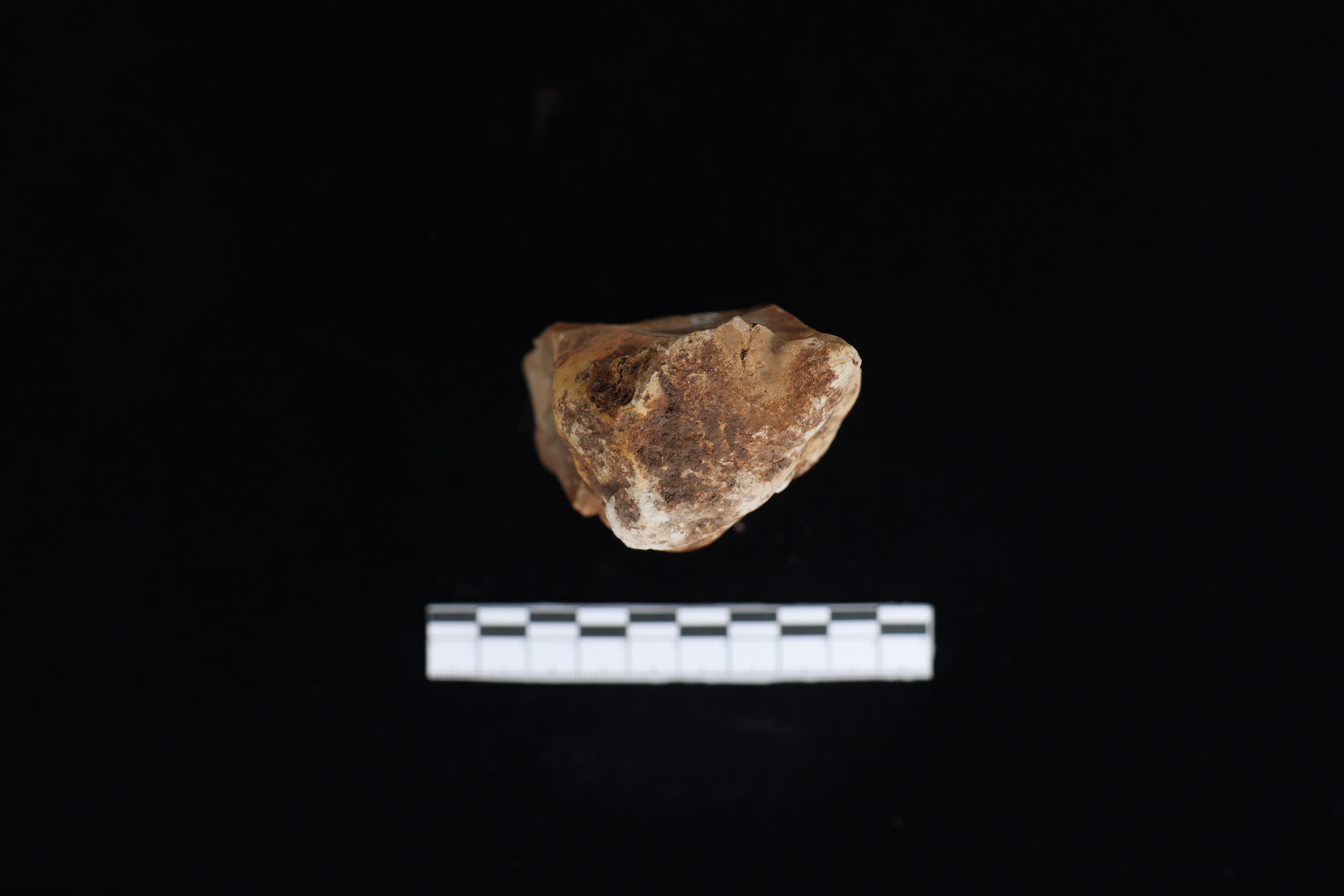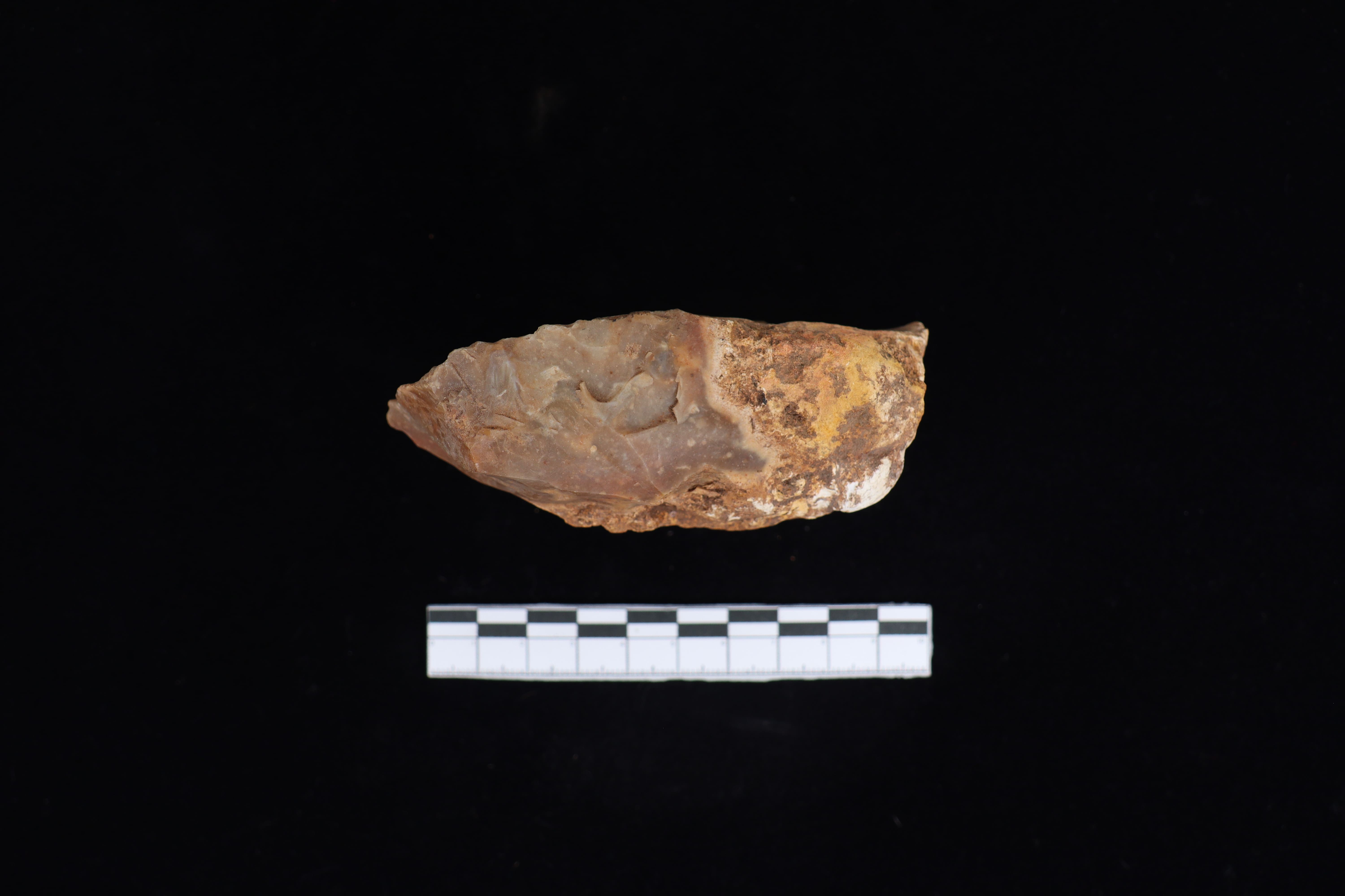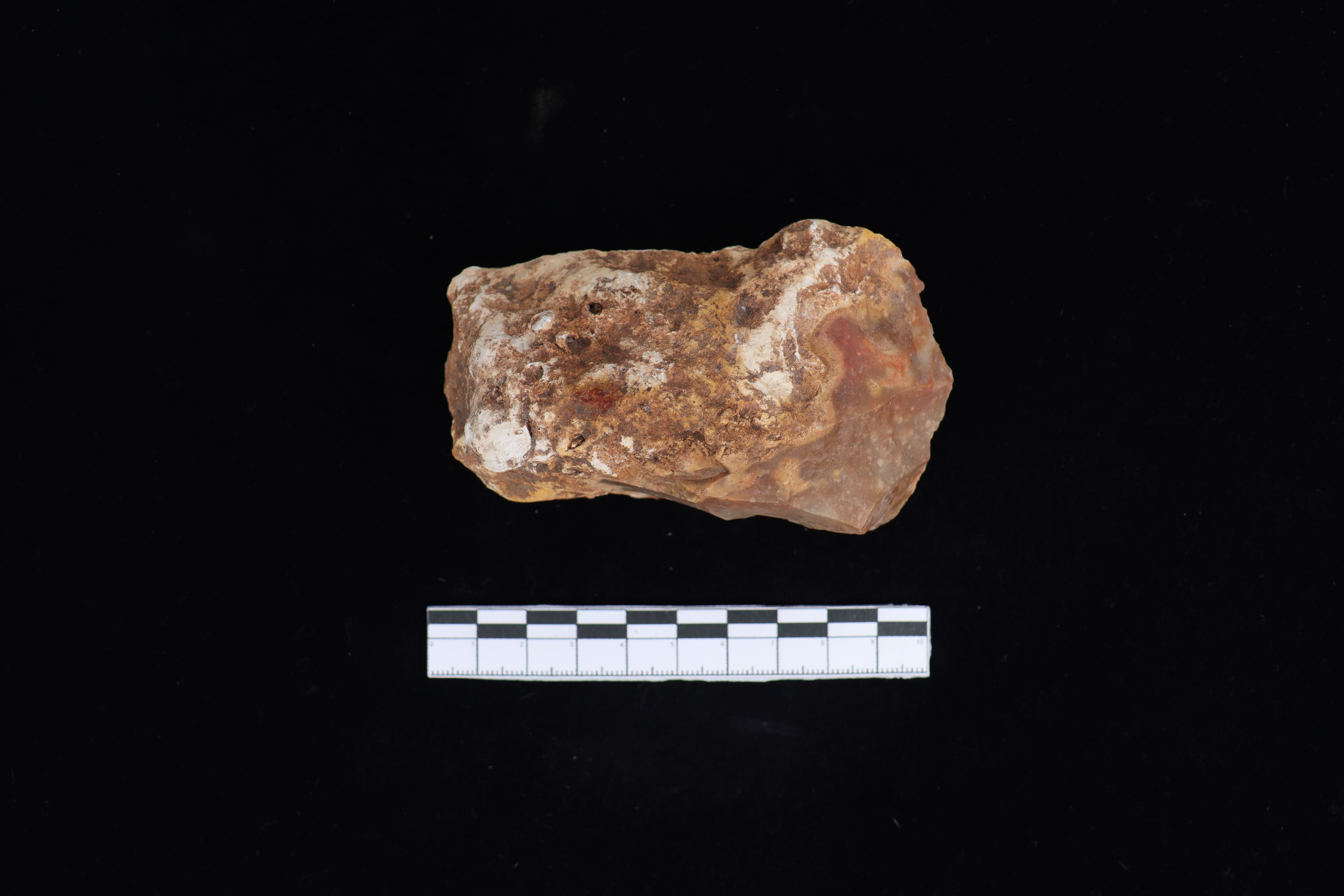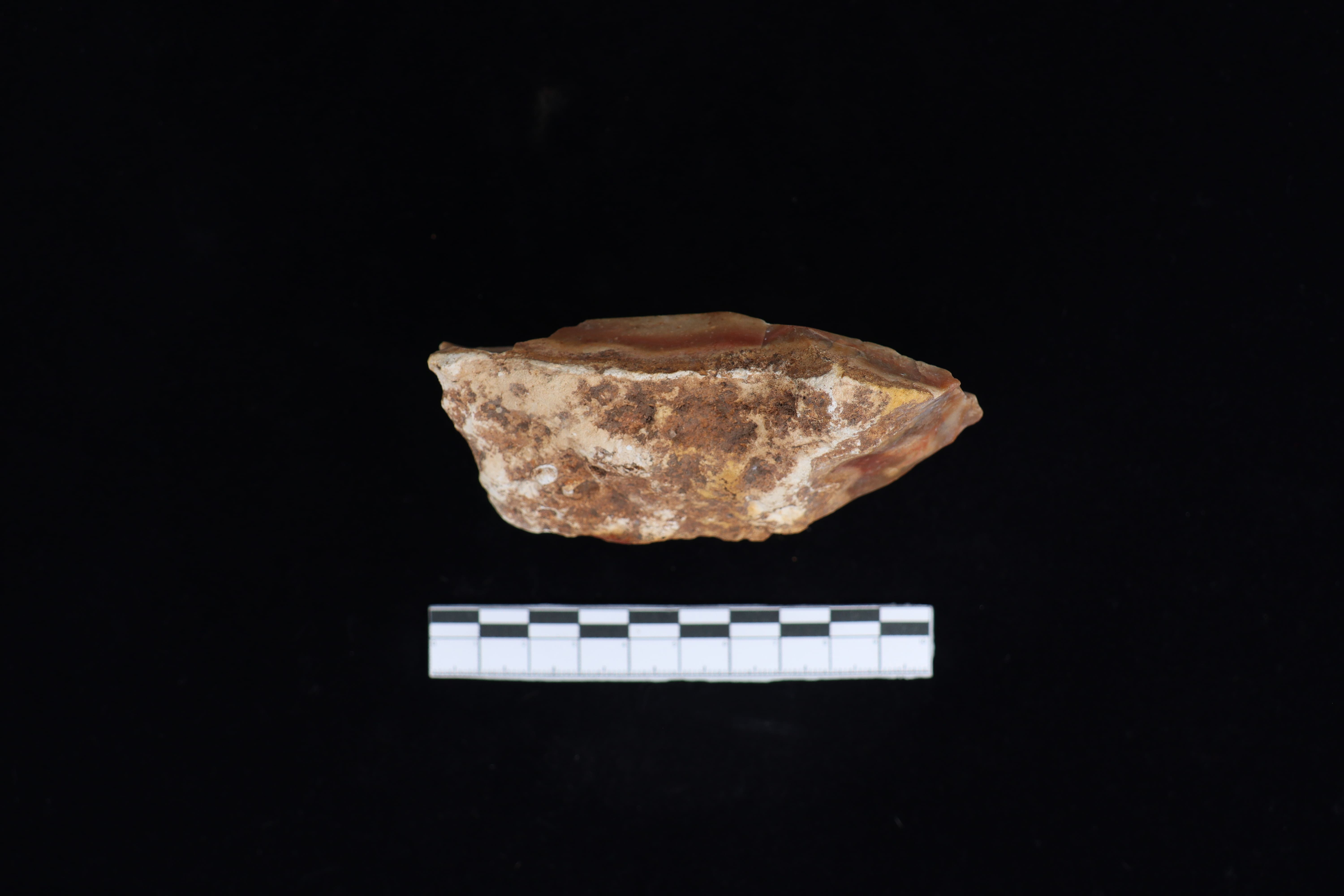 Beliung ini dalam kondisi utuh dan fisik yang baik, koleksi dengan warna dominan coklat sedikit kemerahan ini masih meninggalkan residu yang menempel berupa tanah pada tubuh koleksi. pada bidang punggung ditemui banyak kerak sekitar 45%, selain itu punggung ini tidak datar namun sedikit menonjol dan menurun dari bagian tengah di sisi kiri dan kanan nya. Pangkal gagang berbentuk datar. Pada bidang bawah terdapat tulisan berwarna putih dan berbentuk datar. Memiliki teknologi penajaman secara monofasial serta terlihat jejak sisa pakai dari masa lalu.