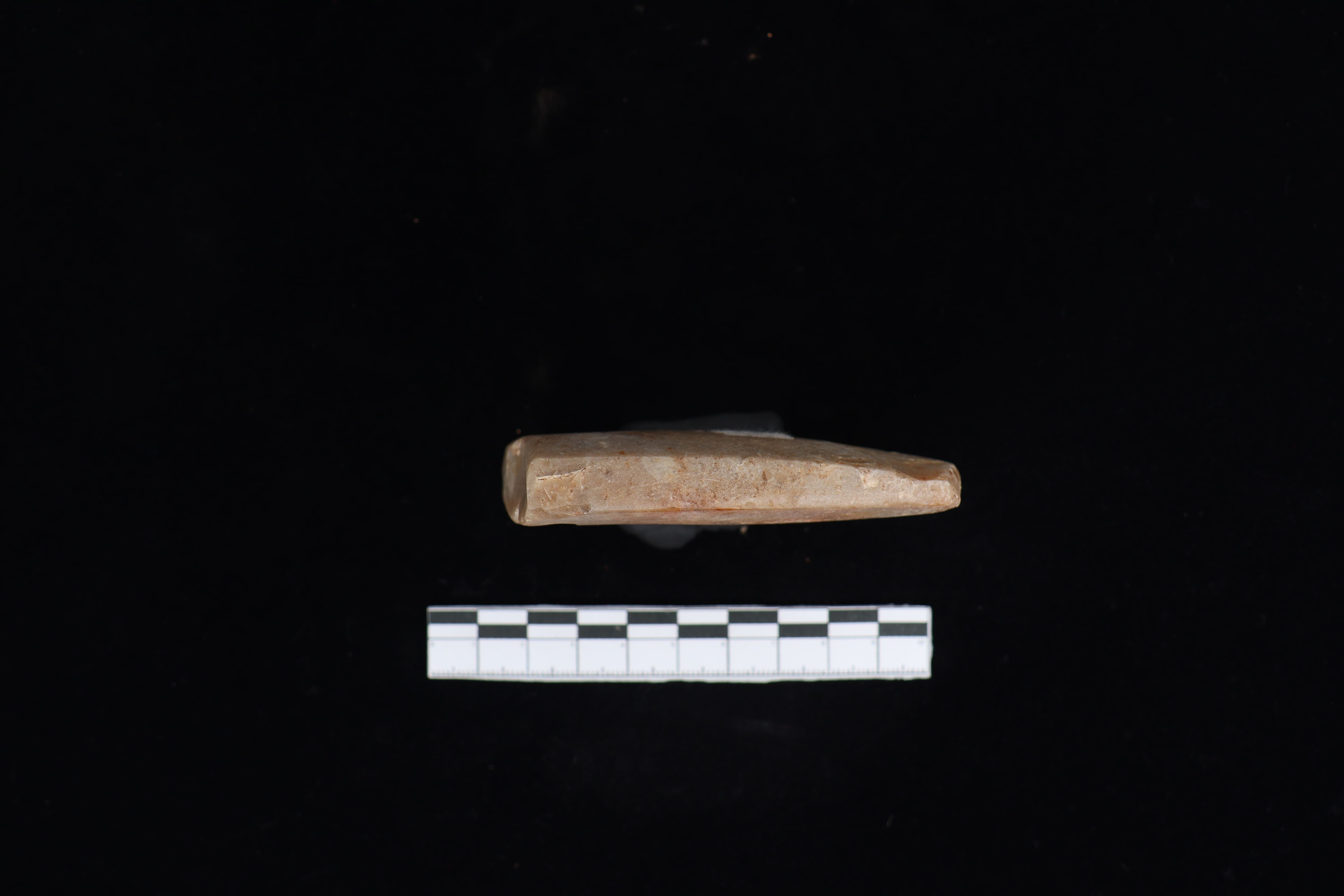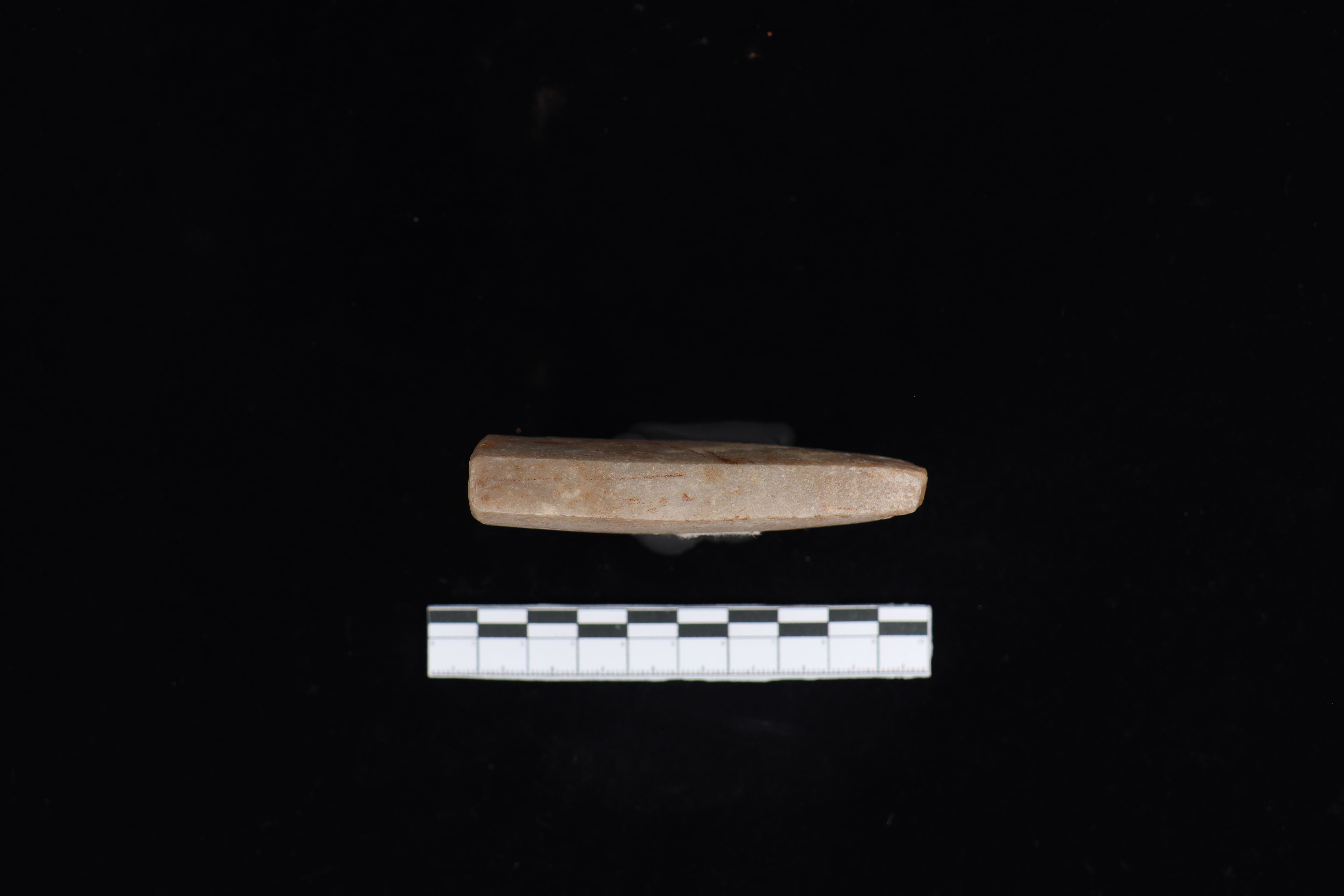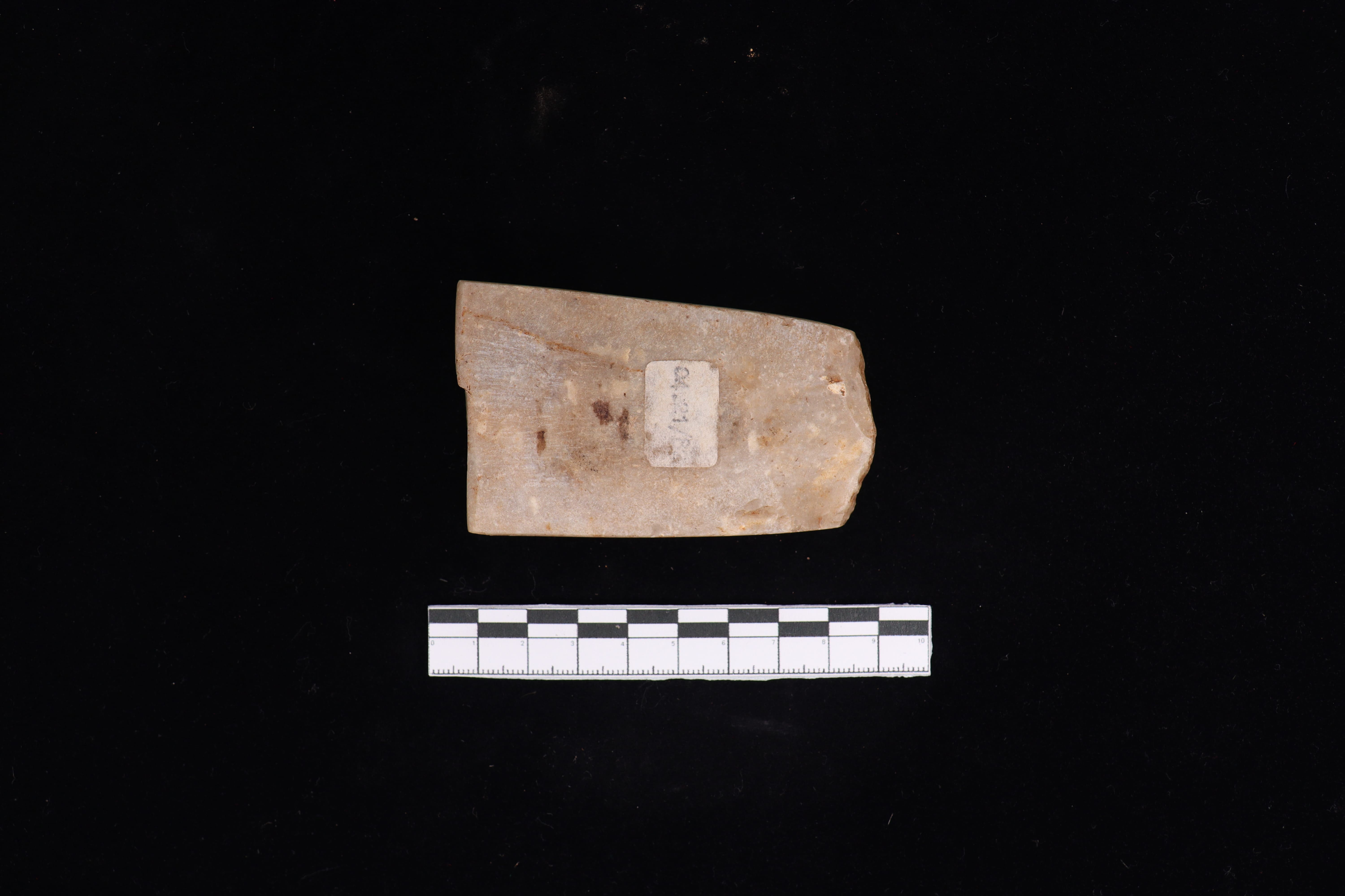 Beliung dengan kondisi fisik yang baik namun tidak utuh. Pada bidang punggung terdapat tulisan berwarna putih. Sedang pada bidang bawah terdapat label yang menempel selain itu pada gagang juga berbentuk datar. Sisi kanan dan kiri lurus ke bawah. beliung ini sudah di upam seluruhnya namun pada bagian gagang kemungkinan patah. Terdapat jejak penajaman secara bifasial dan terdapat jejak pakai dari masa lalu.