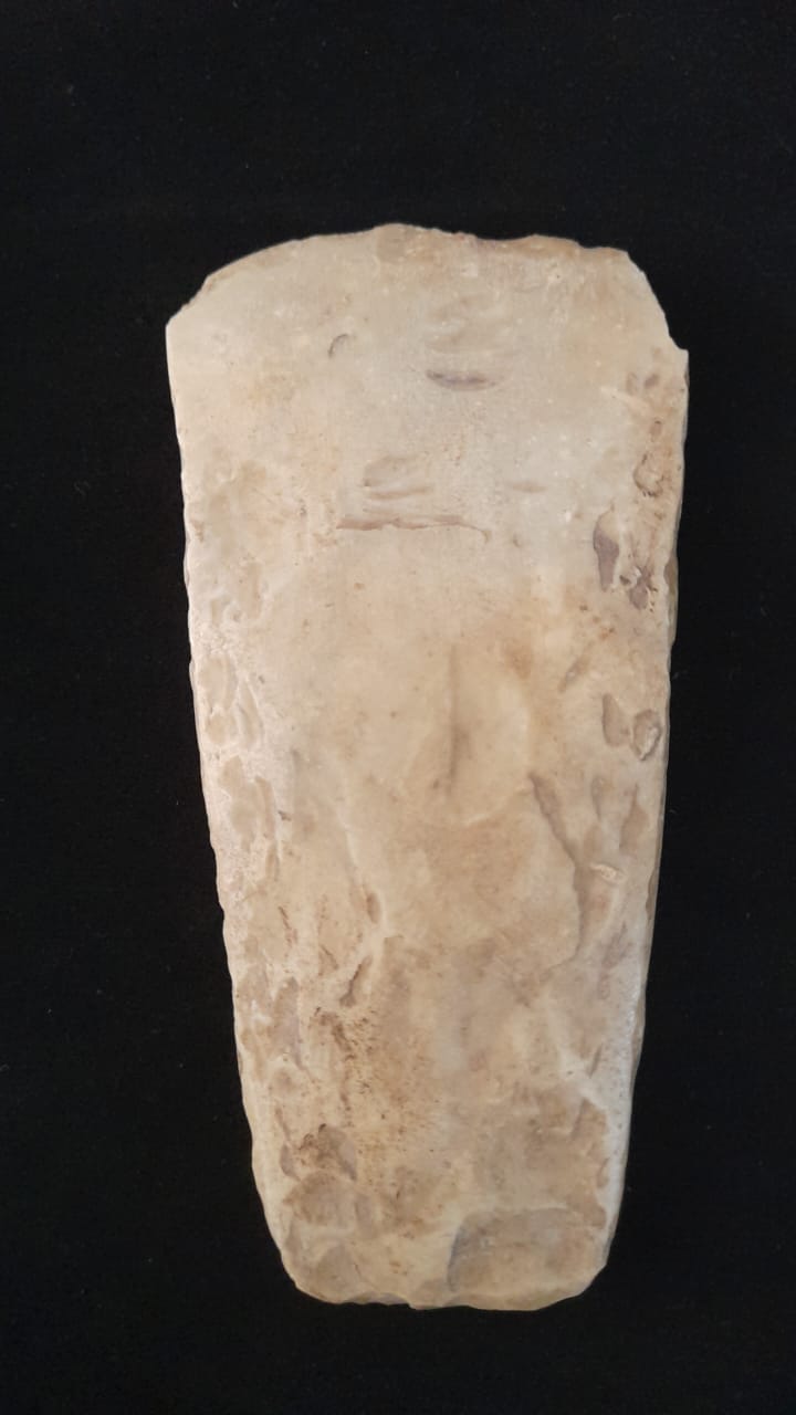 Koleksi ini merupakan Beliung Persegi dengan kondisi koleksi Bagian depan terdapat gradasi warna, Bagian Belakang terdapat nomor temuan warna putih, teknik pemangkasan koleksi ini monofasial dan dalam pengerjaannya tidak dihaluskan. Lalu Bagian Proximal/Atas berbentuk lancip dan Distal/Bawah terdapat sedikit retusan cenderung.
