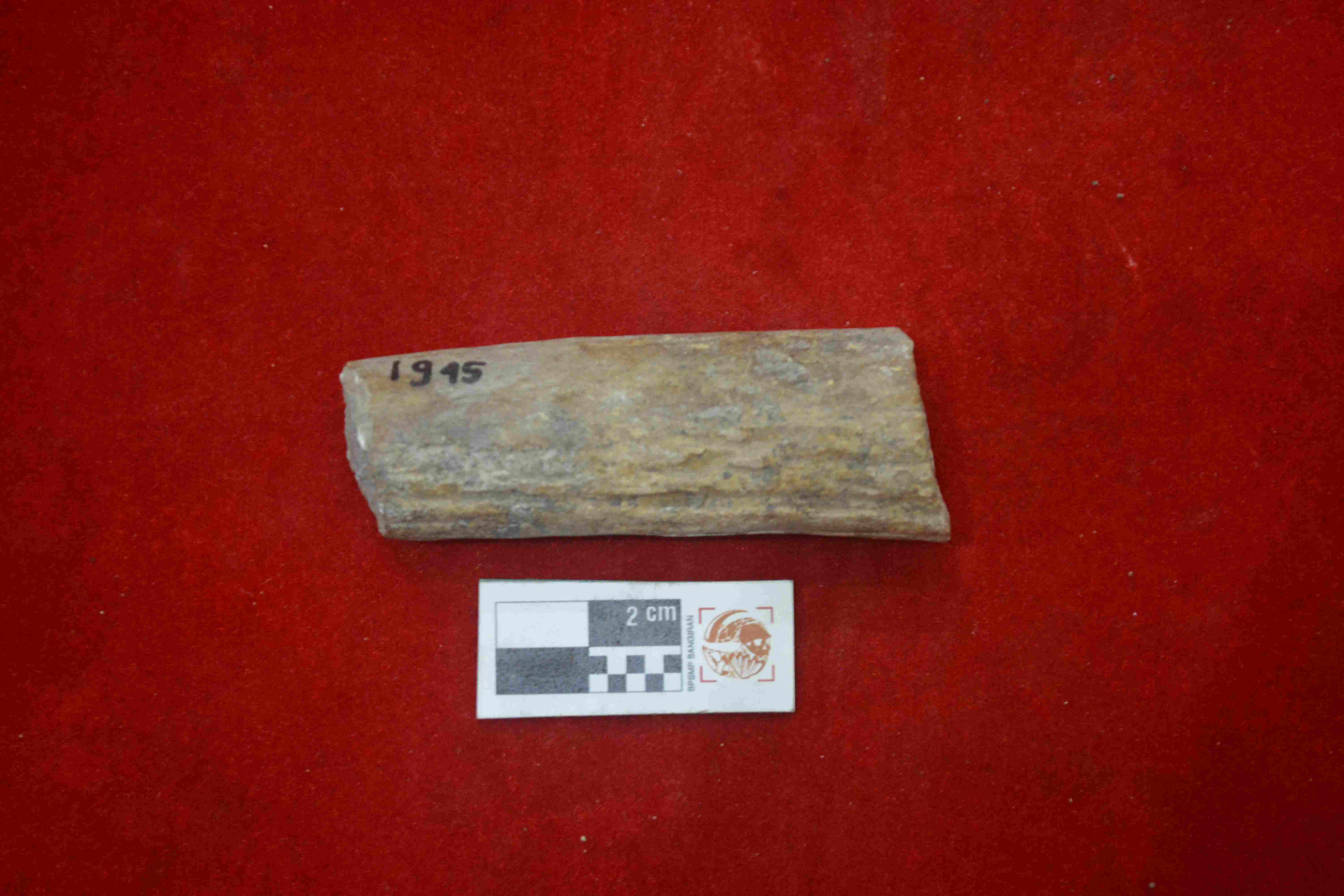 Beliung dengan bentuk utuh dan kondisi fisik yang baik ini memiliki warna dominan abu-abu muda, namun terdapat sisa residu berupa tanah yang masih menempel. Pada bidang punggung memiliki permukaan yang tidak begitu rata namun berbentuk datar. Bagian bilah terlihat sangat jelas. Pangkal gagang berbentuk datar dan permukaan yang rata. Pada bidang bawah terdapat tulisan berwarna hitam dan putih dengan ukuran sedang. Sisi kiri dan kanan memiliki permukaan yang tidak begitu rata. Memiliki teknologi penajaman secara monofasial namun tidak dihaluskan dan terdapat jejak pakai retus di mata tajamaan.