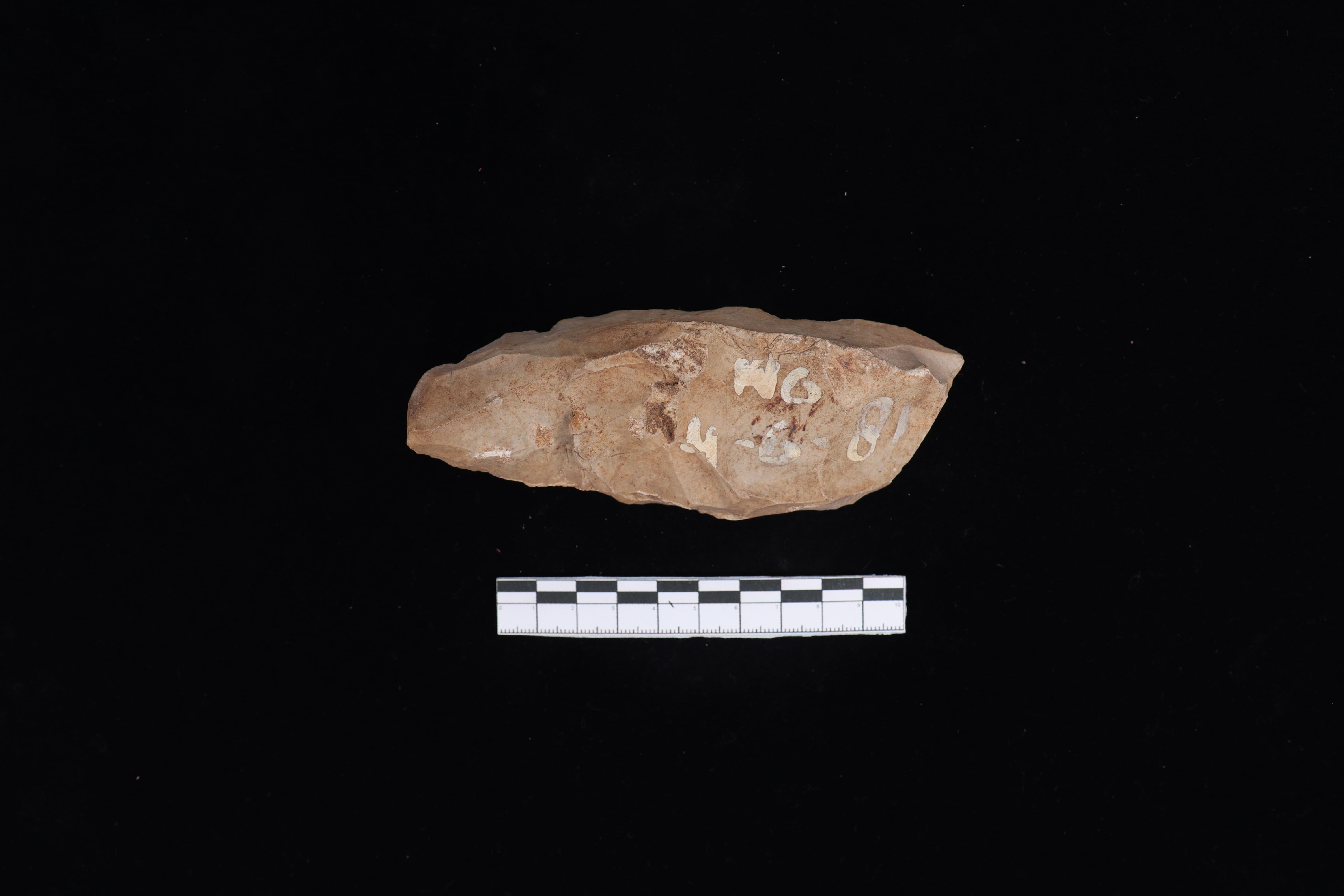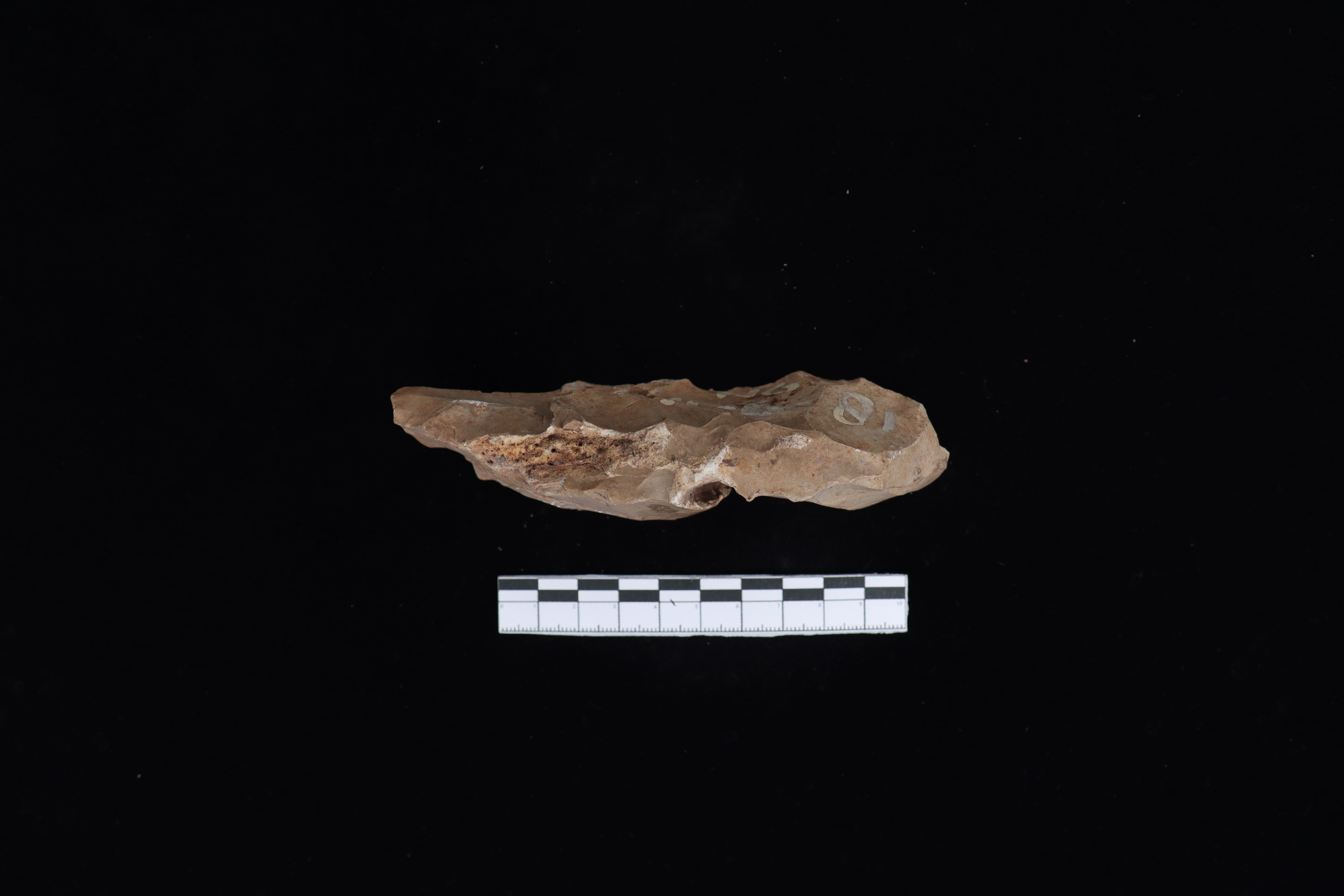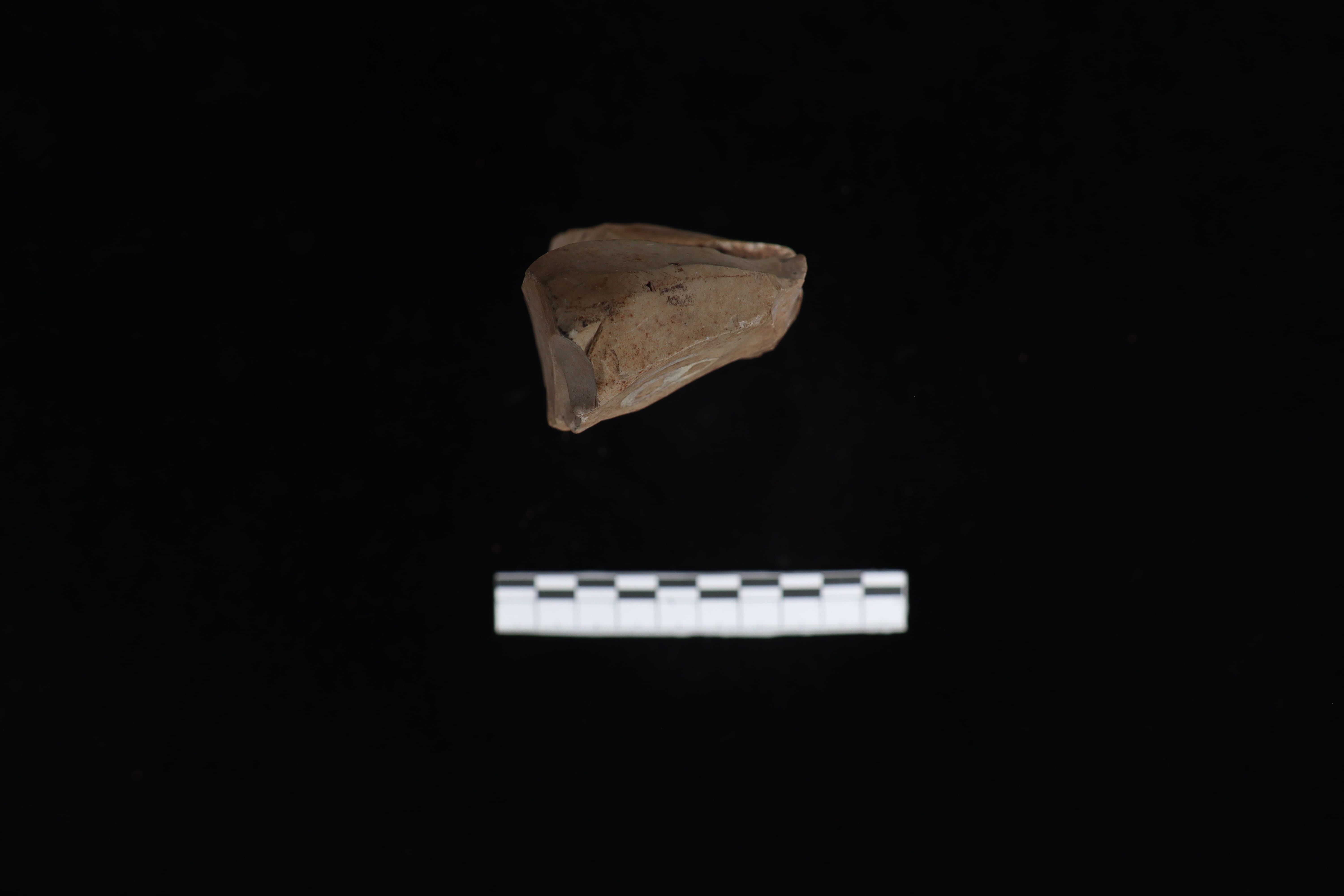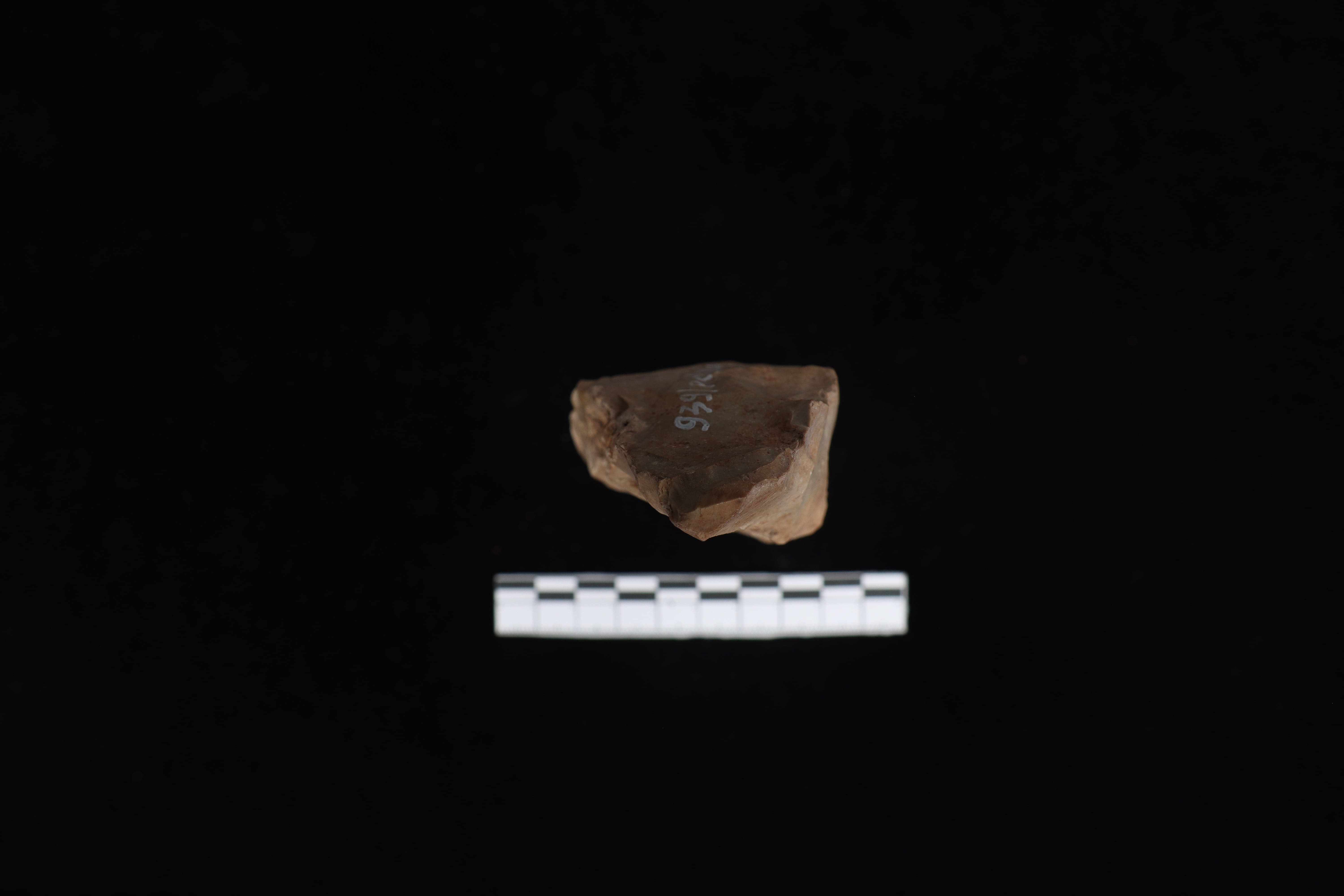 Koleksi ini merupakan Beliung Persegi dengan kondisi koleksi mempunyai korteks sebanyak 12%, Bagian depan terdapat nomor temuan warna putih dan lekukan ke dalam yang memanjang, Bagian Belakang terdapat tulisan warna putih serta bercak korteks, teknik pemangkasan koleksi ini monofasial dan dalam pengerjaannya tidak dihaluskan. Lalu Bagian Proximal/Atas cenderung rata dan Distal/Bawah lancip namun tidak ditemukan retus. Salah satu Lateral/sisi memiliki tekstur yang rata dibanding sisi lainnya.