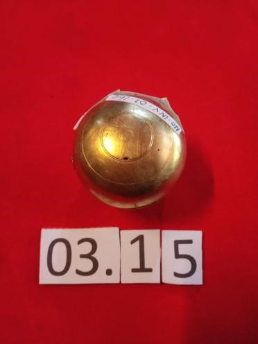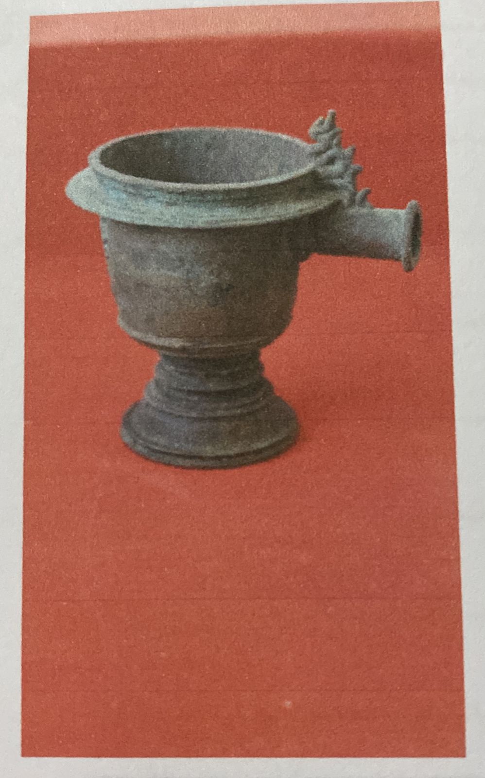 Terbuat dari nikel, bentuk bulat cekung dan berkaki rendah. Pada bagian luar dihiasi motif sulur tanaman, pilin membentuk kaligrafi Arab.