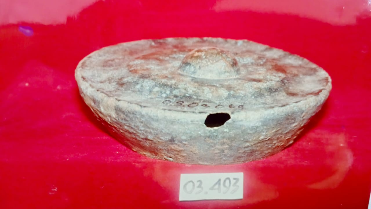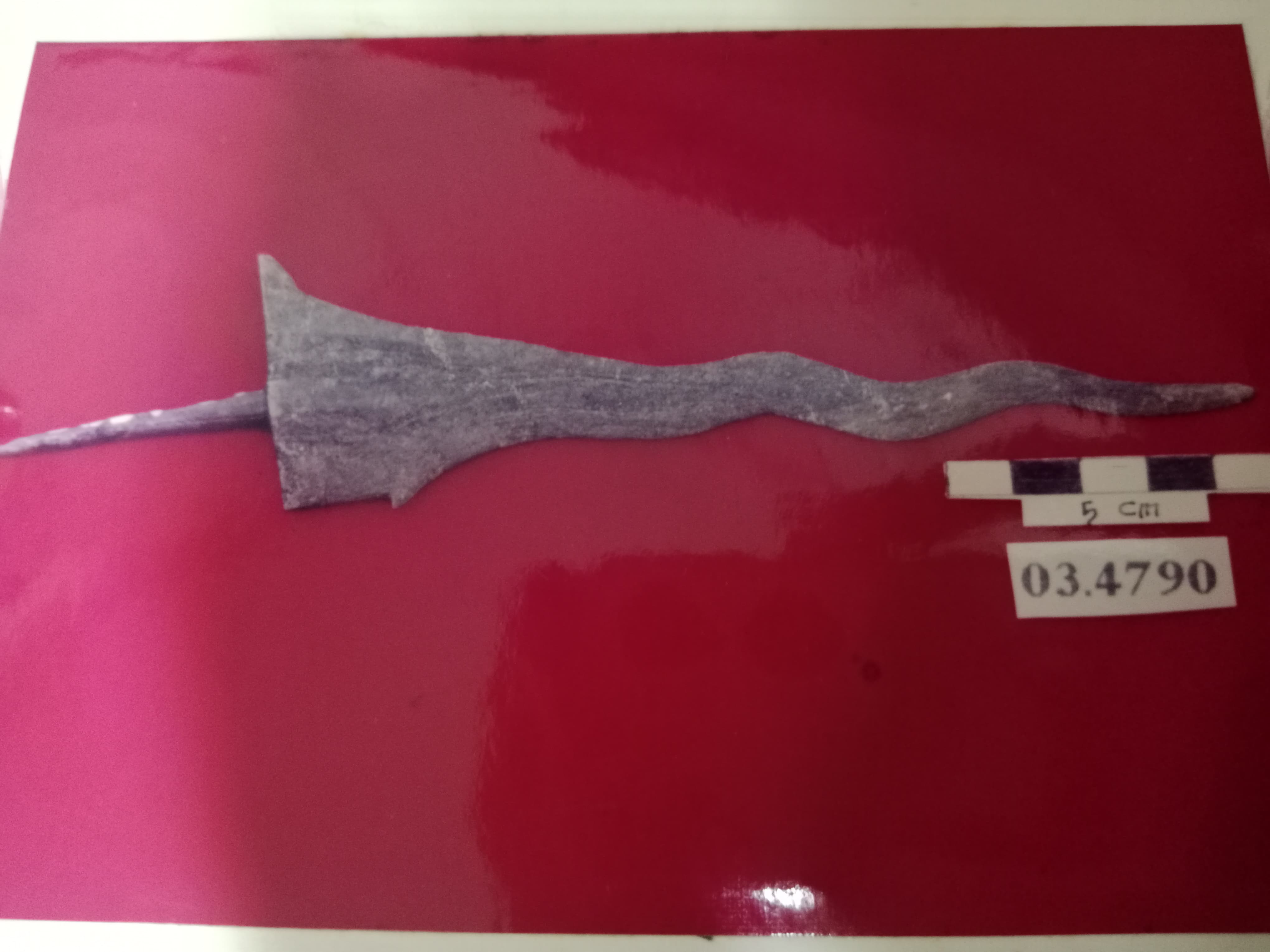 Benda ini terbuat dari bahan dasar perunggu, Warna hitam, kebiruan. Motif hias, berbentuk bulat, pada permukaan ada bidang pemukul.