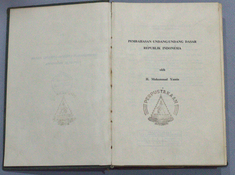Koleksi ini merupakan buku yang berjudul "Pembahasan Undangan Undangan Dasar Republik Indonesia". Ditulis oleh Mr. Muh. Yamin, buku ini memiliki 593 halaman yang terbagi ke dalam 14 bagian. Pada bagian pertama buku ini membahas mengenai perjuangan kemerdekaan Indonesia (1525-1960) yang kemudian menghasilkan karya Undang-Undang Dasar Republik Indonesia. Pada bagian 2, Muh. Yamin membahas mengenai proklamasi kemerdekaan Indonesia. Pada bagian 3, dimuat naskah undangan Undang-Undang Dasar 1945 berserta salinannya dalam bahasa Inggris. Lebih lanjut, bagian 4 kemudian membahas mengenai kodifikasi Indonesia dan kembali berlakunya UUD 1945 dalam membentuk pemerintahan pusat dan daerah. Bagian 5 meninjau hukum terhadap kerangka dan isi UUD 1945. Bagian selanjutnya, bagian 7, menjelaskan ajaran Pancasila sebagai dasar negara. Bagian 8 membahas mengenai dasar yuridis perjuangan kemerdekaan Irian Barat menurut proklamasi, konstitusi dan undang undang nasional. Selanjutnya pada bagian 9, Muh. Yamin memberikan tafsiran UUD 1945. Pada lembar awal dan akhir dapat ditemukan cap perpustakaan "Universitas Negeri Seriwidjaja". Kondisi Kerusakan: Koleksi ini dalam keadaan baik dengan catatan berikut: 1) Sampul koleksi mulai renggang jahitannya. Karena itu, warna sampul yang berwarna hijau mulai pudar. Yang kemudian perlu diperhatikan adalah warna judul buku yang berwarna emas, mulai pudar dan tidak terbaca. 2) Warna kertas di dalam buku sudah mulai kusam. Meskipun demikan, tulisan di dalamnya masih dapat terbaca.