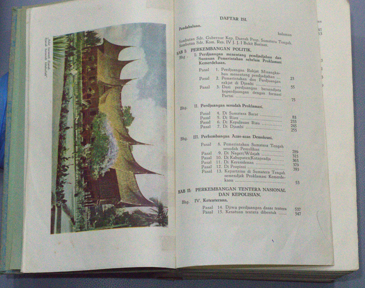 Koleksi ini merupakan buku yang berjudul Republik Indonesia dengan sub judul provinsi Sumatra Tengah. Buku ini diterbitkan oleh kementrian penerangan Republik Indonesia tidak diketahui kapan jelasnya buku ini terbit karena tidak tercantum di halaman depan dan juga dalam sambutan-sambutan. Buku ini memiliki 1.097 halaman yang terbagi kedalam 5 Bab dengan 13 bagian dari keselurhan bab. Diawali oleh pendahuluan, termuat sambutan dari Gubernur Kepulauan Daerah Provinsi Sumatra Tengah dan sambutan dari Komandan Residen IV Jajaran Bukit Barisan. Bab 1 membahas terkait perkembangan politik, bab 2 perkembangan tentara nasioanal dan kepolisian, bab 3 membahas terkait perekonomian, bab 4 membahas pembangunan masyarakat, bab 5 membahas mengenai kebudayaan. Secara umum, buku ini membahas mengenai sejarah dan pembangunan di Sumatra Tengah. Turut dilengkapi dengan foto-foto dan peta yang mendeksripsikan keadaan sosial masyarakat dan budaya di Sumatra Tengah. Buku ini memiliki sampul berwarna biru dengan tekstur yang keras. Bahan sampul tersebut terbuat dari kain. Kondisi dari buku tersebut utuh namum memiliki beberapa kerusakan, pada bagian sampul terdapat kerusakan dengan pudarnya warna sampul. Kepudaran tersebut terdapa pada sampul depan, sampul samping dan sampul bagian belakang. Kondisi kepudaran yang terparah terdapat pada sampul depan dan samping. Terdapat pula lubang robek pada sampul samping, dan juga lem dari sampul ke kertas buku sudah lepas dan tidak rekat lagi. Warna dari kertas buku juga sudah kusam. Di tepi kertas buku terdapat noda-noda berwarna coklat. Terdapt juga beberapa robekan di kertas buku.