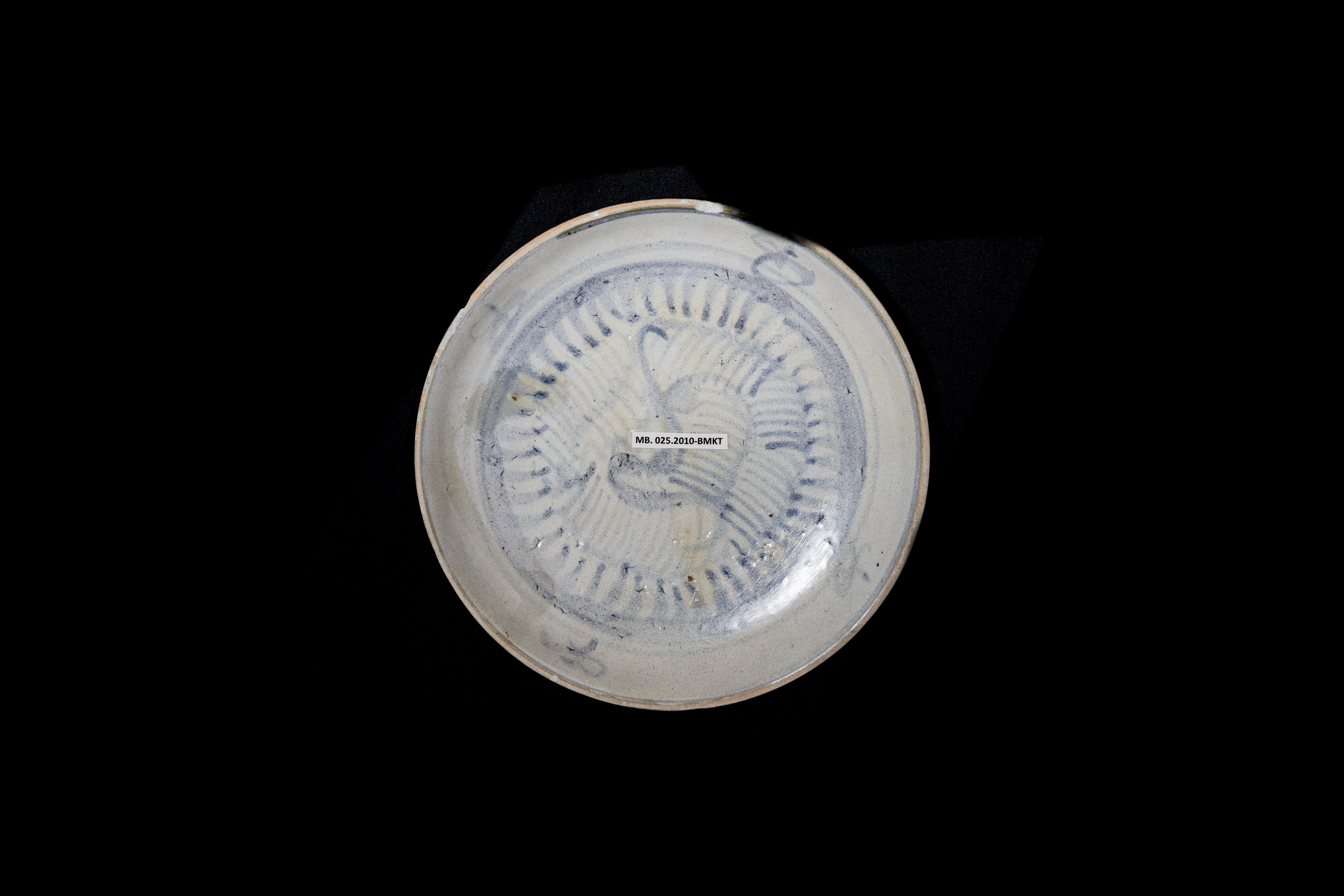 Keramik berbentuk buli-buli dengan motif daun yang bersusun dengan rangkaian bunga berwarna putih biru kehitaman. Motif nampak pada pundak serta badan keramik yang dihiasi sebuah garis yang melingkar.