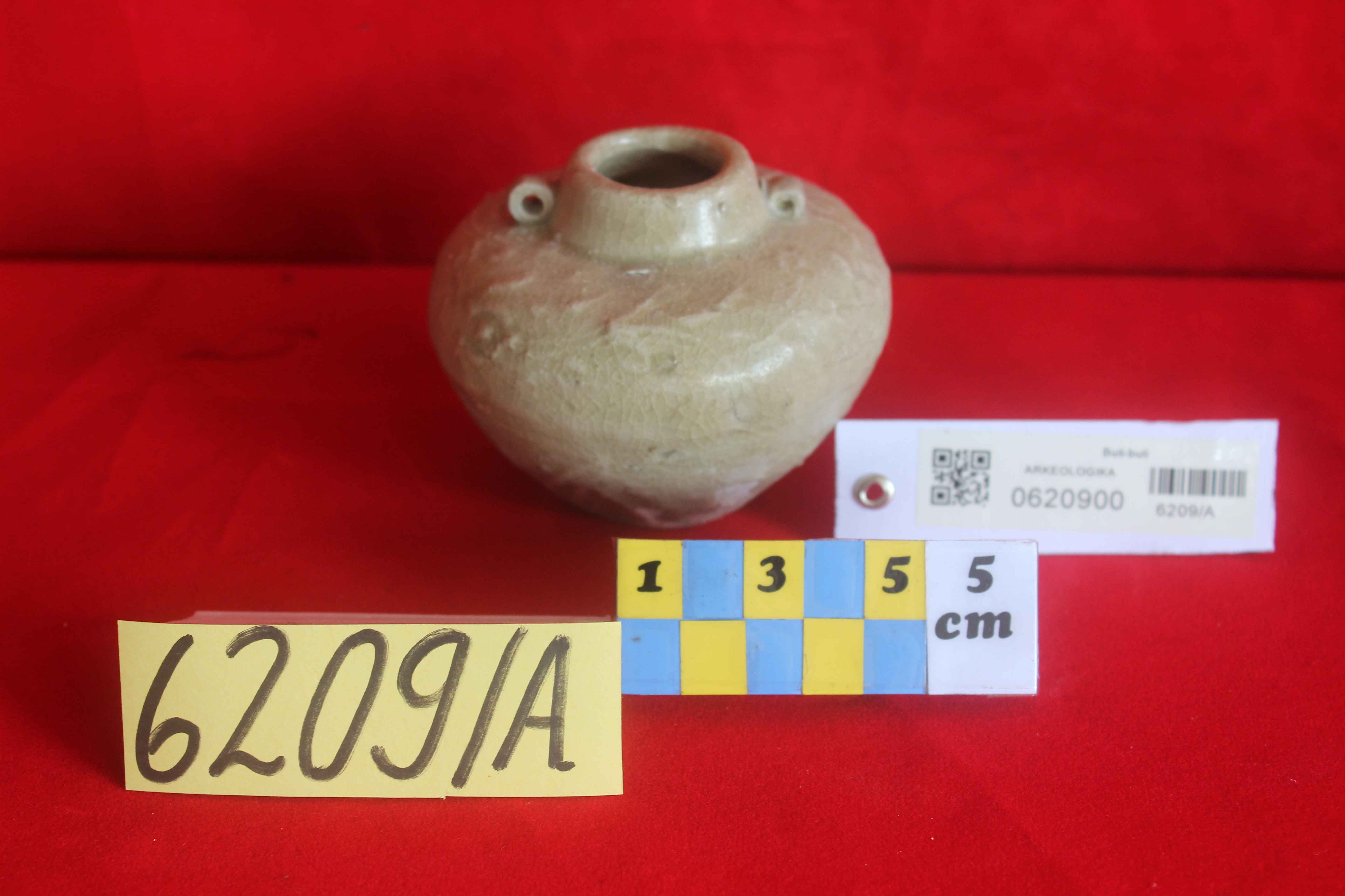 Terbuat dari tanah liat, bentuk bulat mengecil bagian bawah, glasir warna abu-abu Pada pundak terdapat dua buah telinga vertikal, mulut rata, bibir membalik ke luar. Hiasan motif bunga teratai, dasar tanpa glasir. Cina, Dinasti Sung, abad 10-13 M. Hasil temuan di Laut Pulau Maya, Kabupaten Ketapang.