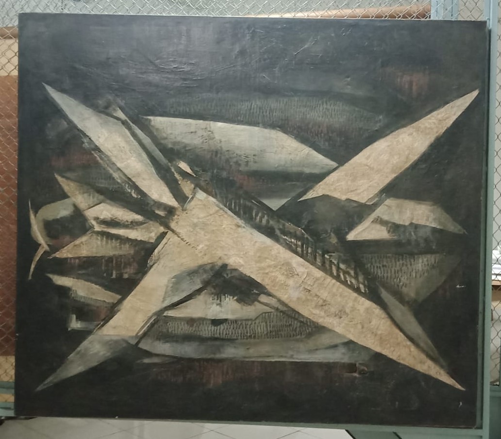 Sebuah buli-buli keramik diglasir warna putih kebiruan, leher tegak, mulut kecil, pantat datar tanpa glasir, dihias dengan ornamen warna biru dengan motif garis-garis melingkar dan tumbuh-tumbuhan. Fungsi sebagai wadah.