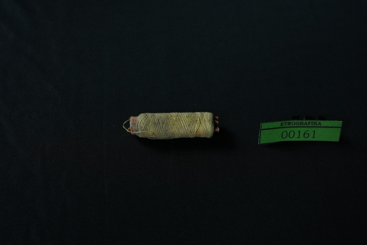 Sebuah buli-buli keramik, diglasur mengkilat, warna dasar putih susu. Bentuk bulat, mulut kecil, pantat rata, dan pecah seribu. Pada bagian pundak terdapat hiasan semacam daun (2 buah) berwarna biru. Fungsi sebagai wadah.