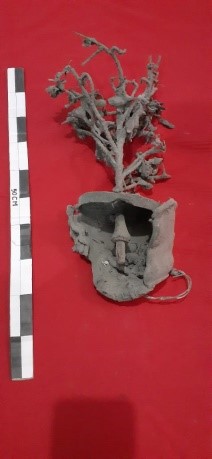Hiasan meja berupa bunga dan pot plastik berwarna abu-abu yang meleleh karena terkena awan panas dalam kondisi terawat utuh bagian pot tinggal separo bagian bawah terdapat kawat.